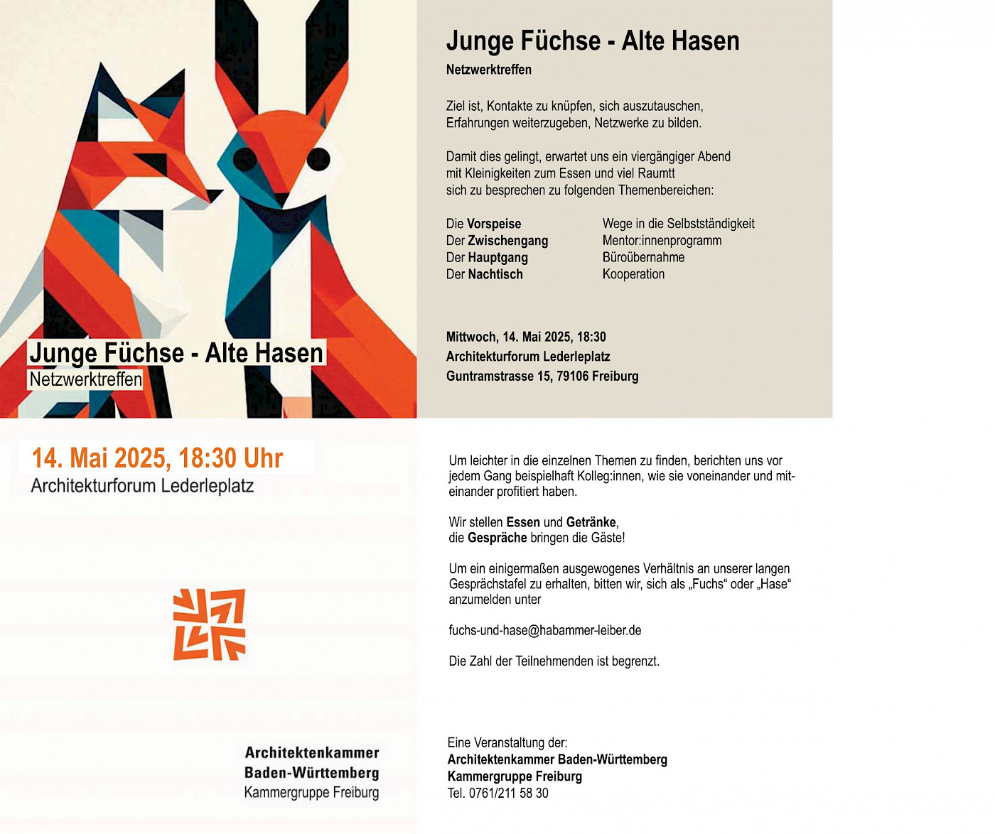 Innerhalb des durch die Architektenkammer initierten Netzwerktreffens Junge Füchse - Alte Hasen treffen Ane Nieschling und Michael Gies zum Gespräch aufeinander. Im Rahmen der Vorspeise werden sich die Beiden über "Wege in die Selbstständigkeit" austauschen.