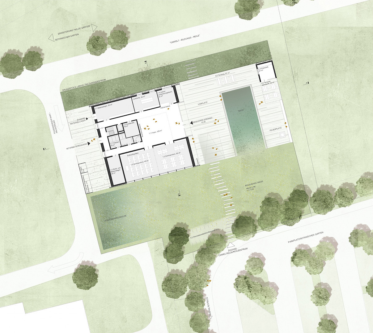 Mit der Gestaltung von Gebäude und Freiraum soll ein attraktiver, einladender, einprägsamer und unverwechselbarer Ort geschaffen werden, der Naturerfahrungen unterstützt und an dem die vielfältigen Facetten intelligenter Nutzung natürlicher Ressourcen durch den Menschen zum Ausdruck gebracht werden können.