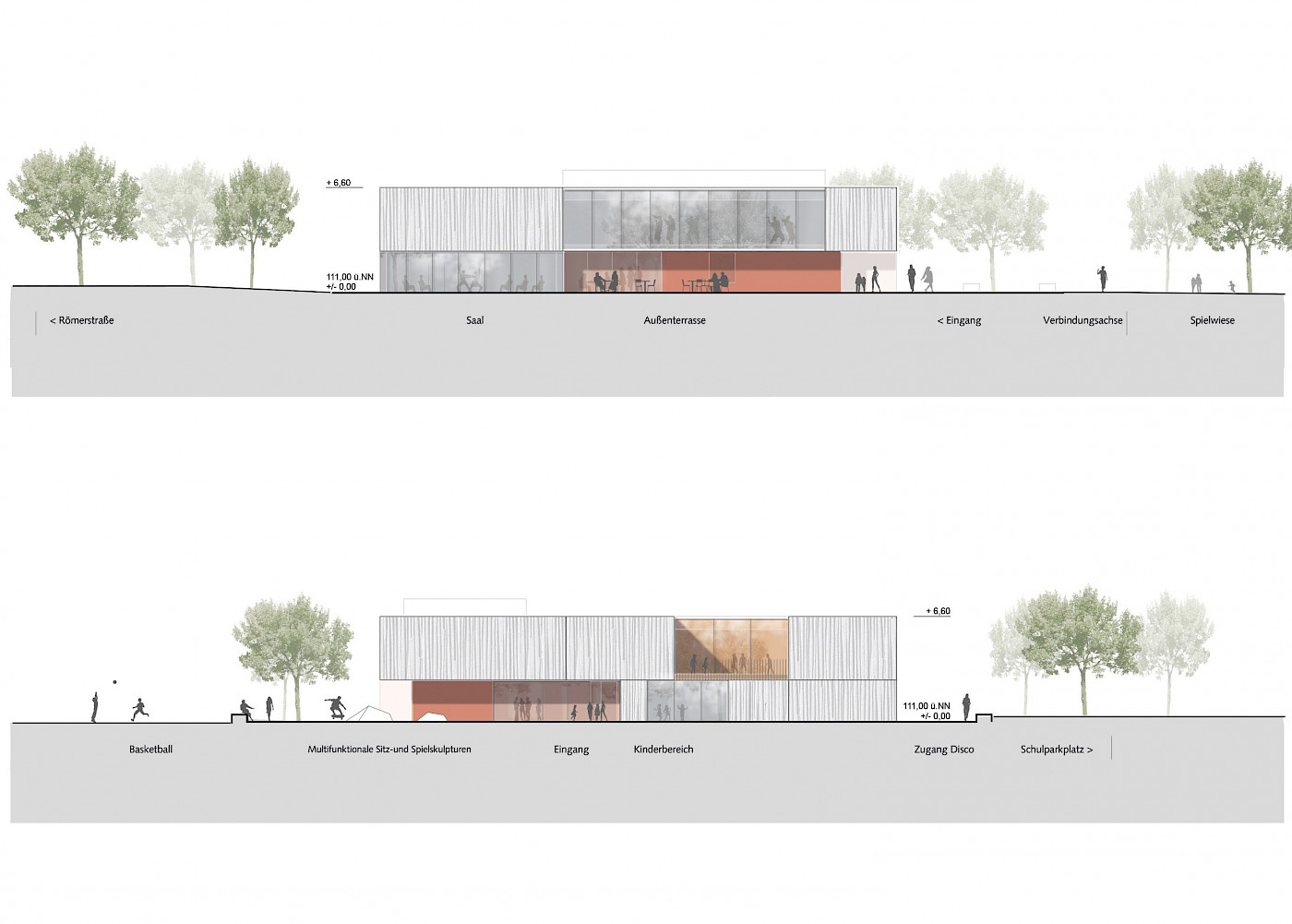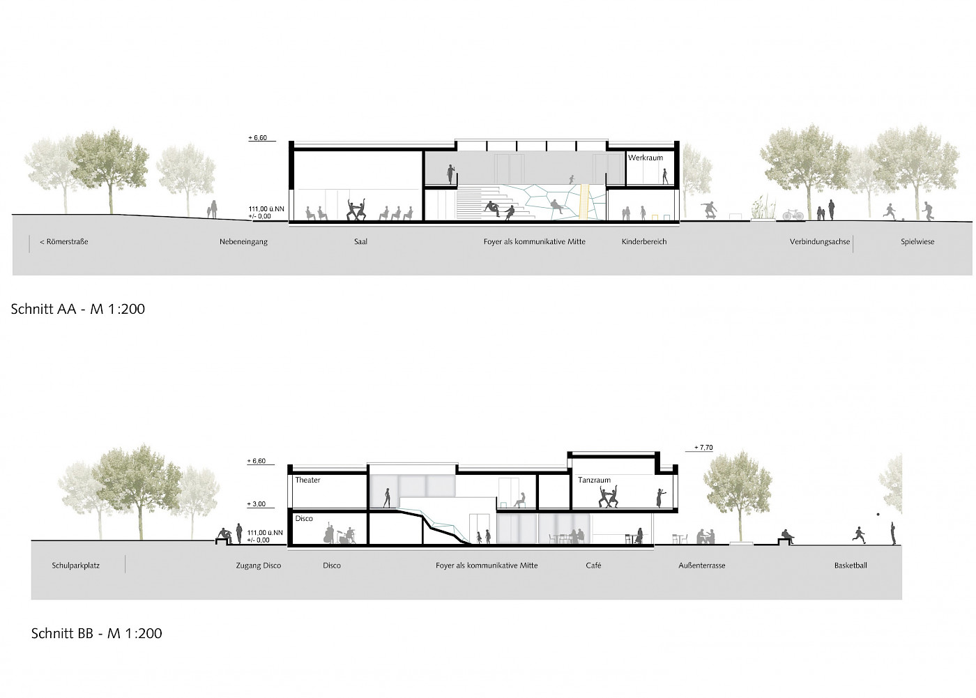 Das geforderte Raumangebot mit seinen verschiedenen Nutzungen, Raumgrößen und -höhen wird auf zwei Geschossebenen auf quadratischem Grundriss untergebracht.