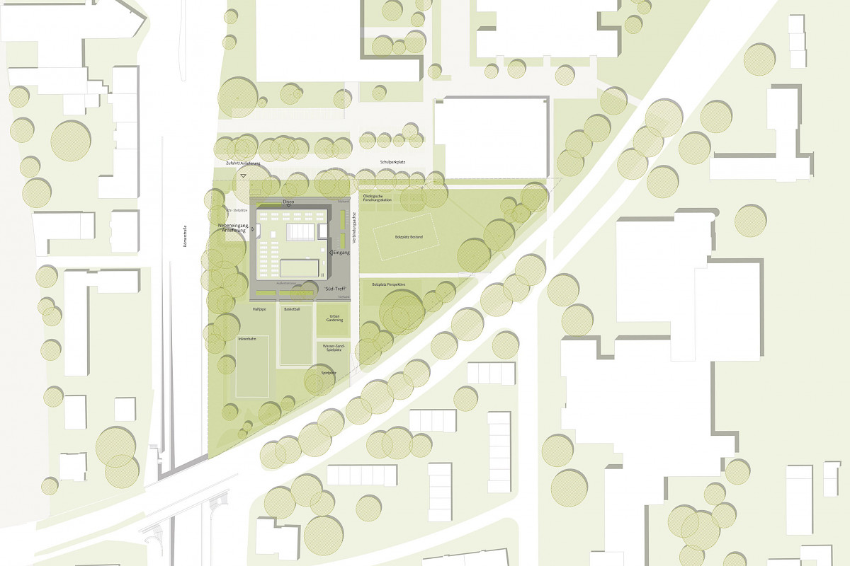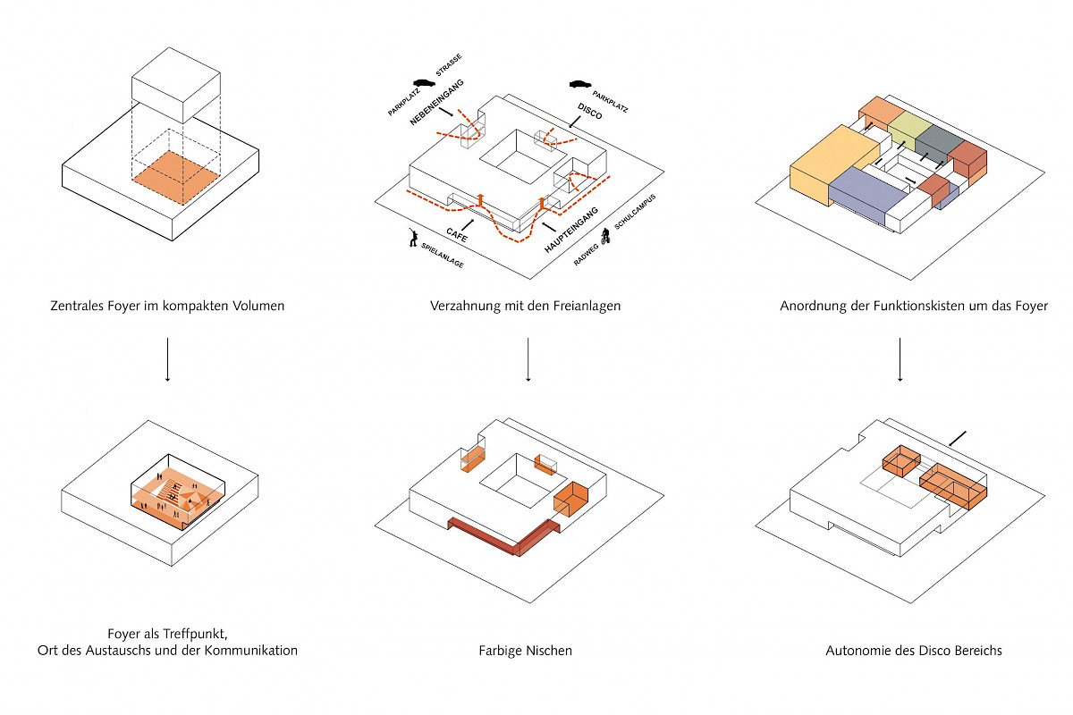 In den einfachen Baukörper sind an wenigen Stellen gezielt Nischen eingekerbt, deren farbige Gestaltung Eingänge und Terrassen markiert und auf den Innenraum verweist. Die verschiedenen Funktionsbereiche legen sich um ein Atrium, das Tageslicht über eine Dachverglasung bekommt und vielfältige Blickbeziehungen zwischen den einzelnen Bereichen und den verschiedenen Ebenen bietet.