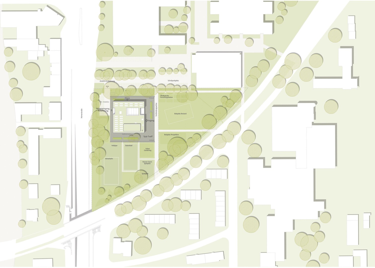 In den einfachen Baukörper sind an wenigen Stellen gezielt Nischen eingekerbt, deren farbige Gestaltung Eingänge und Terrassen markiert und auf den Innenraum verweist. Die verschiedenen Funktionsbereiche legen sich um ein Atrium, das Tageslicht über eine Dachverglasung bekommt und vielfältige Blickbeziehungen zwischen den einzelnen Bereichen und den verschiedenen Ebenen bietet.