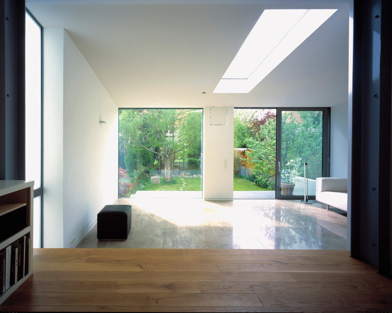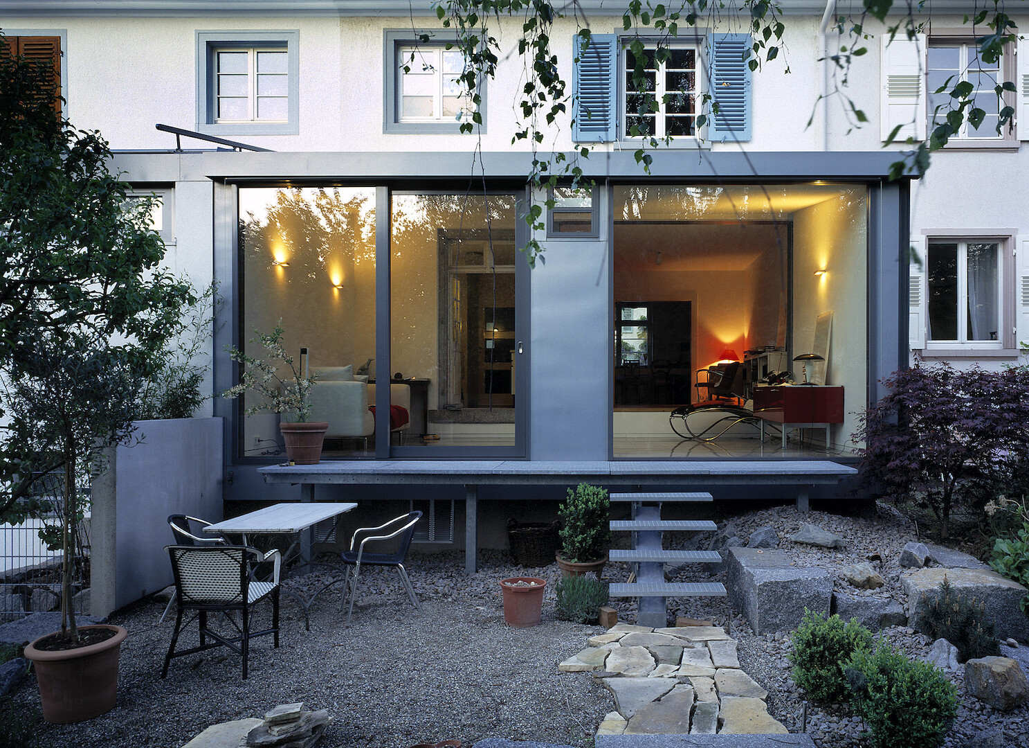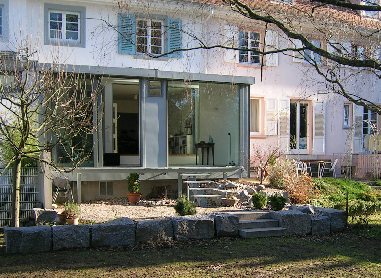 Built in the 1920s, this rather traditional residential building has been given an extension establishing elegant new areas. Parts of the former façade have been removed in order to give the existing structure new access into the garden. Due to changes in floor level and materiality, as well as the creation of a “light gap”, the transition from old to new remains clearly visible.