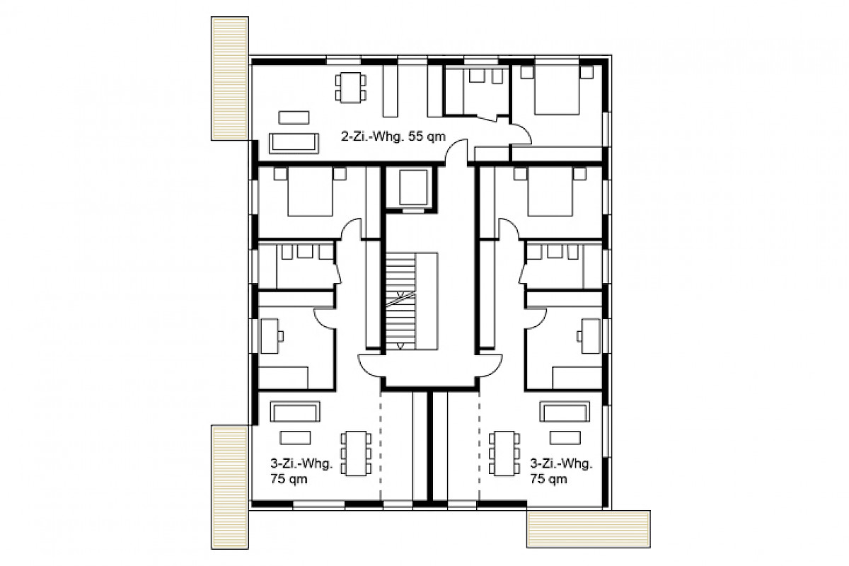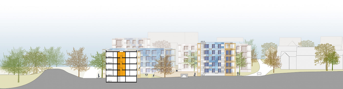 Kostengünstiger und CO2-neutraler Mietwohnungsbau zur Verdichtung eines Quartiers an der Ulmer Peripherie war gefragt. Unterschiedliche Haustypen wurden vorgeschlagen, so dass insgesamt eine Angebotsvariabilität mit verschiedenen Wohnungsgrößen und -zuschnitten entsteht, die variierenden Lebenssituationen und Wohnpräferenzen Rechnung tragen kann. PV wird auf Dächern und in einem vorgegebenen Raster auf gut besonnten Fassadenflächen platziert.