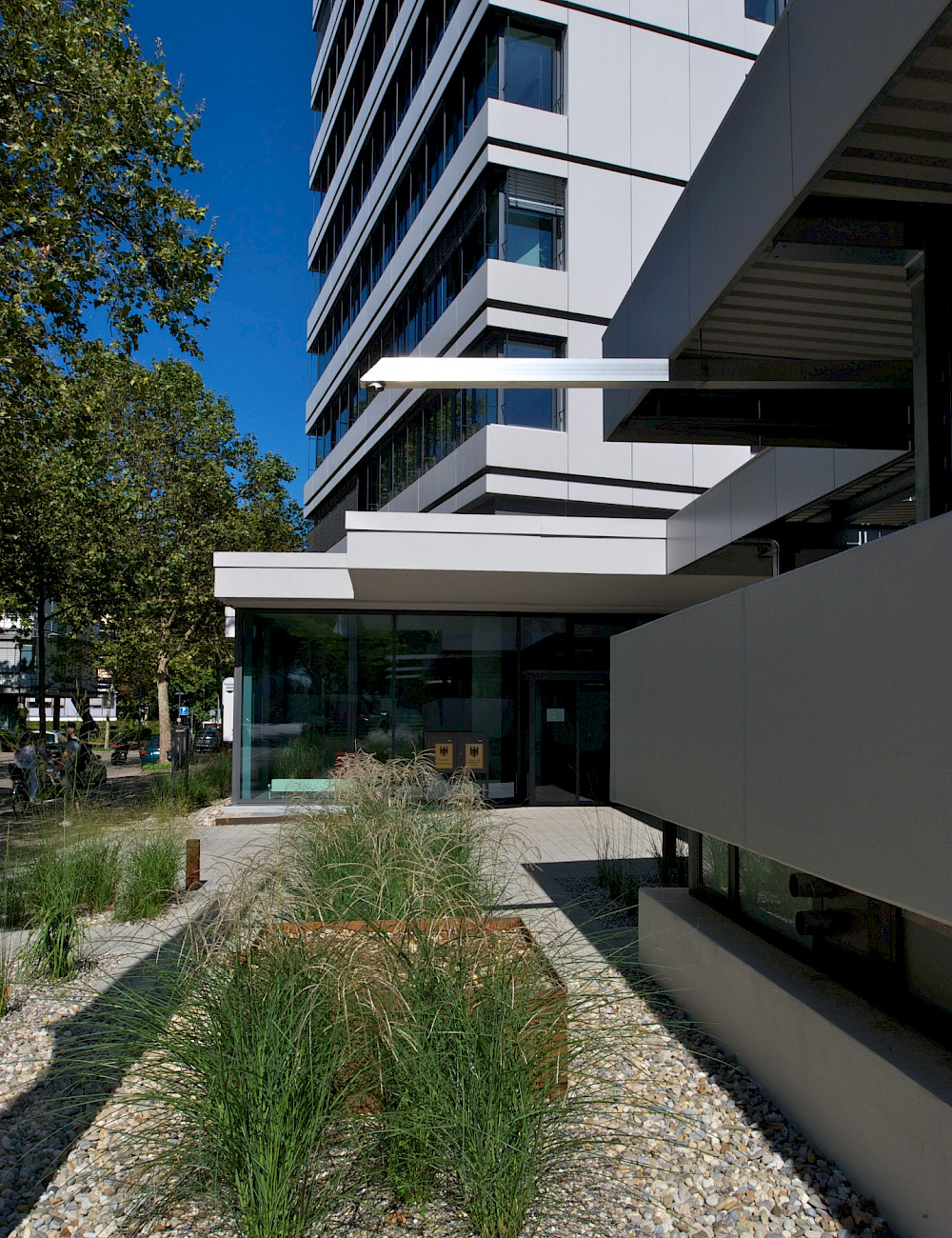Minimising the energy loss and improving the day light situation inside the building have been the main goals in redevelopment of this 1960s office tower. We kept its original appearance, though enhanced by using fibre-reinforced concrete for its new façade. Furthermore, a new solar roof has been placed over the existing car park.