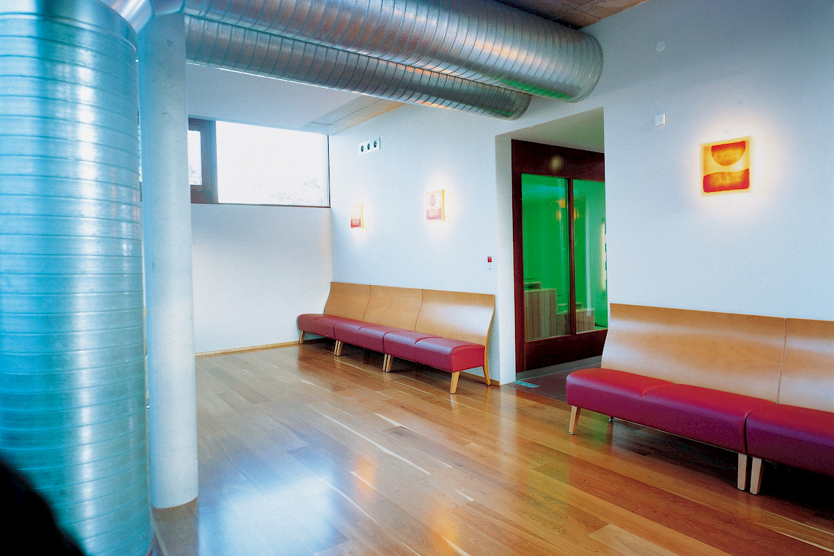 Il s’agit ici de l’agrandissement d’un centre de mise en forme situé dans une zone industrielle. Un nouveau corps de bâtiment abritant des vestiaires et des saunas vient achever un ensemble résultant d´agrandissements successifs au fil des années. La nouvelle aile s’inspire des cabanes de plages et d’exemples historiques de l’architecture de bains. Elle présente une structure de façade légère constituée de panneaux, de verre et de tissu. Les vues, les perspectives, le rayonnement solaire et la lumière sont filtrés selon l´heure et le temps du jour. La salle de repos et la terrasse offrent de magnifiques vues sur la Forêt-Noire.