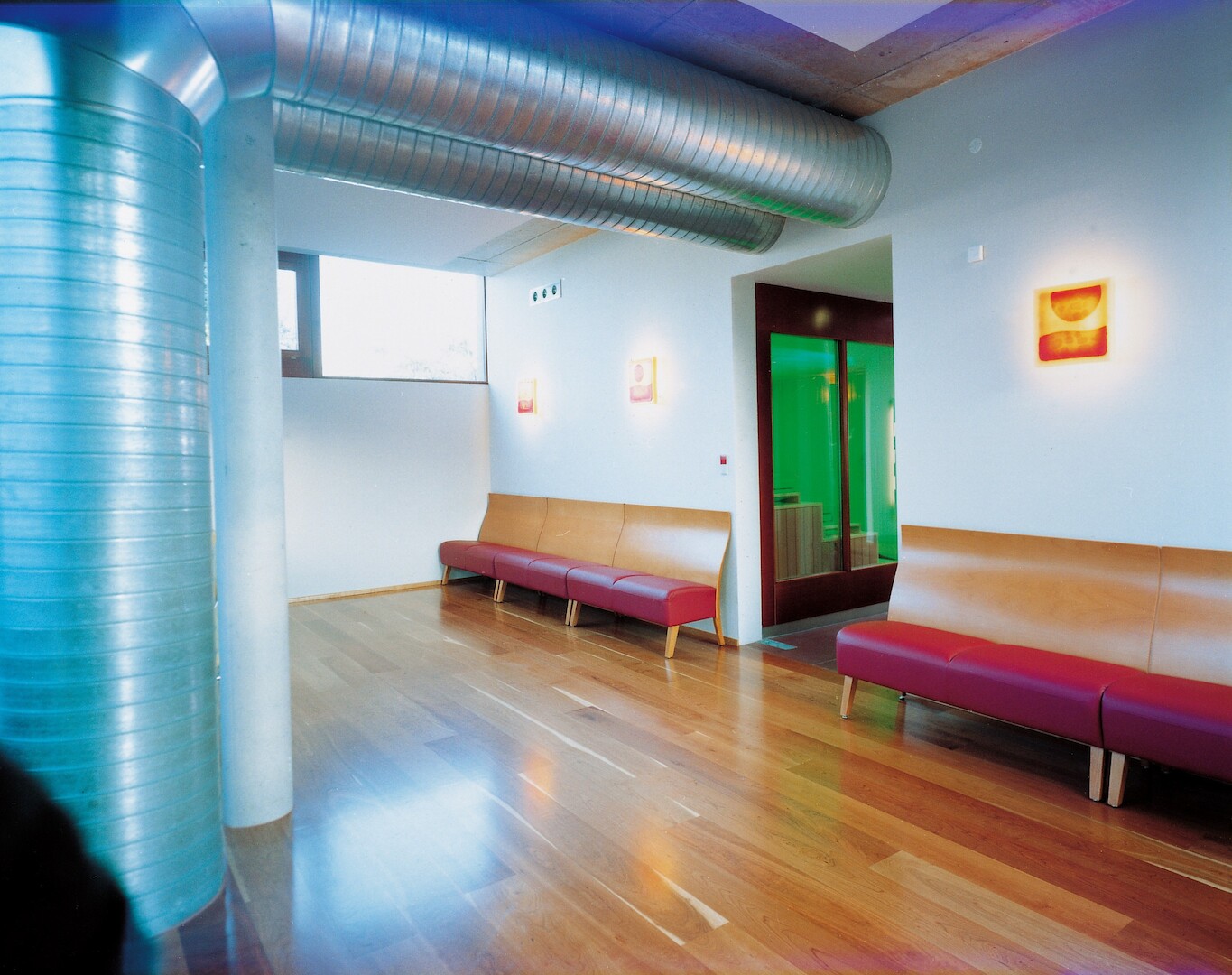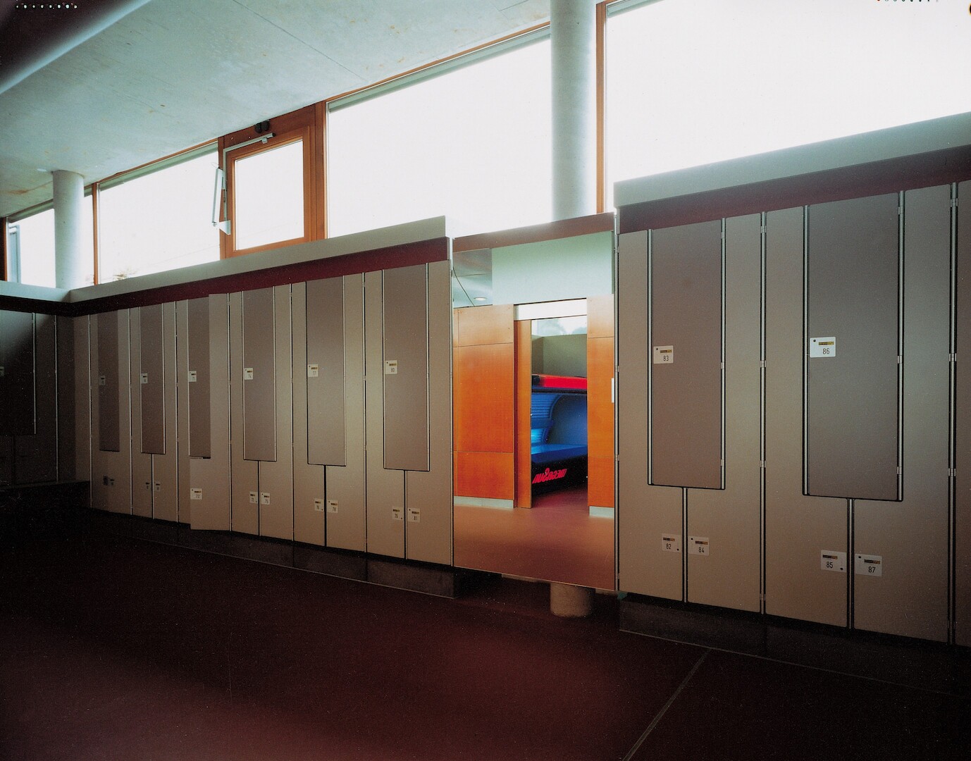 Il s’agit ici de l’agrandissement d’un centre de mise en forme situé dans une zone industrielle. Un nouveau corps de bâtiment abritant des vestiaires et des saunas vient achever un ensemble résultant d´agrandissements successifs au fil des années. La nouvelle aile s’inspire des cabanes de plages et d’exemples historiques de l’architecture de bains. Elle présente une structure de façade légère constituée de panneaux, de verre et de tissu. Les vues, les perspectives, le rayonnement solaire et la lumière sont filtrés selon l´heure et le temps du jour. La salle de repos et la terrasse offrent de magnifiques vues sur la Forêt-Noire.
