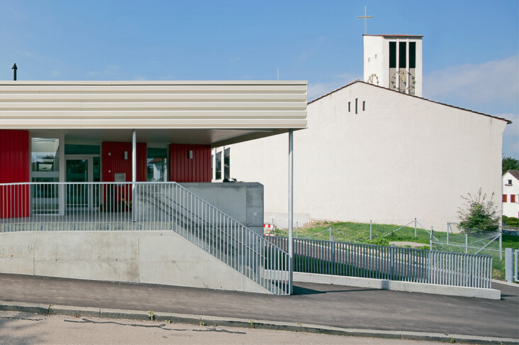 La nouvelle construction se déploie le long des courbes de niveau sur deux étages, qui offrent à chaque fois un rapport de plain-pied avec le terrain. La disposition sur deux niveaux préserve au maximum les espaces extérieurs, qui sont structurés par le bâtiment.