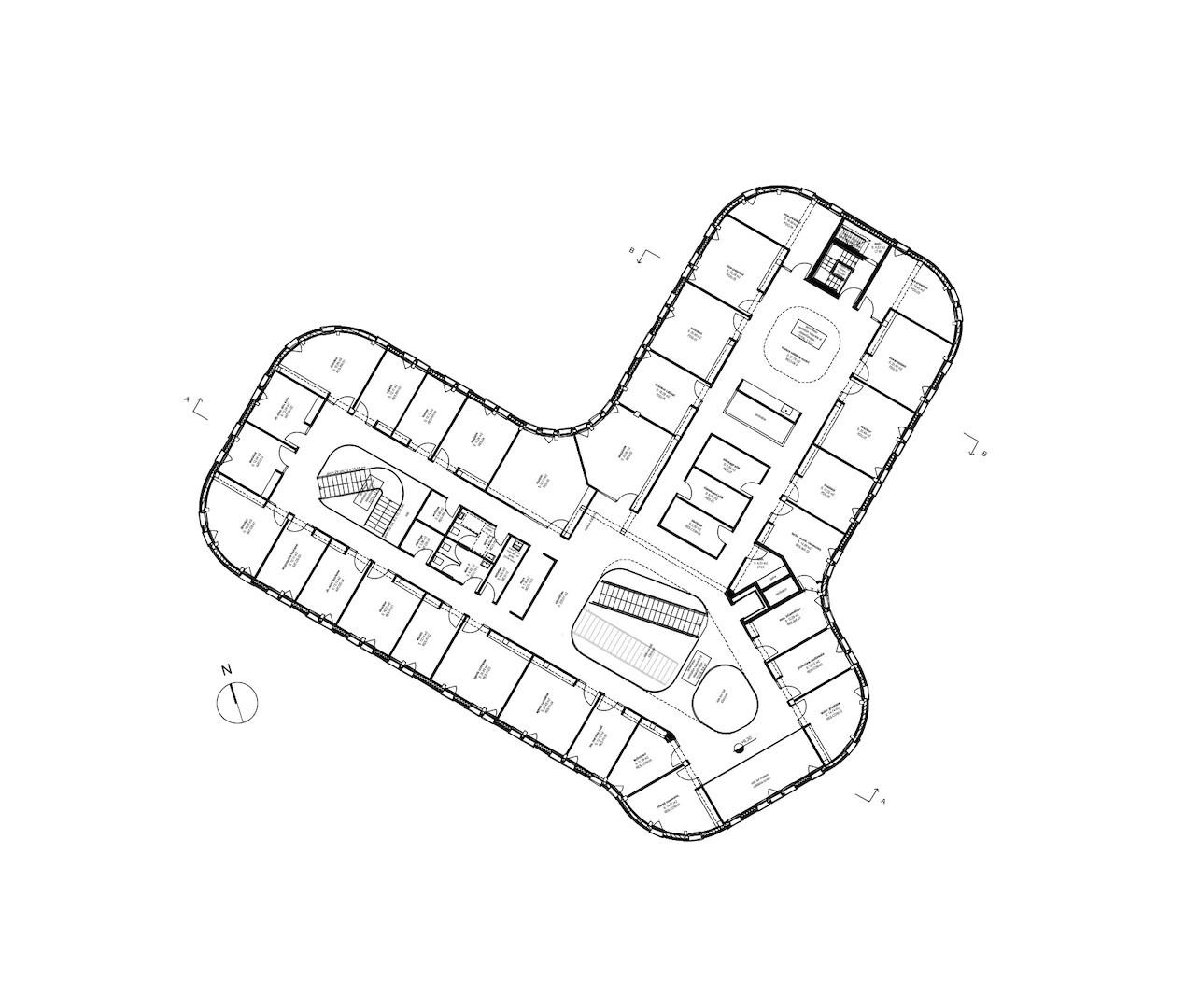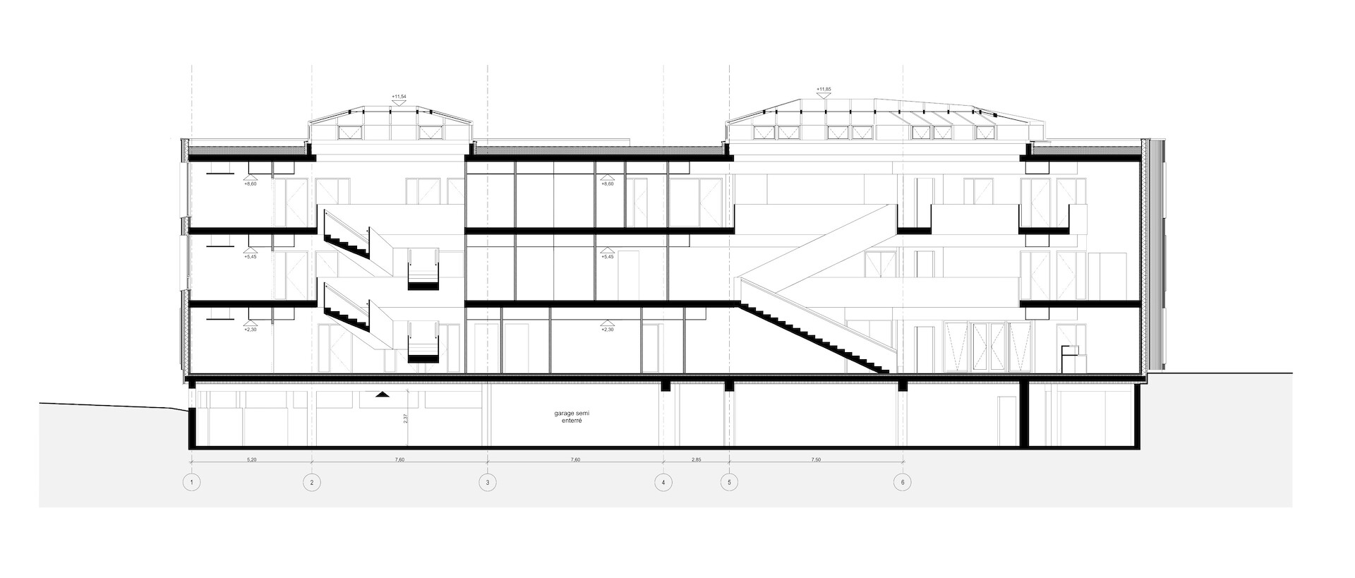 Le parti architectural de l’Hôtel de communauté de la COCOPAQ est celui d’un tri branche compact aux contours arrondis. Cette forme s’accroche d’une manière sensible aux éléments structurants du site et sa fluidité lui permet d’éviter toute frontalité écrasante, adossement ou effet de barrière. On y accède par son centre, dans un atrium généreux et baigné de lumière naturelle qui articule les fonctions d’accueil, d’attente et de logistique, distribue l’ensemble des circulations et abrite des espaces fluides et aérés, dédiés à la détente et aux rencontres informelles. La salle des conseils est littéralement traversée par le domaine public et constitue ainsi, à la manière d’une lanterne, un signal lisible à partir des voiries.