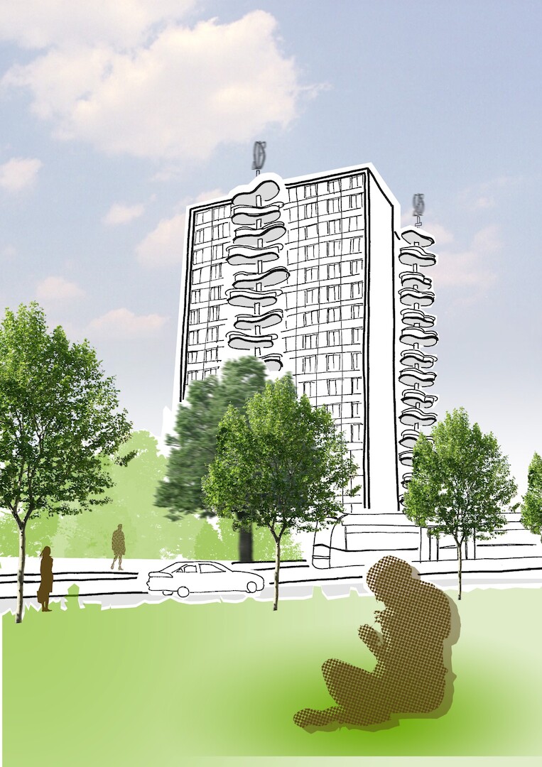 Les principaux avantages du bâtiment existant sont la rationalité et de sa structure et de ses plans, leur versatilité, ainsi que les vues extraordinaires sur le paysage qu’il offre. Ces avantages sont conservés et accentués de manière ciblée. Peu de modifications structurelles sont apportées, les logements sont ponctuellement adaptés aux personnes à mobilité réduite et la maintenance du bâtiment est simplifiée. Le concept d’optimisation énergétique se base principalement sur la désolidarisation des balcons qui rend possible une isolation performante et continue en profitant du volume compact de l’existant et en évitant des détails compliqués et couteux. Le standard passif peut ainsi être atteint de manière rationnelle.