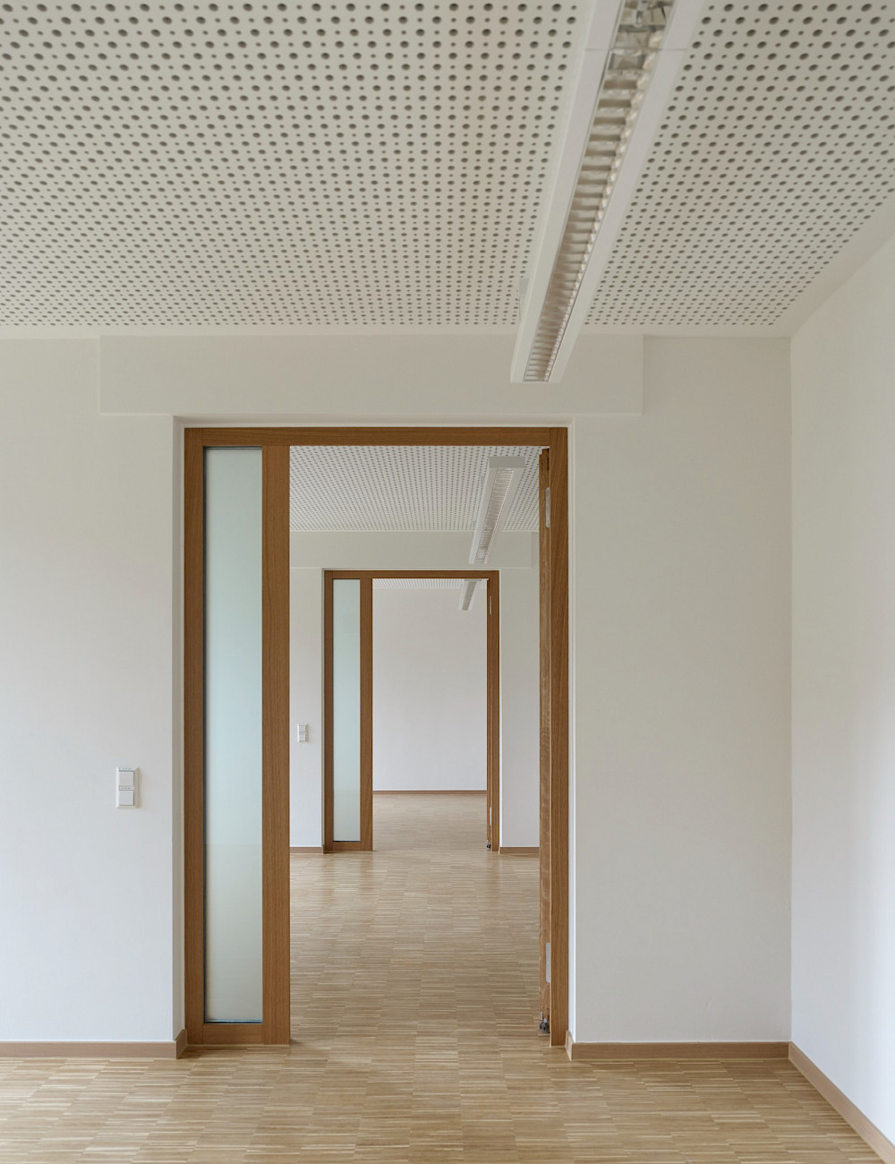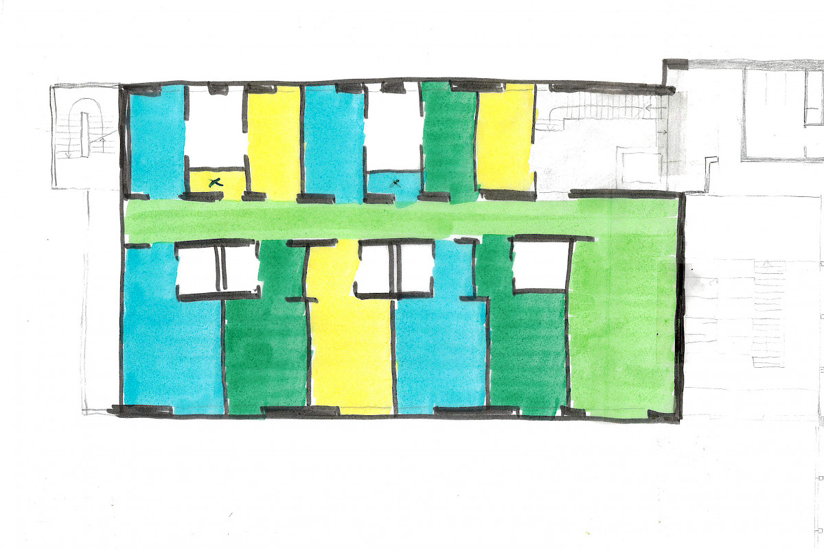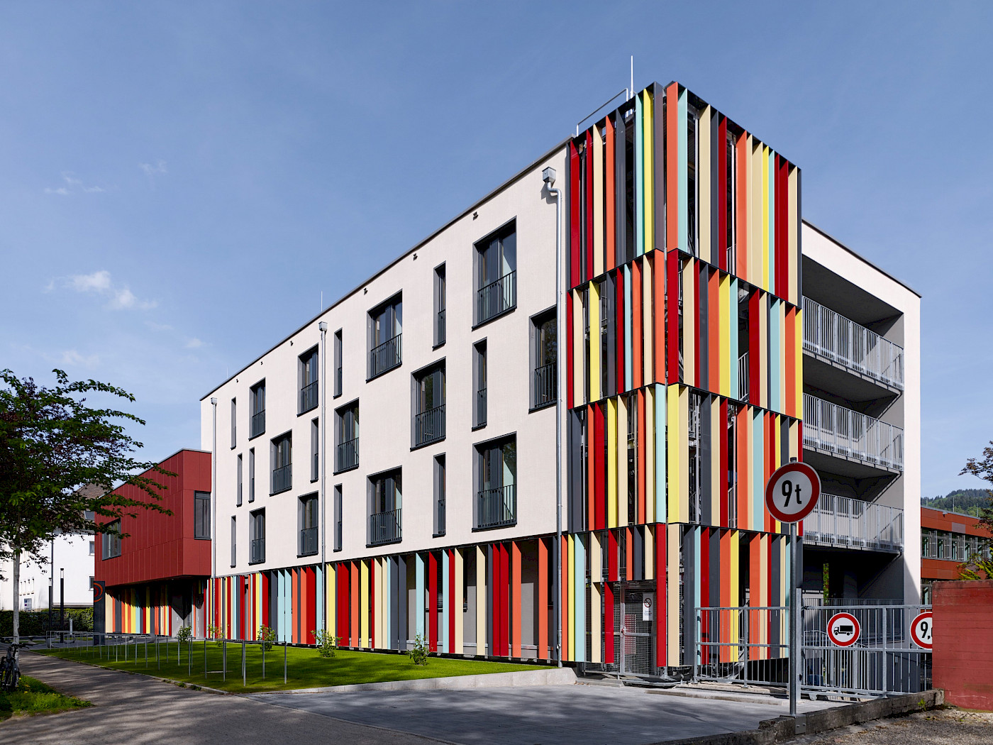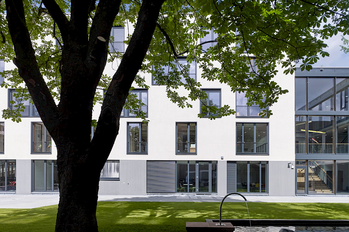 Un hall d’entrée généreux lie foyer d’élèves, école et extension. Ce sont les maniements contrôlés de la lumière naturelle qui donnent aux intérieurs leurs expressivités spécifiques: Le hall est accolé à la cour par une façade vitrée, la chapelle est façonnée par la lumière indirecte et filtrée, les salles de classe reçoivent leur luminosité de type atelier par des fenêtres de tous les côtés. Dans la façade, le nouveau bâtiment se distingue volontairement de ses voisins résidentiels par la colorisation vive du rez-de-chaussée.