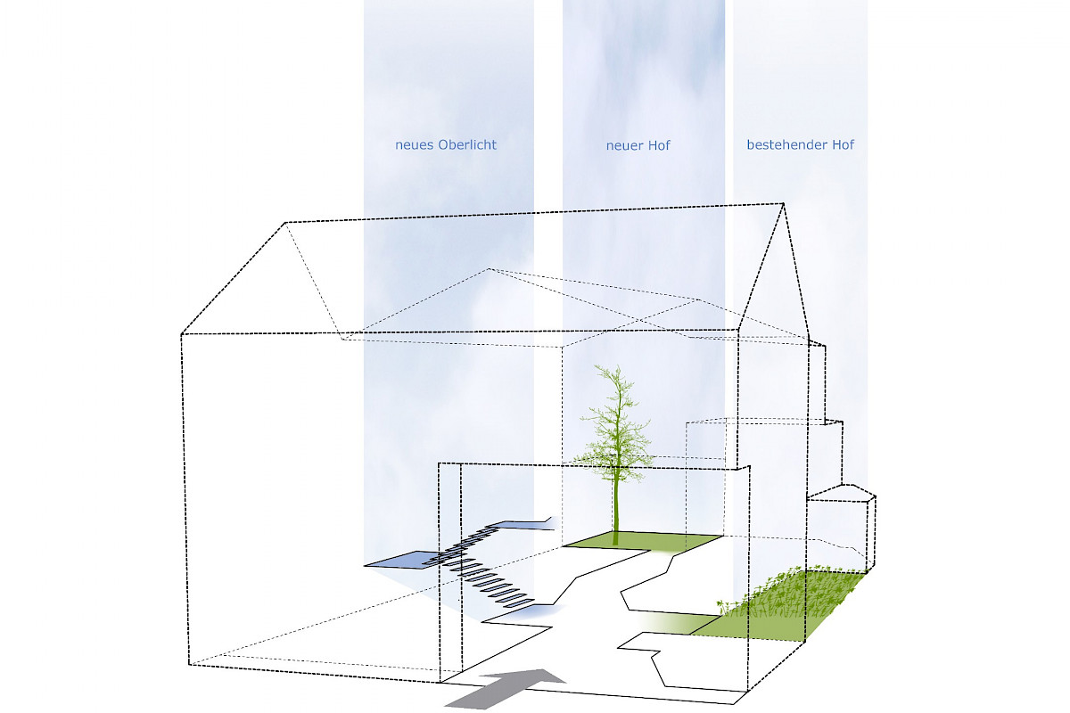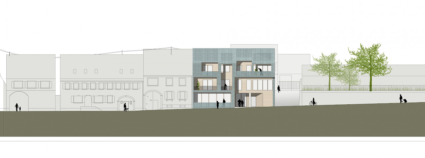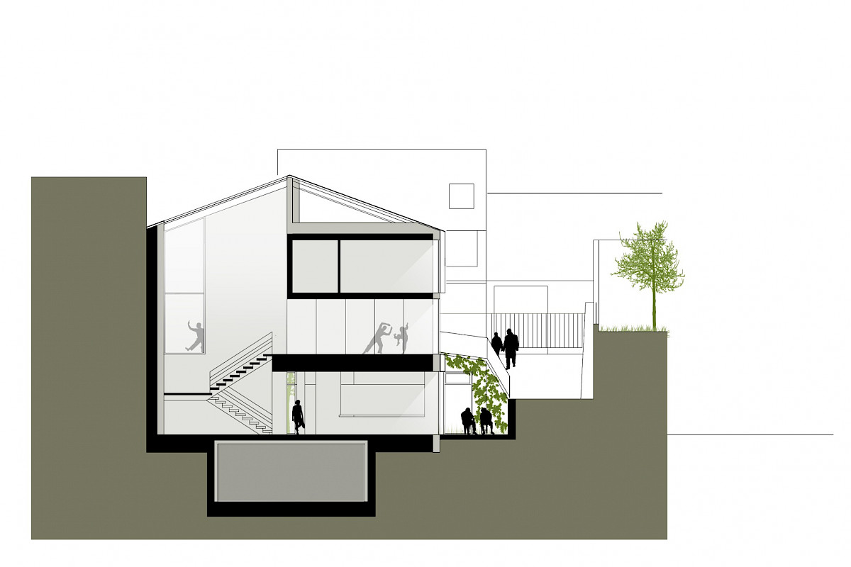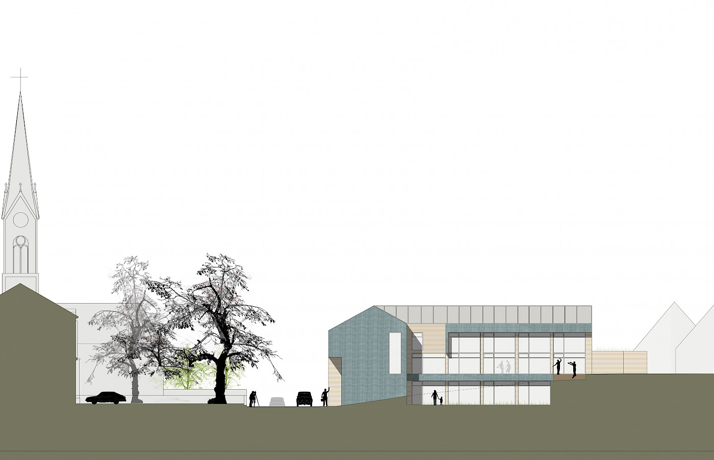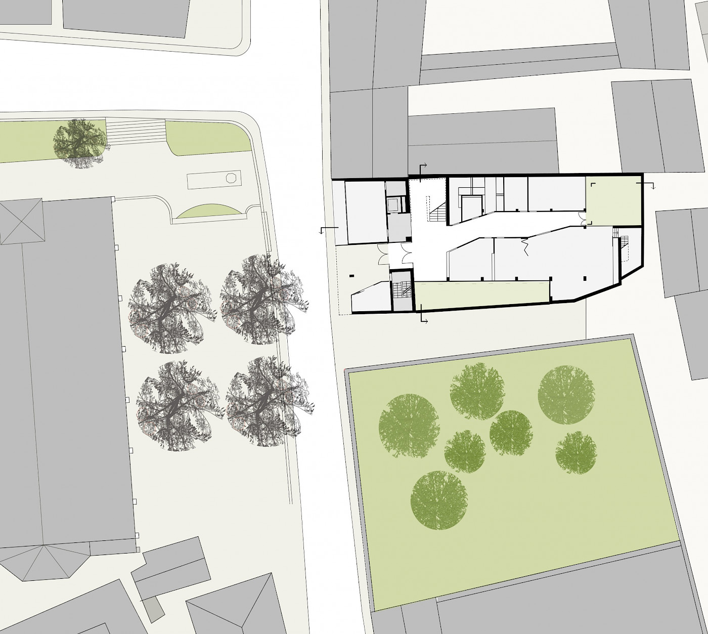 Deux idées directives ont menées notre réflexion : La reconfiguration de la nouvelle enveloppe de la maison communautaire doit à la fois s’intégrer dans le langage architectural du contexte urbain avoisinant et s’affirmer dans la ville et, la lumière et la ventilation naturelle doivent pénétrer les profondeurs du bâtiment. Les percées vers l’extérieur nous sont très importantes tout comme les qualités fonctionnelles et sensibles de la lumière naturelle. Le parti pris n’est pas celui du tabula rasa mais au contraire, de travailler l’existant sur des points précis, judicieux et nécessaires pour engendrer une amélioration avec des moyens efficaces disponibles. Sur le plan énergétique, en plus du scénario basique d’une isolation performante et du traitement des ponts thermiques, nous proposons la mise en place d’une façade ventilée, de l’installation de panneaux photovoltaïques sur la pente Sud de la toiture pour la production d’électricité ainsi que des capteurs héliothermiques pour mettre en place un système de chauffage solaire à air.