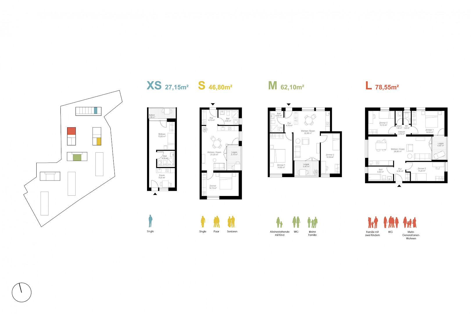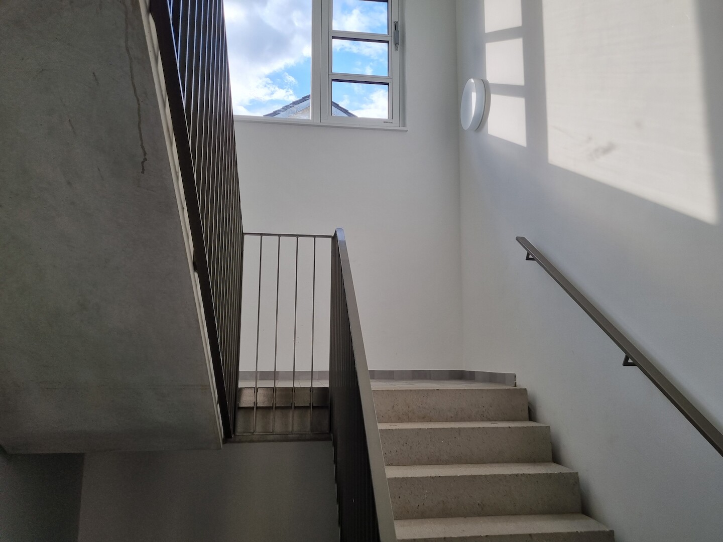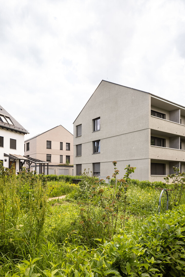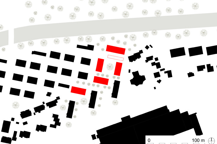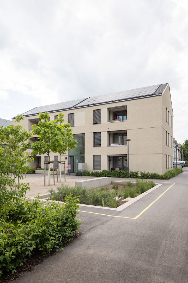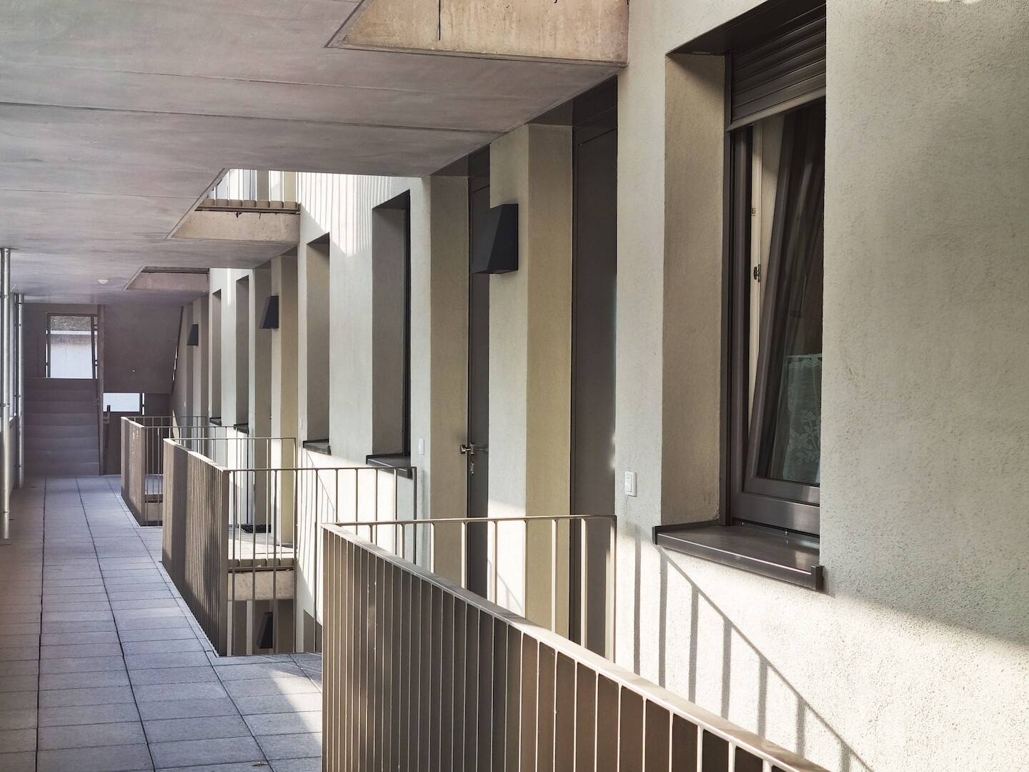 Cinq bâtiments neufs accueillant des logements sociaux se glissent dans le contexte des années 1950 et reprennent les alignements retrouvés dans le tissu existant tout en formant une placette pour la rencontre des riverains.