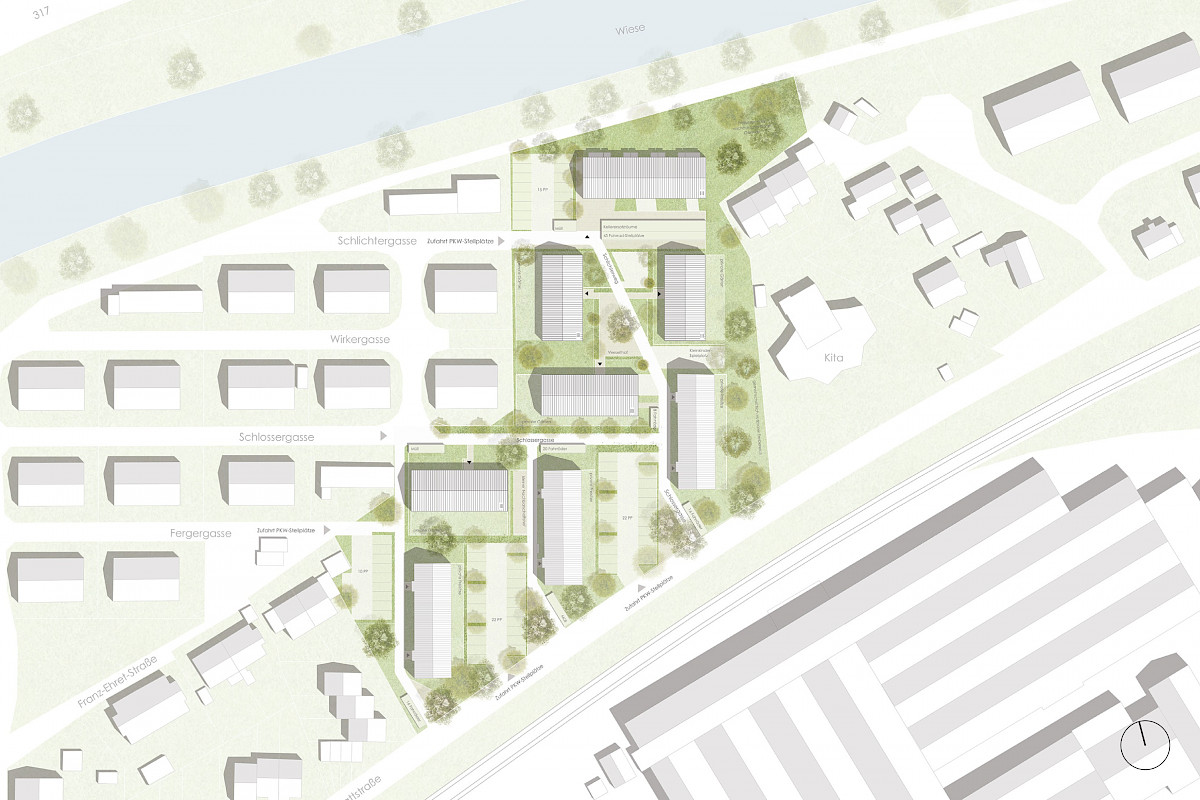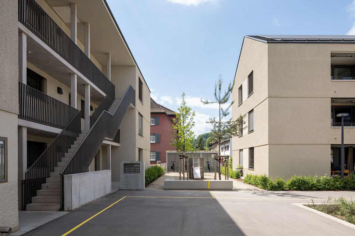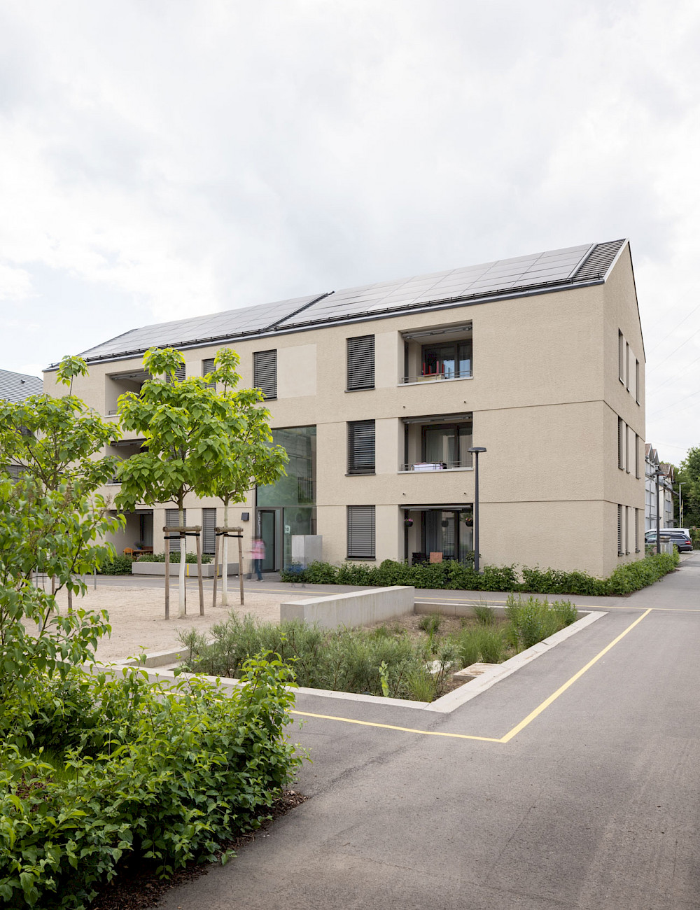 Cinq bâtiments neufs accueillant des logements sociaux se glissent dans le contexte des années 1950 et reprennent les alignements retrouvés dans le tissu existant tout en formant une placette pour la rencontre des riverains.