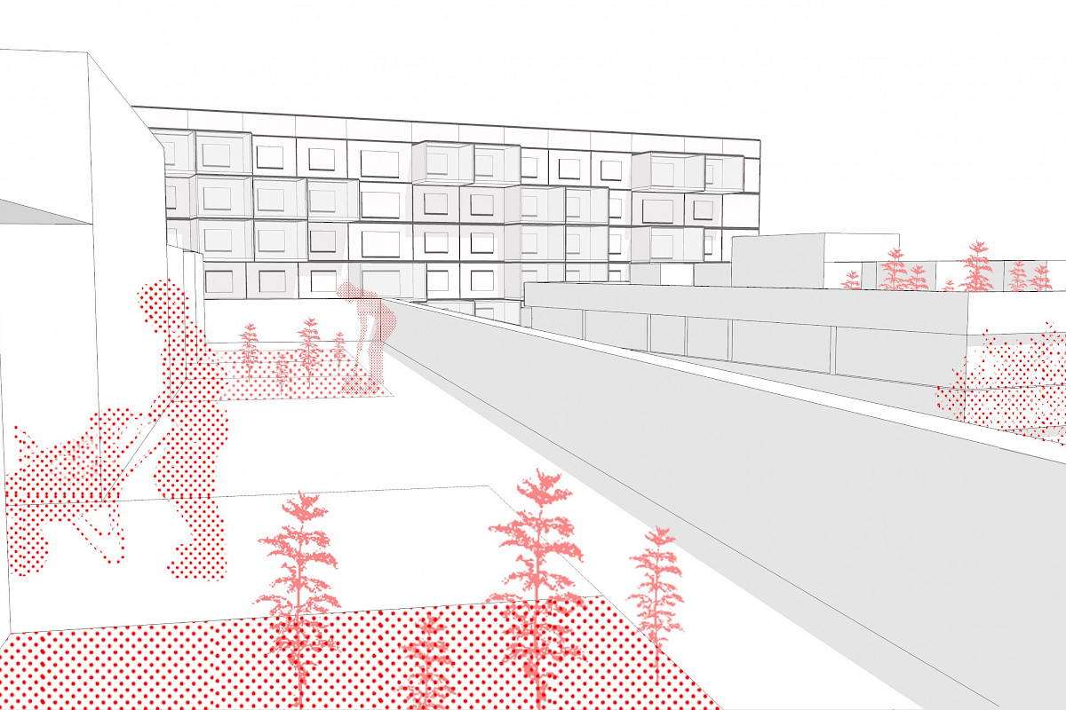 Pour explorer les potentiels de la densification et qualification urbanistique des Siedlungen modernistes de la RDA, ont été développé, à l’exemple d’un îlot au centre-ville de Berlin, des prototypes pour des immeubles d’habitation, des modules d’extension et des éléments paysagers.