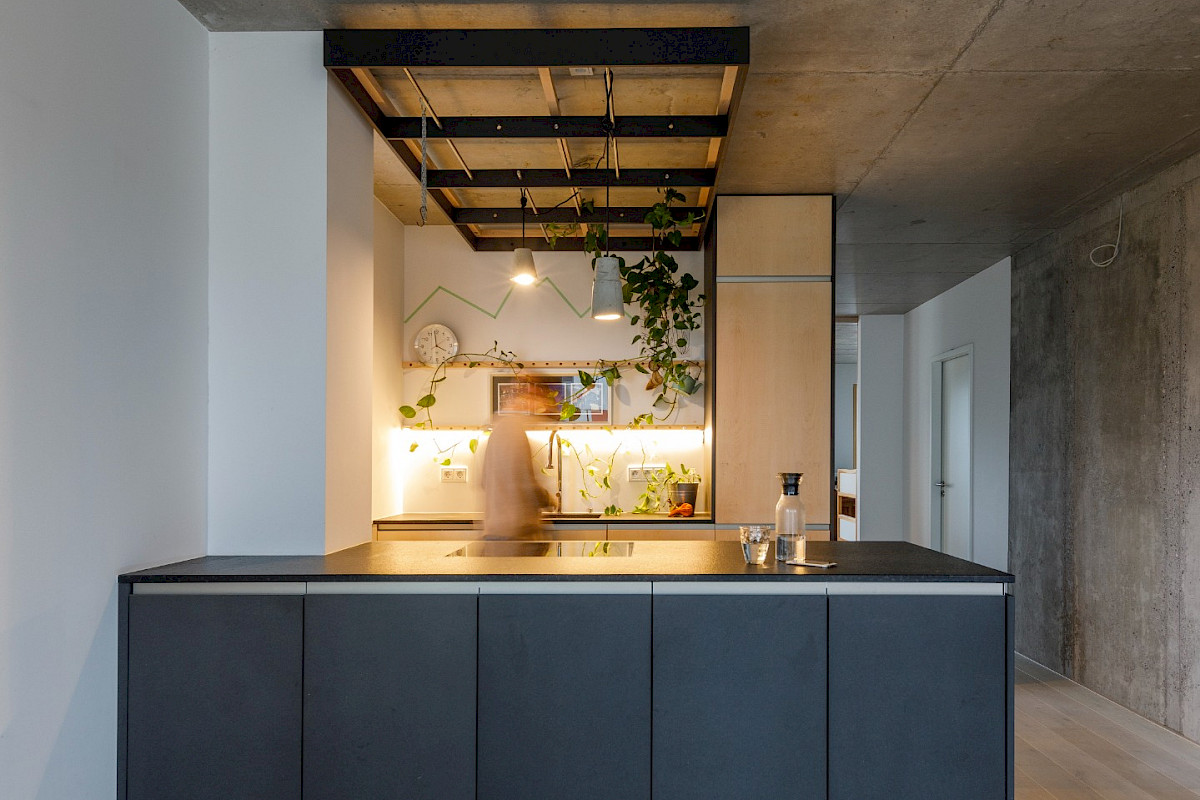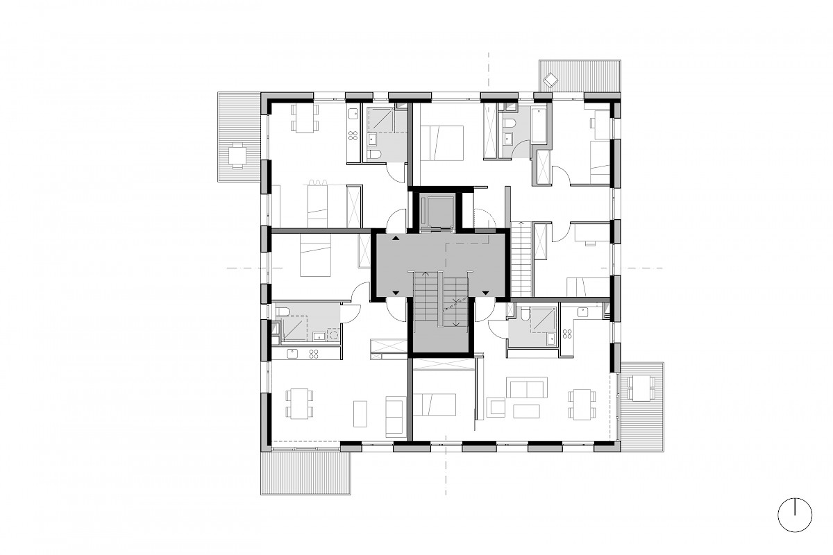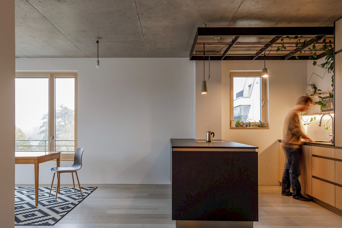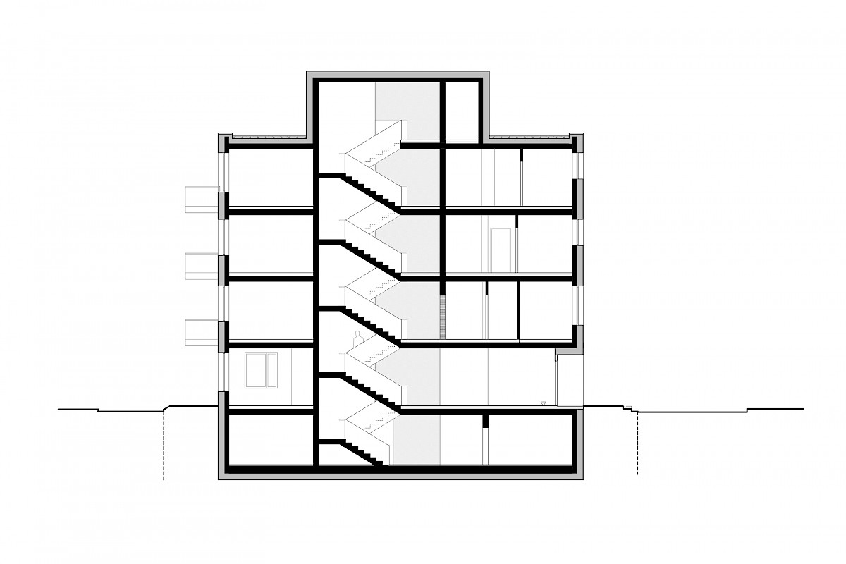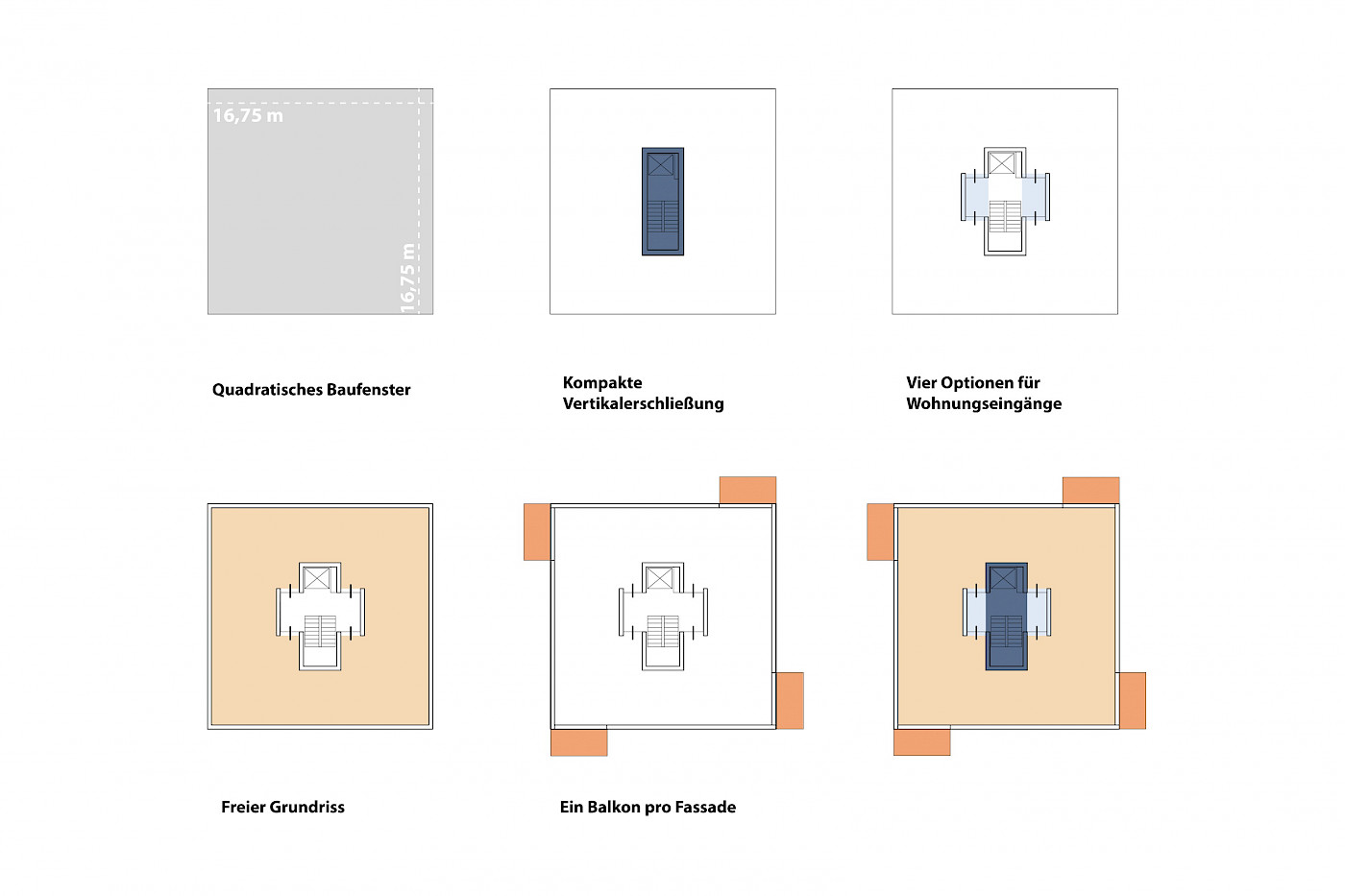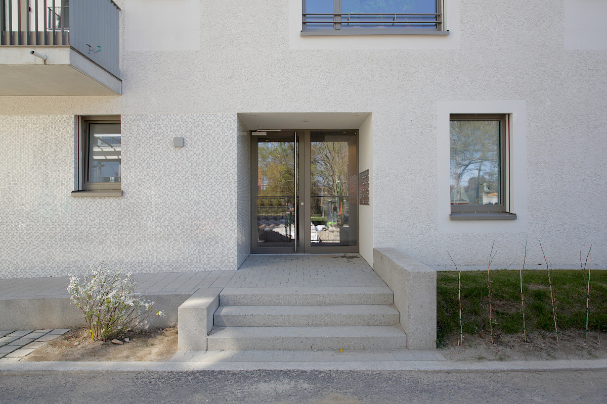 Vier geförderte Mietwohnungen und acht Eigentumswohnungen bilden zusammen eine Baugruppe. Tragende Außenwände und ein kreuzförmiger Erschließungskern lassen Raum für unterschiedlichste Wohnkonzepte. Die Treppenpodeste sind als Schwellenbereiche vor den Wohnungseingangstüren gestaltet. Die Dachterrasse steht allen Hausbewohnern zur Verfügung und kompensiert so die Knappheit ebenerdiger Freifläche.