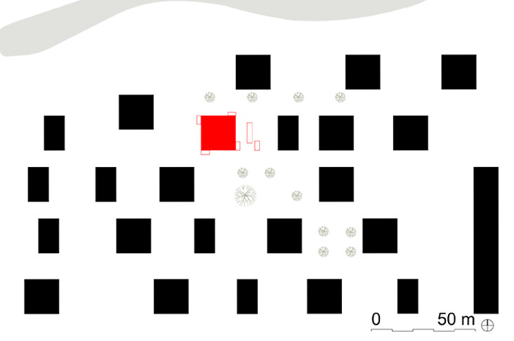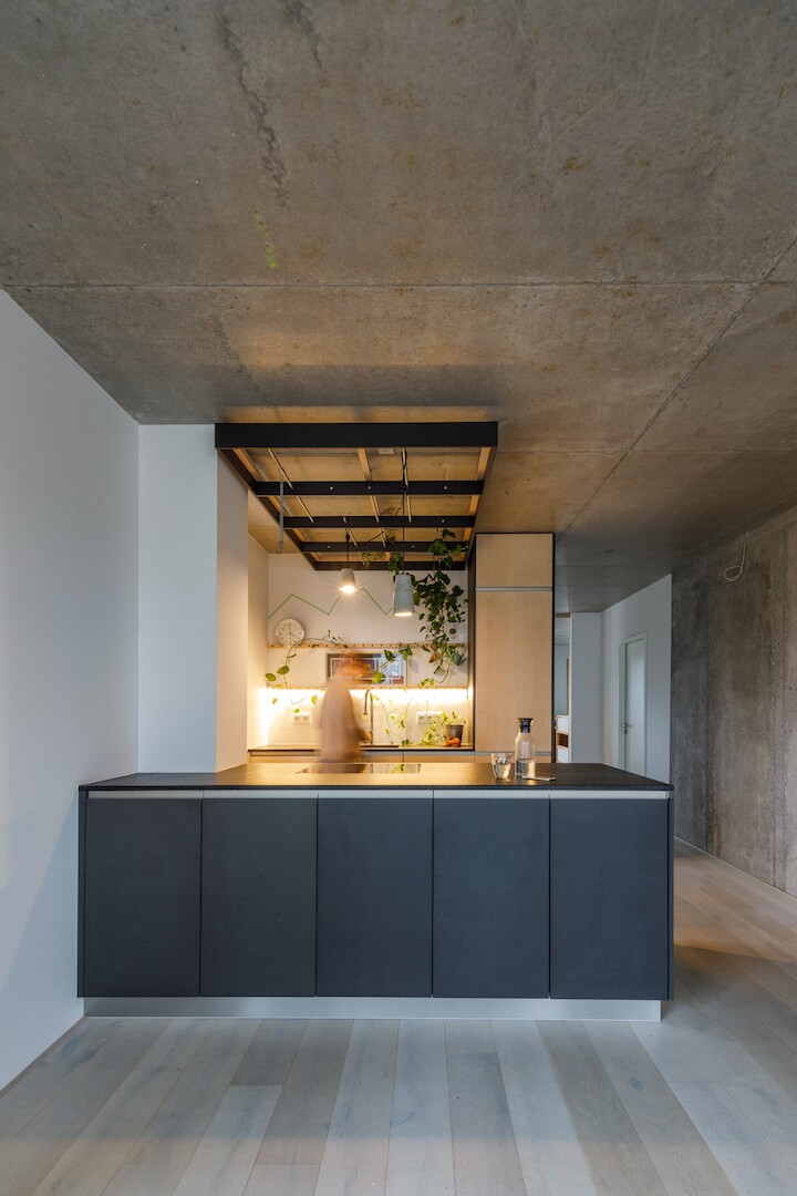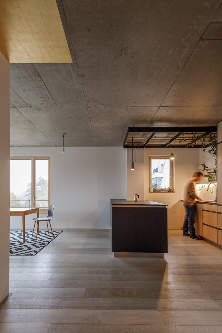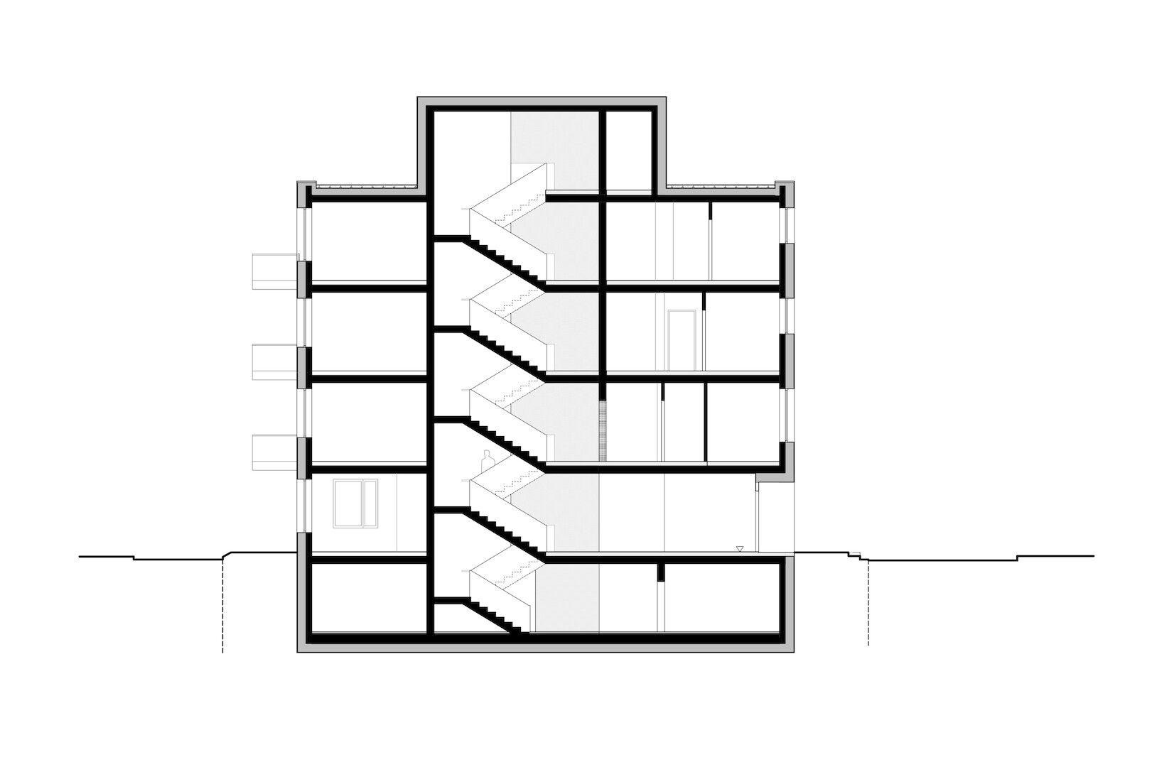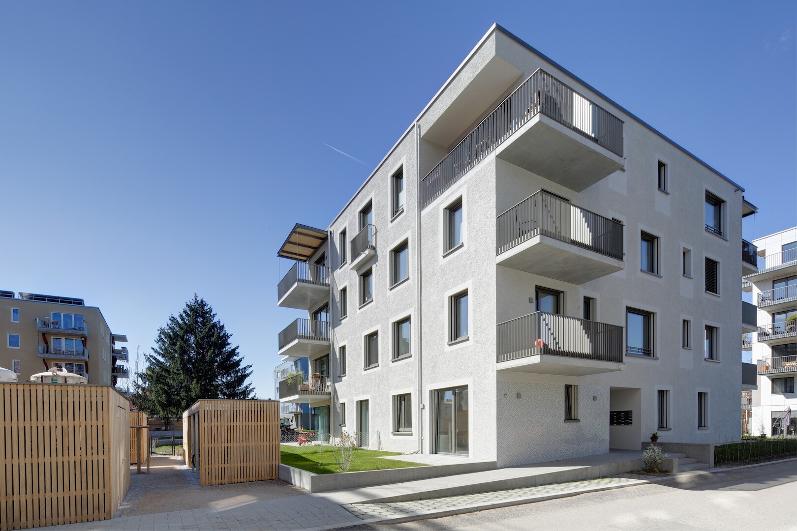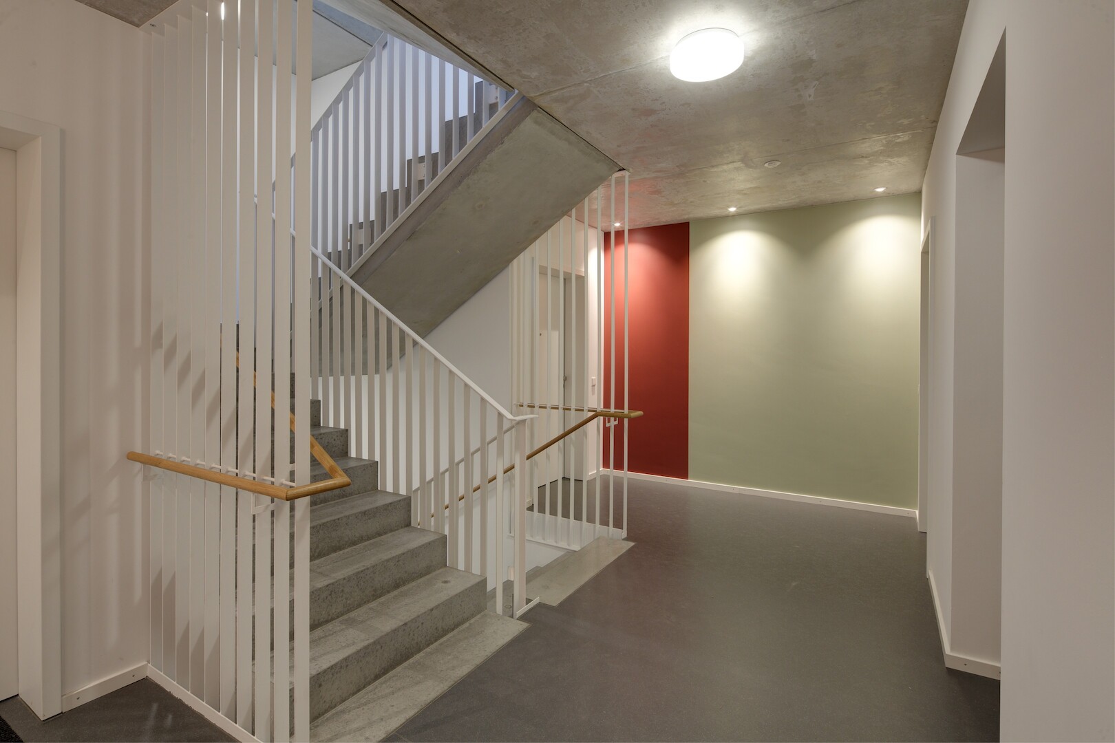 Vier geförderte Mietwohnungen und acht Eigentumswohnungen bilden zusammen eine Baugruppe. Tragende Außenwände und ein kreuzförmiger Erschließungskern lassen Raum für unterschiedlichste Wohnkonzepte. Die Treppenpodeste sind als Schwellenbereiche vor den Wohnungseingangstüren gestaltet. Die Dachterrasse steht allen Hausbewohnern zur Verfügung und kompensiert so die Knappheit ebenerdiger Freifläche.