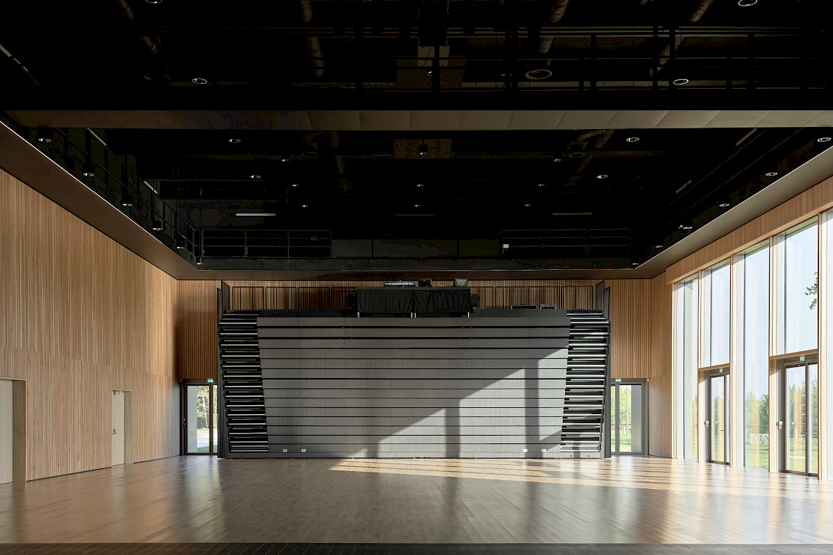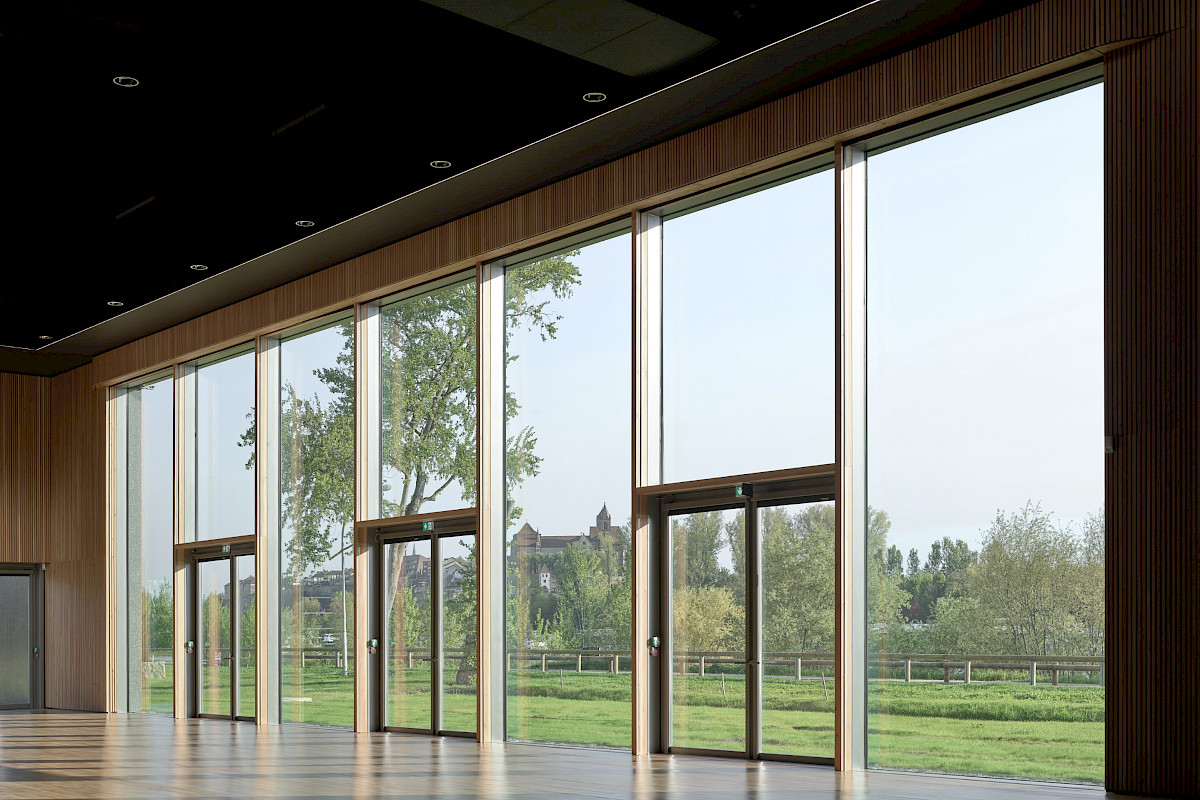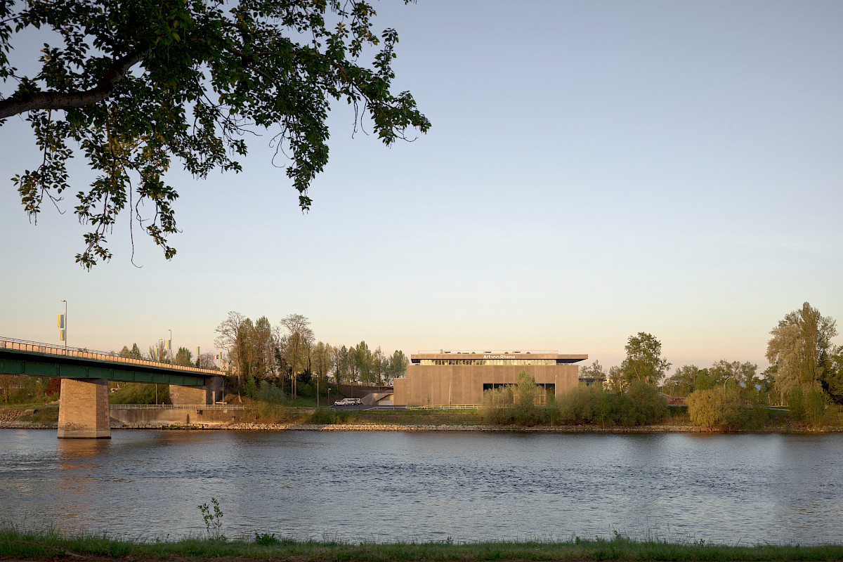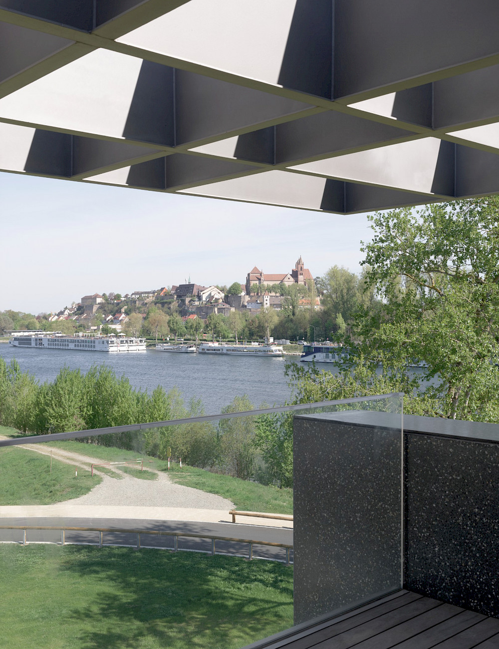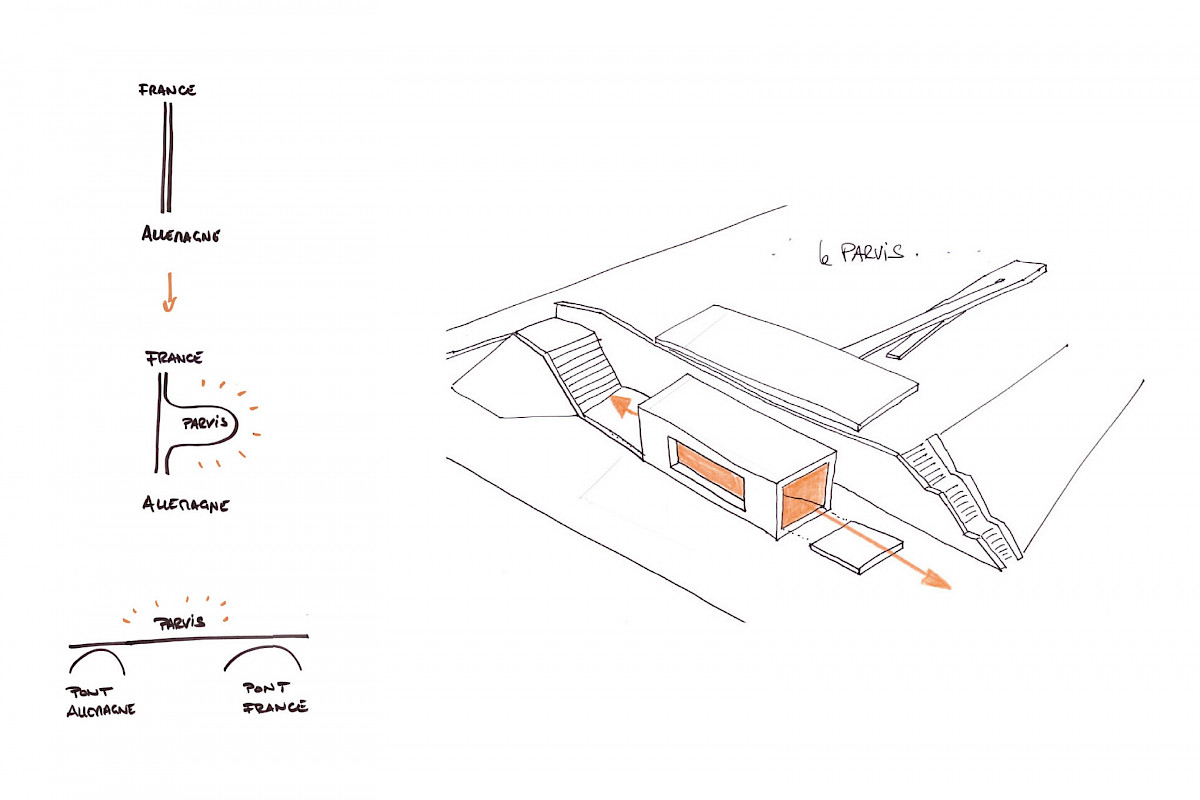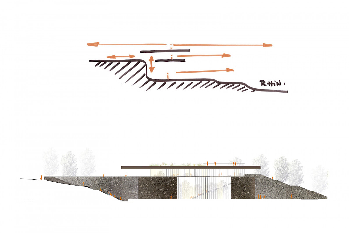 Die Architektur erwächst aus den Besonderheiten des Ortes: Der Konzert- und Veranstaltungssaal für 400 Besucher schiebt sich in die Uferböschung, die Sichtbezüge auf den Rhein und das am anderen Ufer aufsteigende Bergmassiv von Breisach werden in Szene gesetzt. Das Raumangebot umfasst neben dem flexibel nutzbaren Saal ein Informationszentrum für Touristen und Grenzgänger, einen Festplatz und eine Aussichtsplattform. Zudem beinhaltet das Zentrum mehrere Büro- und Konferenzräume, die eine hybride Nutzung möglich machen.