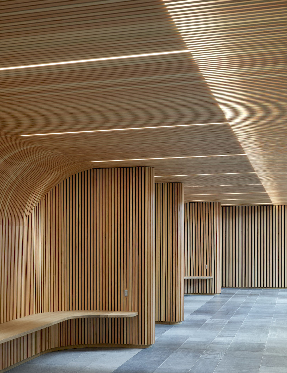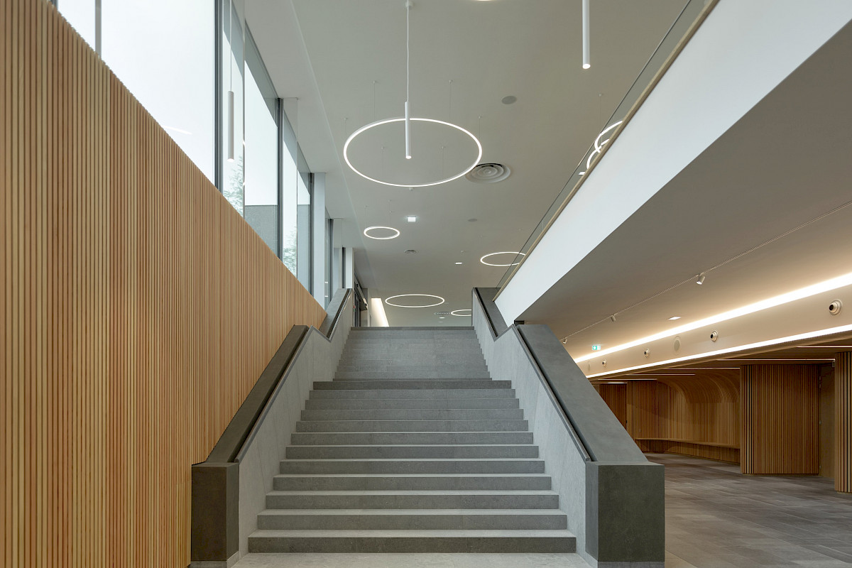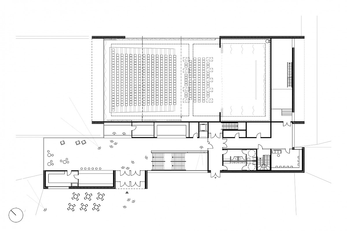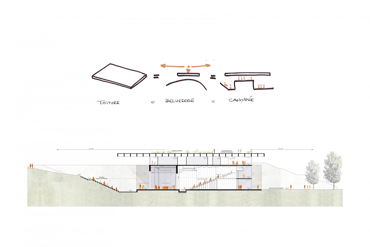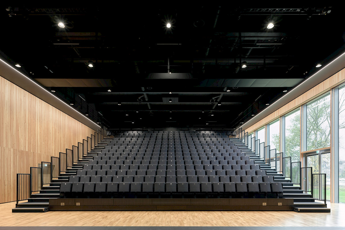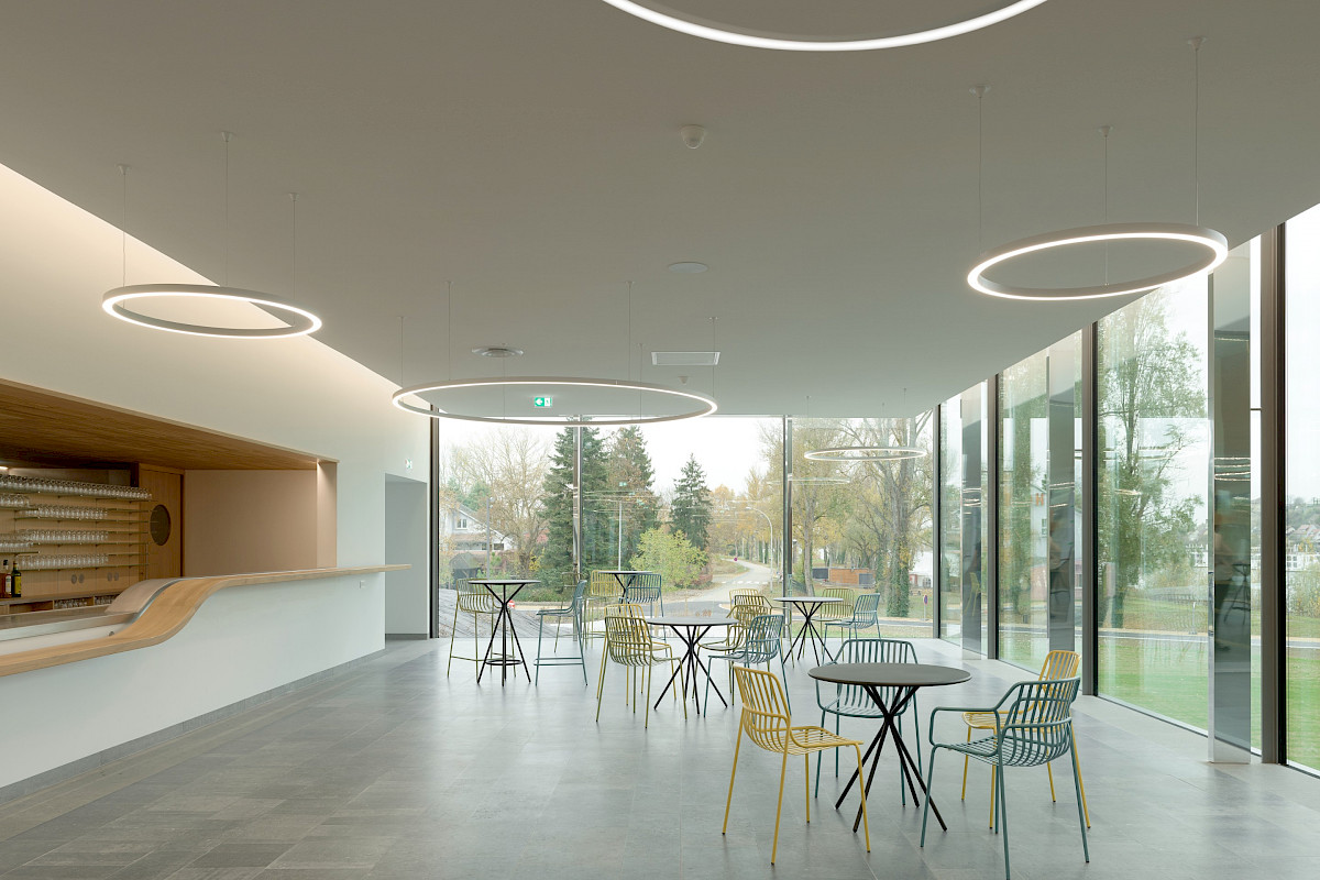 Die Architektur erwächst aus den Besonderheiten des Ortes: Der Konzert- und Veranstaltungssaal für 400 Besucher schiebt sich in die Uferböschung, die Sichtbezüge auf den Rhein und das am anderen Ufer aufsteigende Bergmassiv von Breisach werden in Szene gesetzt. Das Raumangebot umfasst neben dem flexibel nutzbaren Saal ein Informationszentrum für Touristen und Grenzgänger, einen Festplatz und eine Aussichtsplattform. Zudem beinhaltet das Zentrum mehrere Büro- und Konferenzräume, die eine hybride Nutzung möglich machen.