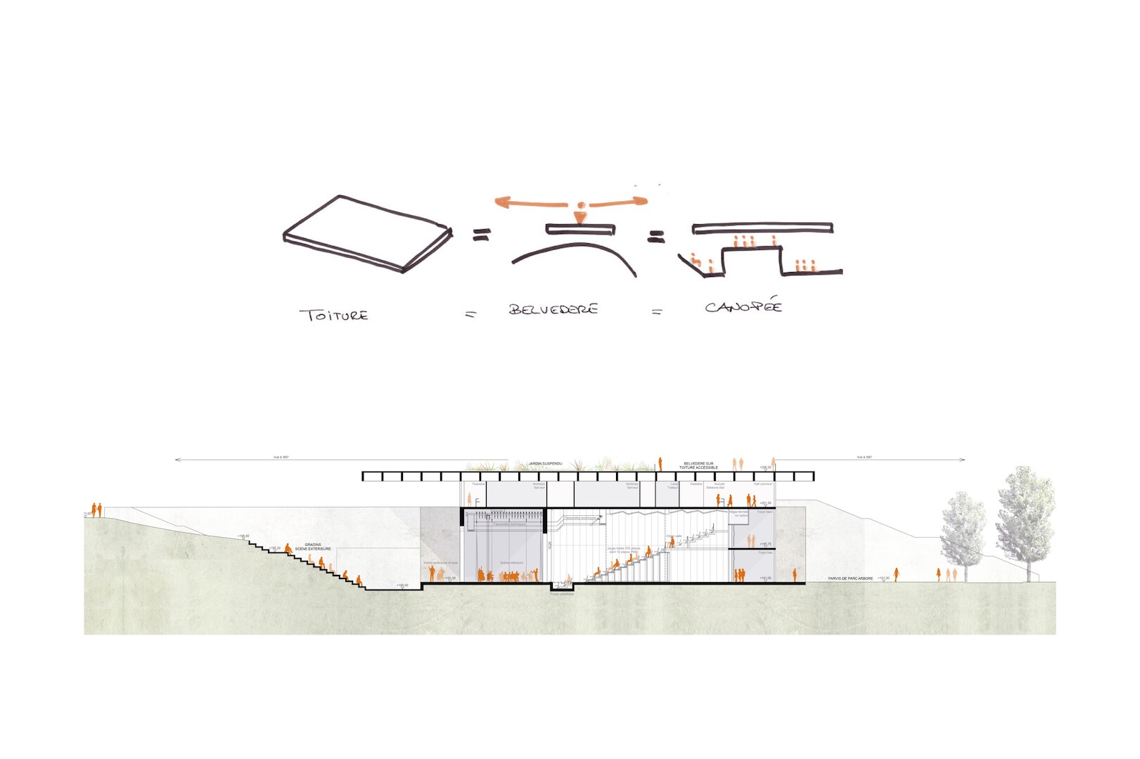 Die Architektur erwächst aus den Besonderheiten des Ortes: Der Konzert- und Veranstaltungssaal für 400 Besucher schiebt sich in die Uferböschung, die Sichtbezüge auf den Rhein und das am anderen Ufer aufsteigende Bergmassiv von Breisach werden in Szene gesetzt. Das Raumangebot umfasst neben dem flexibel nutzbaren Saal ein Informationszentrum für Touristen und Grenzgänger, einen Festplatz und eine Aussichtsplattform. Zudem beinhaltet das Zentrum mehrere Büro- und Konferenzräume, die eine hybride Nutzung möglich machen.