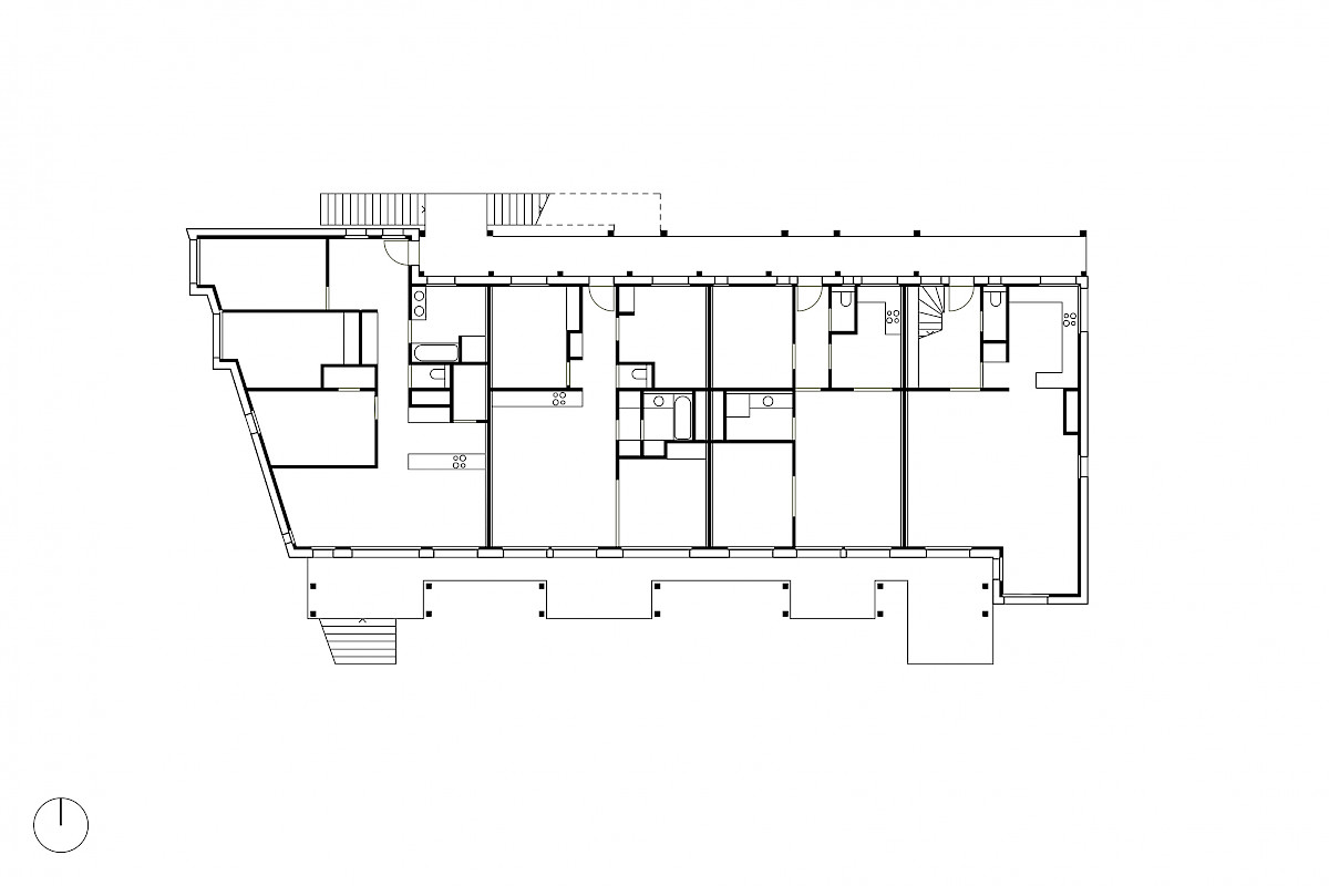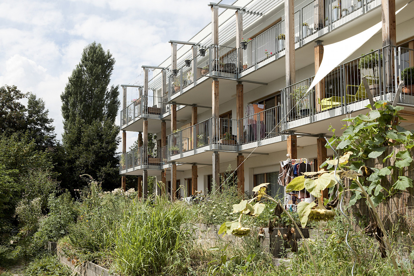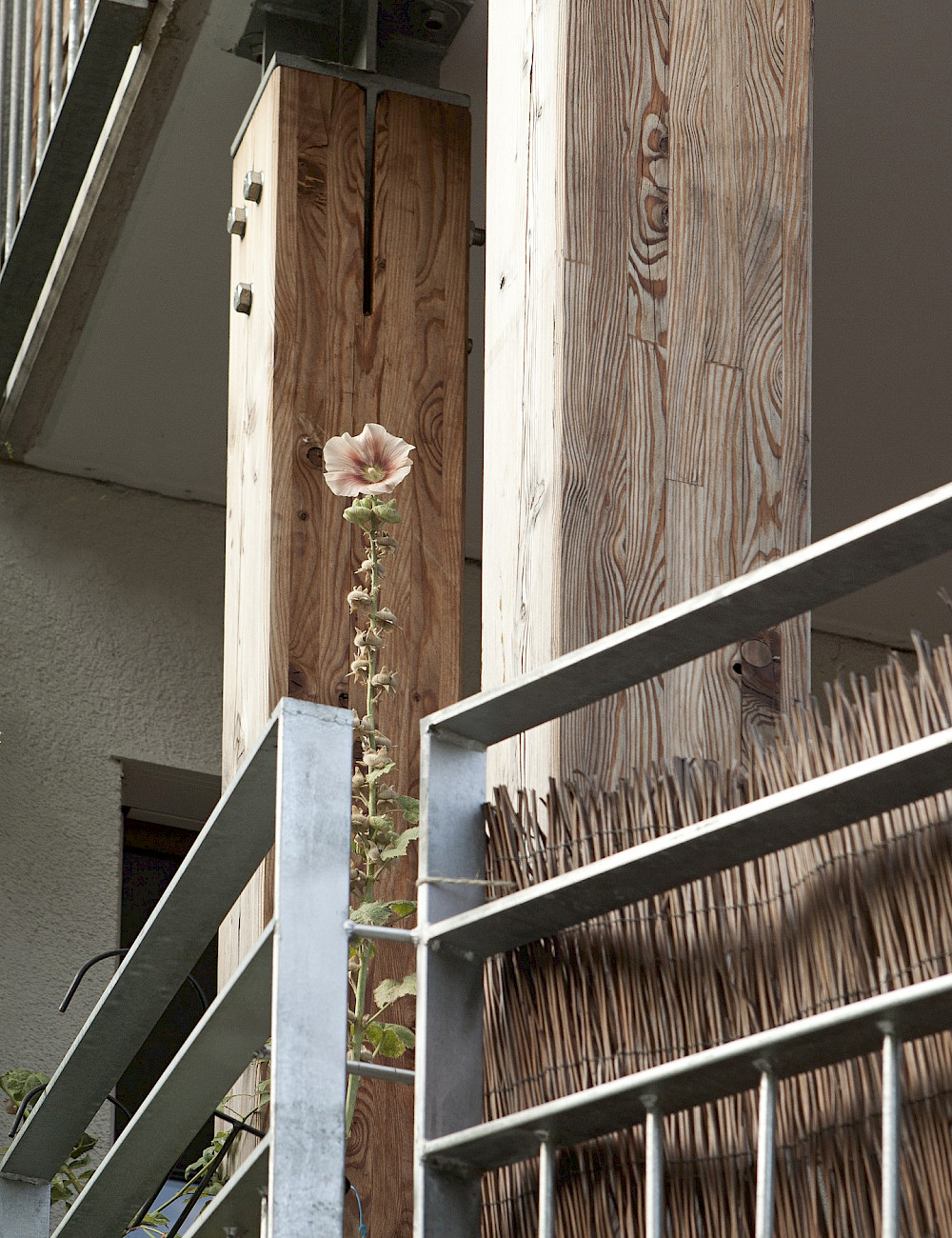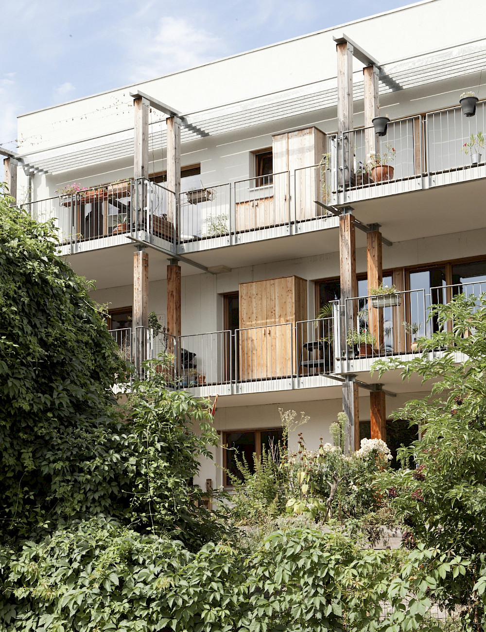 „ (...) Das erste Holzhaus seit den Fachwerkhäusern“ in der Stadt besteht aus vorgefertigten Dickholzplatten, die mangels regionaler Anbieter, aus Vorarlberg importiert und von einer Pfälzer Firma binnen vier Wochen montiert wurden. Lang und schmal, besetzt das Haus ein Restgrundstück im citynahen Stadtteil Neudorf. Ein kommunikativer, robust- ruppig detaillierter Laubengang erschließt die elf Wohnungen auf der Nordseite, zum idyllischen Eßkastanienplatz hin. Die Stirnseite des Gebäudes, an der die schicke Straßburger Straßenbahn vorbei gleitet, wird künftig hinter einem plakativen grünen Pelz verschwinden. (…) Im Ausbau und haustechnisch bleibt das Pionierprojekt pragmatisch: Unbehandelte Hölzer, Naturfarben, Verzicht auf PVC und viel Bauchemie, Brennwertkessel; eine große thermische Solaranlage verschwindet auf dem Flachdach hinter der erhöhten Attika. (…)“ (aus: Christoph Gunßer, Haus hinter grünem Pelz, in: Baumeister, Ausgabe April 2011, S. 24)