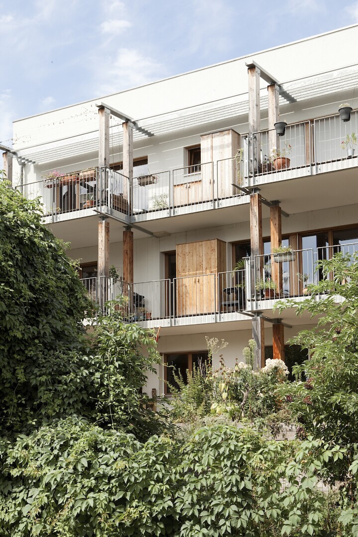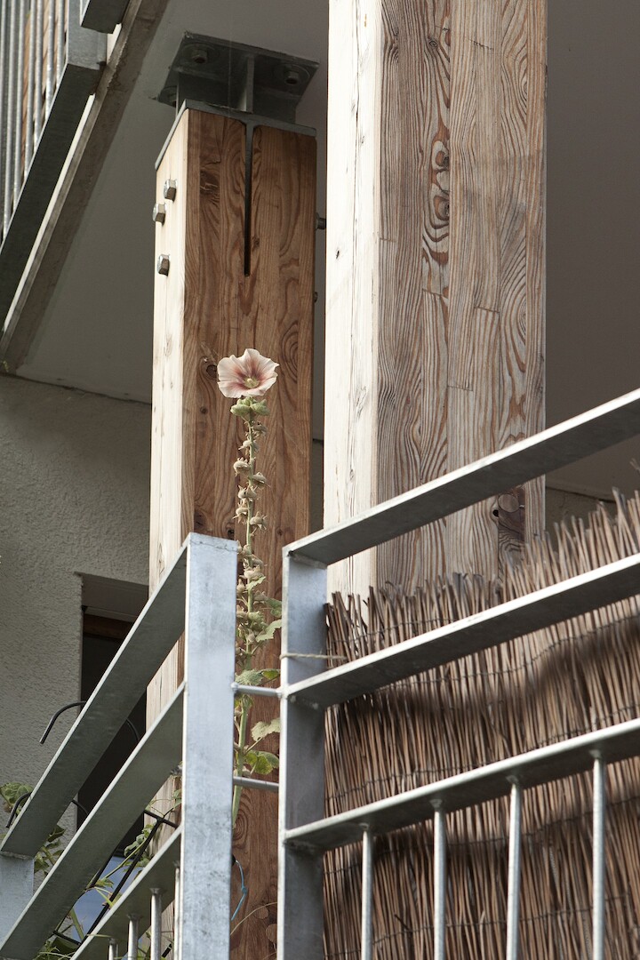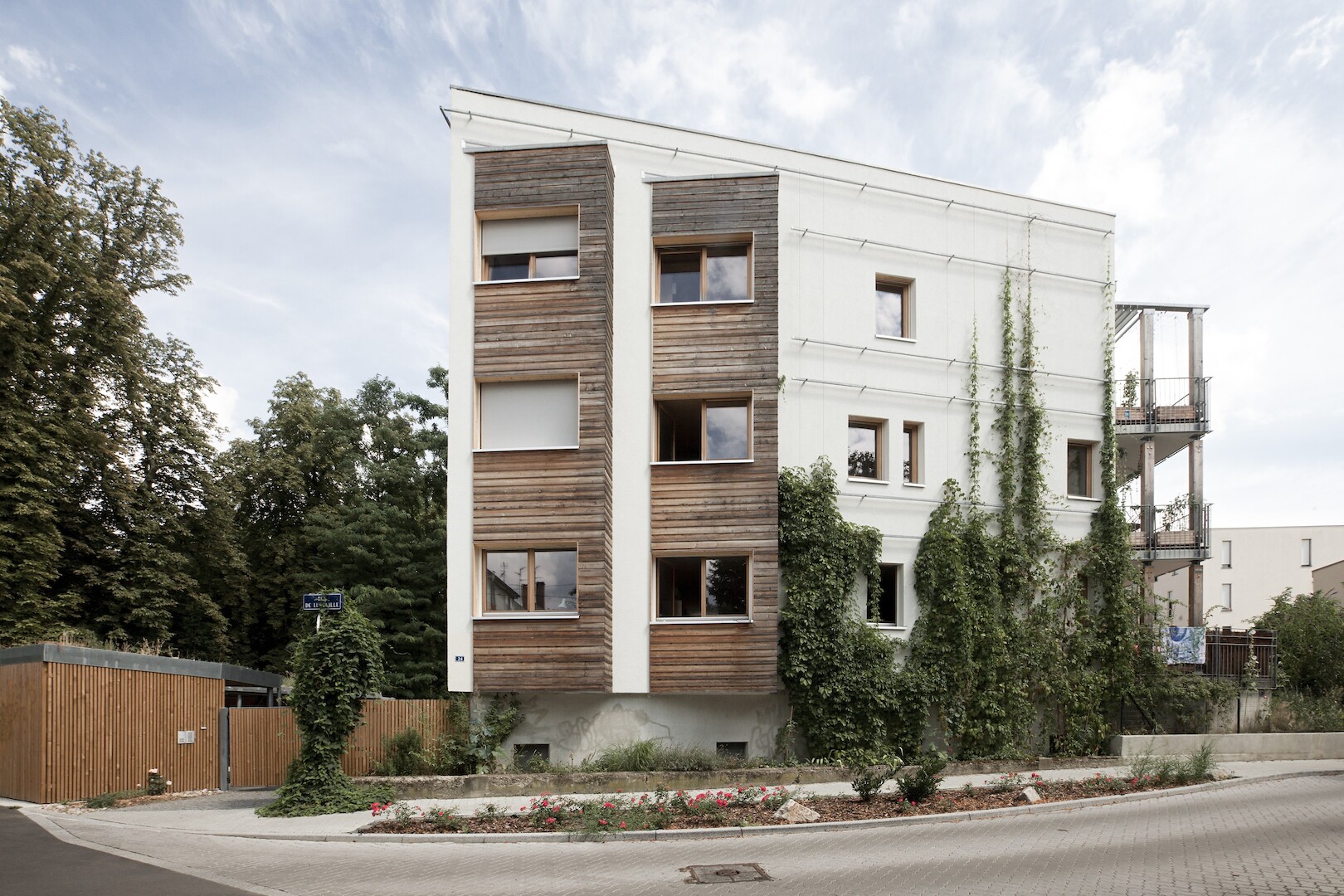 „ (...) Das erste Holzhaus seit den Fachwerkhäusern“ in der Stadt besteht aus vorgefertigten Dickholzplatten, die mangels regionaler Anbieter, aus Vorarlberg importiert und von einer Pfälzer Firma binnen vier Wochen montiert wurden. Lang und schmal, besetzt das Haus ein Restgrundstück im citynahen Stadtteil Neudorf. Ein kommunikativer, robust- ruppig detaillierter Laubengang erschließt die elf Wohnungen auf der Nordseite, zum idyllischen Eßkastanienplatz hin. Die Stirnseite des Gebäudes, an der die schicke Straßburger Straßenbahn vorbei gleitet, wird künftig hinter einem plakativen grünen Pelz verschwinden. (…) Im Ausbau und haustechnisch bleibt das Pionierprojekt pragmatisch: Unbehandelte Hölzer, Naturfarben, Verzicht auf PVC und viel Bauchemie, Brennwertkessel; eine große thermische Solaranlage verschwindet auf dem Flachdach hinter der erhöhten Attika. (…)“ (aus: Christoph Gunßer, Haus hinter grünem Pelz, in: Baumeister, Ausgabe April 2011, S. 24)