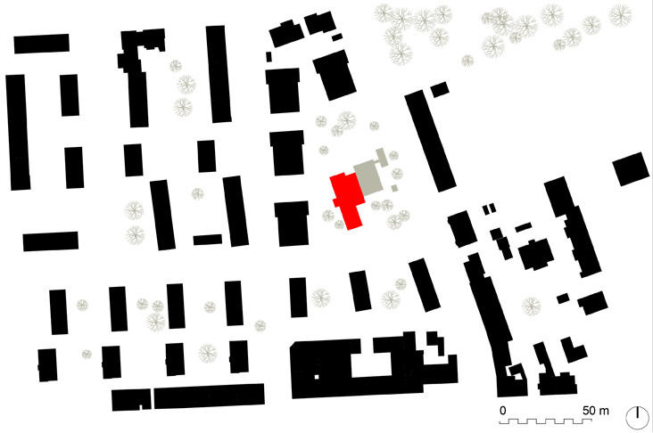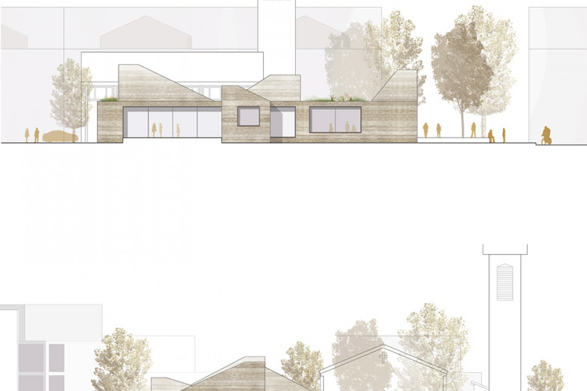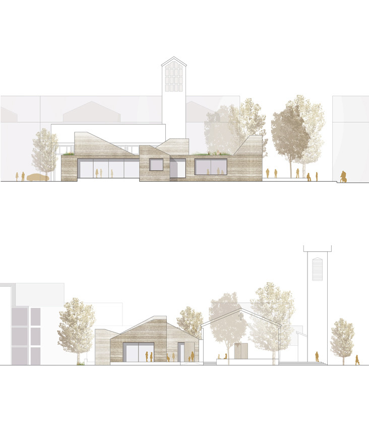 Altes Kirchengebäude und neues Gemeindehaus stehen so zueinander, dass ein Winkel aus Raumkanten und damit ein zweiseitig gefasster Außenraum entsteht: