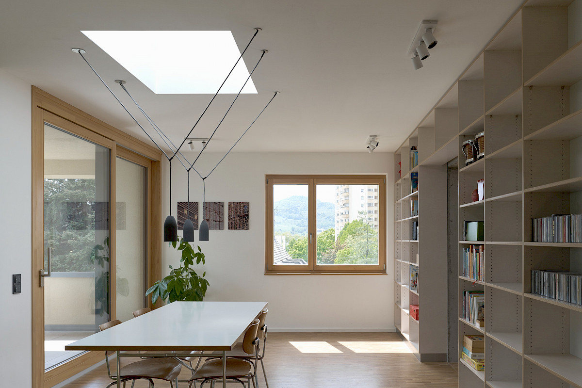 Pour le groupement d‘autopromotion composé de quatre jeunes familles, il s'agissait de répartir équitablement les différentes qualités des différents emplacements dans le bâtiment. De plus, les quatre appartements de taille similaire devaient être logés dans les trois étages prévus par le plan d'urbanisme.