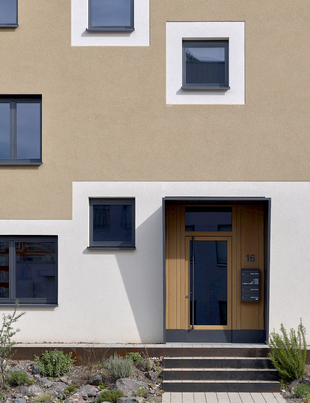 L'individualité et l'imbrication des appartements sont ainsi suggérées de l'extérieur, sans générer une lisibilité précise de la répartition. Le bâtiment a été construit en briques monolithiques et recouvert d'un enduit minéral gratté.