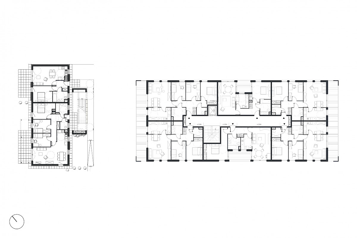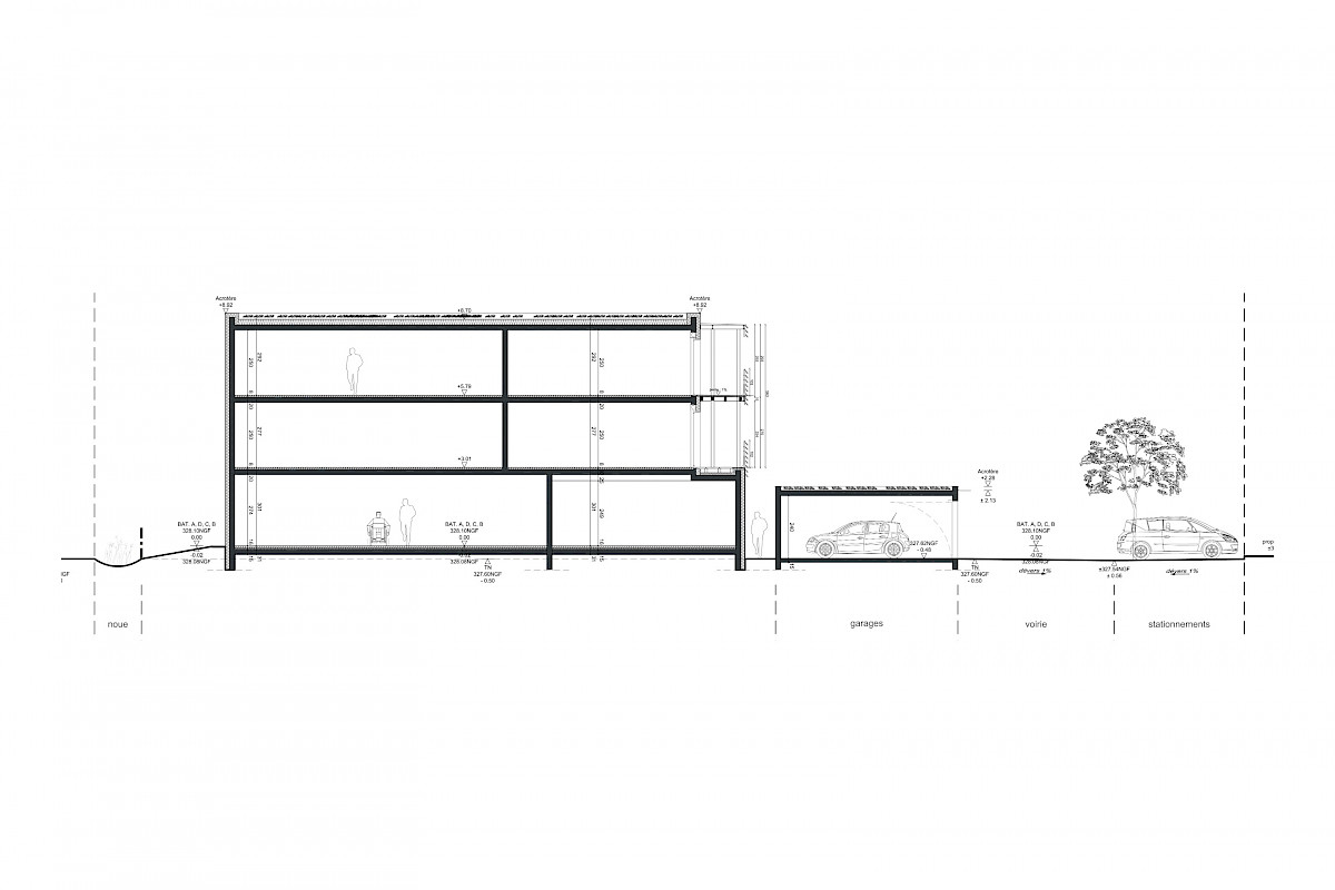 Le terrain à urbaniser est aujourd’hui composé d’une étendue de stationnements, d’une prairie et d’une large voie automobile. La proposition de partition de ce vaste terrain opte pour un dispositif inspiré de l’existant avec création d’une généreuse rue urbaine. Ce dispositif, consommateur de terrains imperméabilisés, n’offre aucune continuité, et risque d’apparaître comme un banal espace envahi par les véhicules motorisés. Notre proposition privilégie un axe de liaison, principalement destiné aux piétons et aux cycles. Son gabarit permet toutefois de laisser ouvert la voie pour les véhicules. Elle permet aussi le retournement de l’entrée de l’école sur un espace public apaisé et le maintien du caractère de circulation douce du coeur de village, garant de qualité de vie. L’architecture se positionne en intégrant les propriétés écologiques, économiques et anthropiques jugées les plus importantes. Elle propose un habitat intermédiaire compact, s’élevant sur R+2 au maximum, avec des prospects généreux, bénéficiant de double orientation.