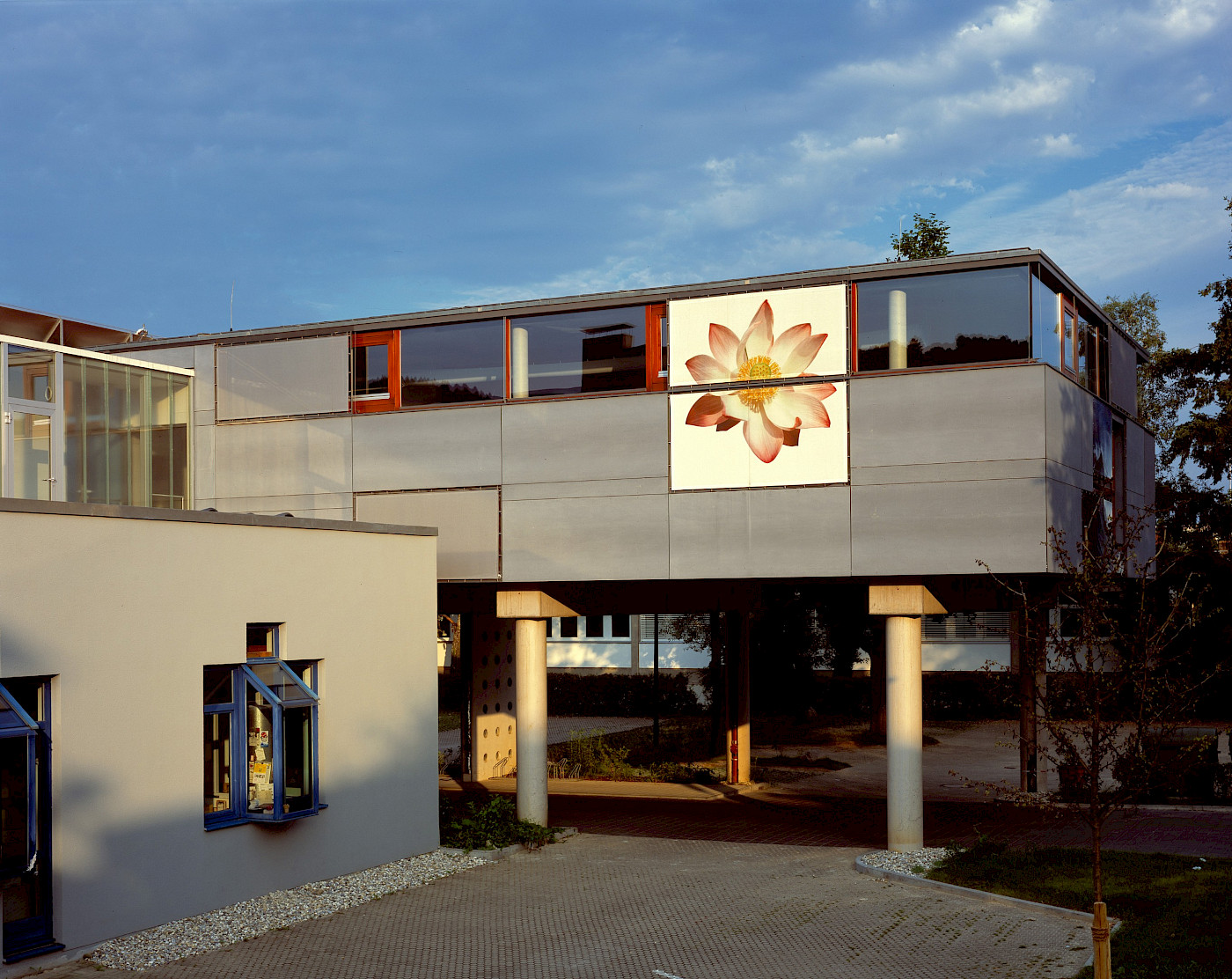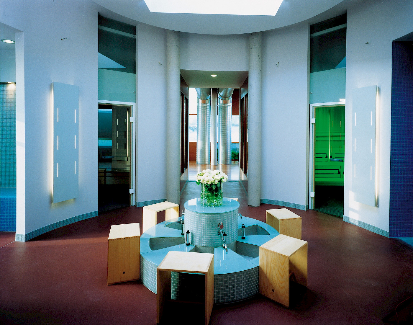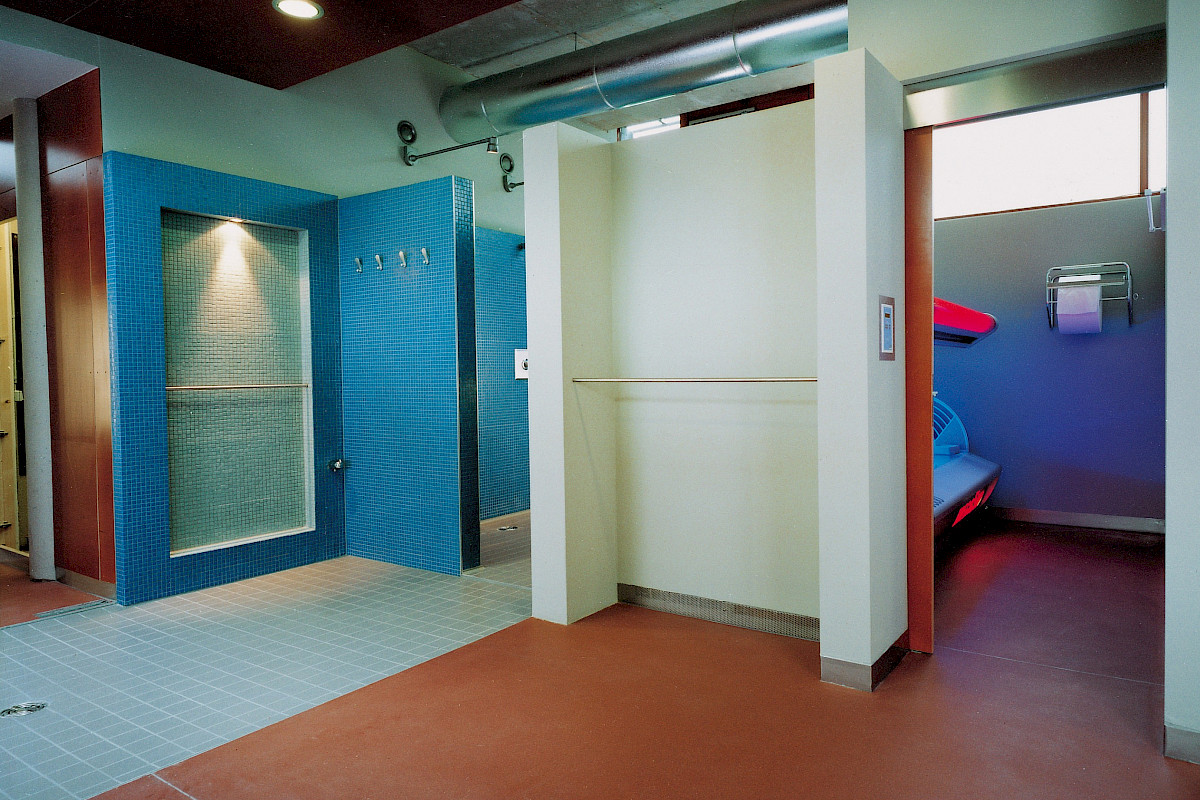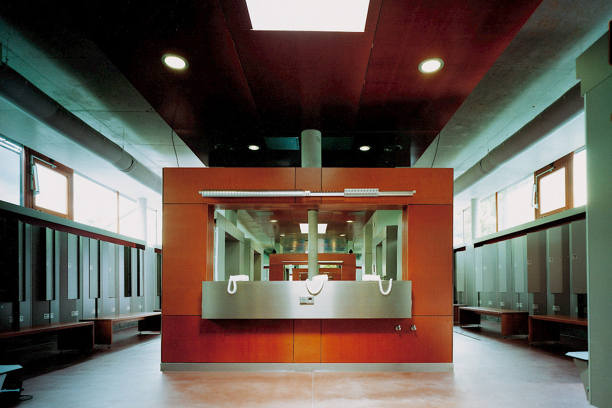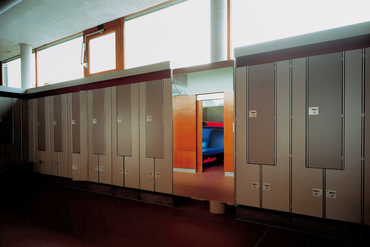 Il s’agit ici de l’agrandissement d’un centre de mise en forme situé dans une zone industrielle. Un nouveau corps de bâtiment abritant des vestiaires et des saunas vient achever un ensemble résultant d´agrandissements successifs au fil des années. La nouvelle aile s’inspire des cabanes de plages et d’exemples historiques de l’architecture de bains. Elle présente une structure de façade légère constituée de panneaux, de verre et de tissu. Les vues, les perspectives, le rayonnement solaire et la lumière sont filtrés selon l´heure et le temps du jour. La salle de repos et la terrasse offrent de magnifiques vues sur la Forêt-Noire.