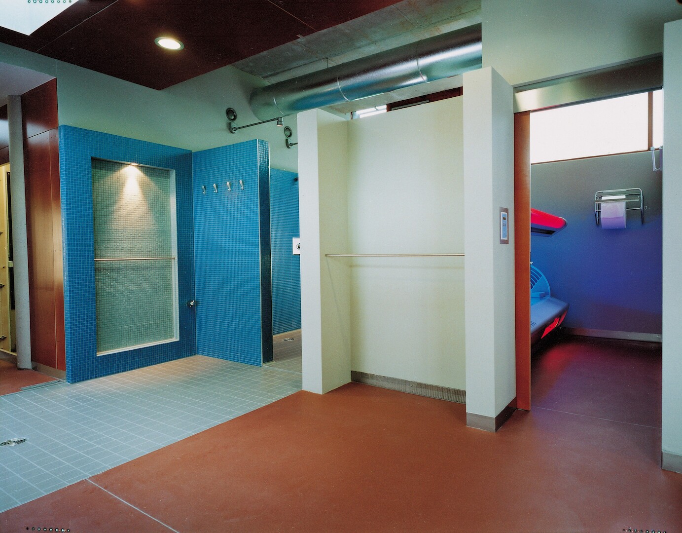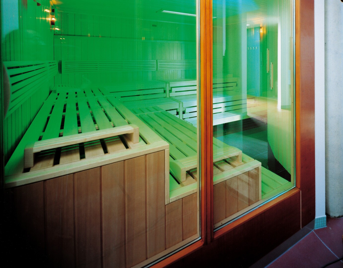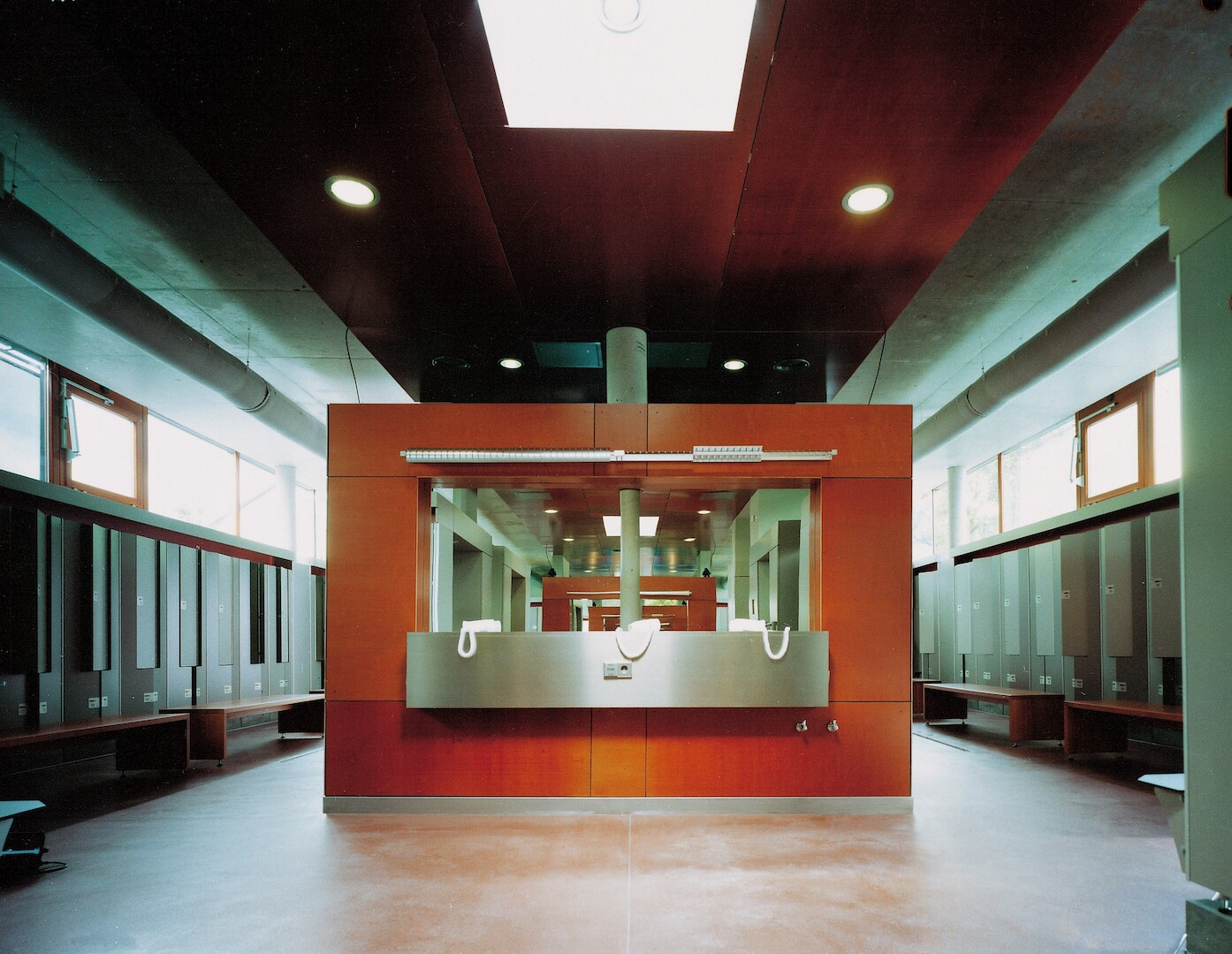 Il s’agit ici de l’agrandissement d’un centre de mise en forme situé dans une zone industrielle. Un nouveau corps de bâtiment abritant des vestiaires et des saunas vient achever un ensemble résultant d´agrandissements successifs au fil des années. La nouvelle aile s’inspire des cabanes de plages et d’exemples historiques de l’architecture de bains. Elle présente une structure de façade légère constituée de panneaux, de verre et de tissu. Les vues, les perspectives, le rayonnement solaire et la lumière sont filtrés selon l´heure et le temps du jour. La salle de repos et la terrasse offrent de magnifiques vues sur la Forêt-Noire.