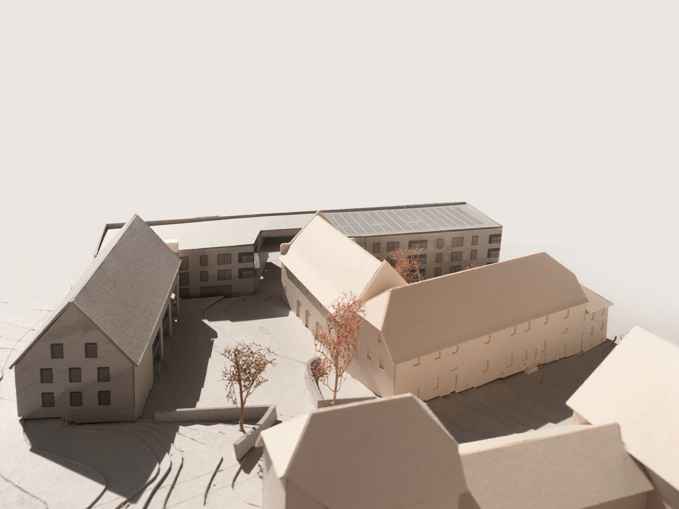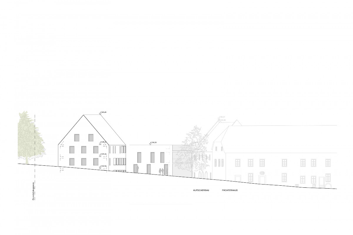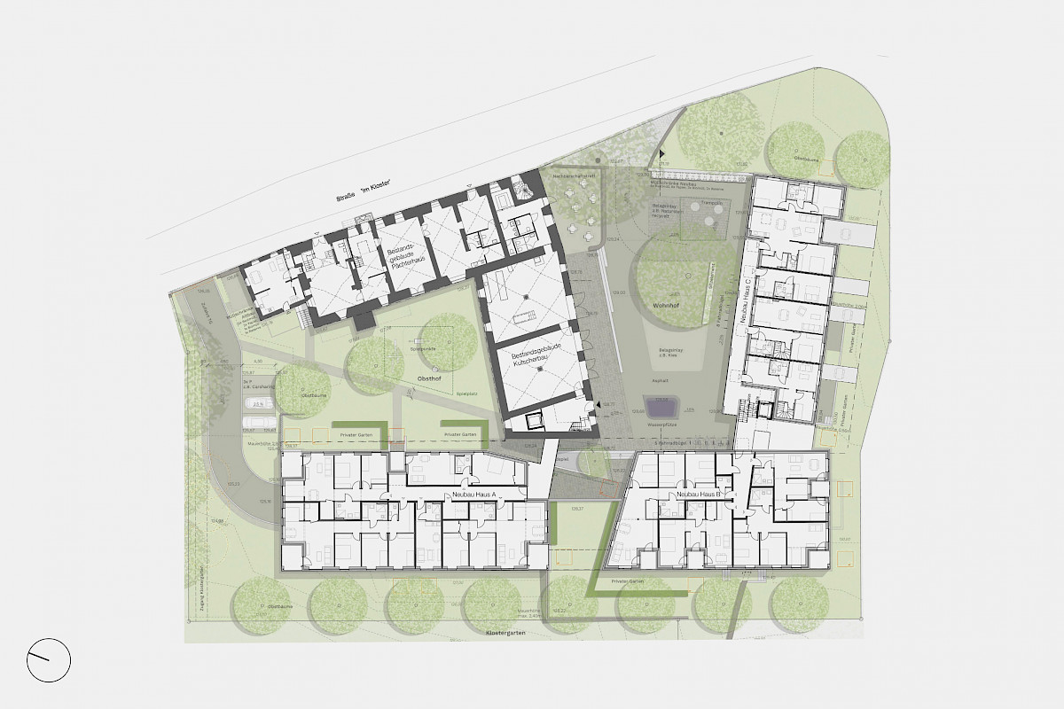 Le projet est situé dans les environs de Francfort sur une colline à l’intérieur de l’enceinte d’un ancien couvent entre la basilique romane et le jardin du couvent. Il intègre la réhabilitation de deux bâtiments du 17ième siècle placés en équerre. Les nouveaux volumes en construction bois reprennent les traces des bâtiments et constructions antécédantes. Par leur emplacement ils definissent un cour d’entrée cadrée par l’ancien et le neuf. Ils hébergent des logements locatifs offrant de vastes vues vers le village et la plaine.