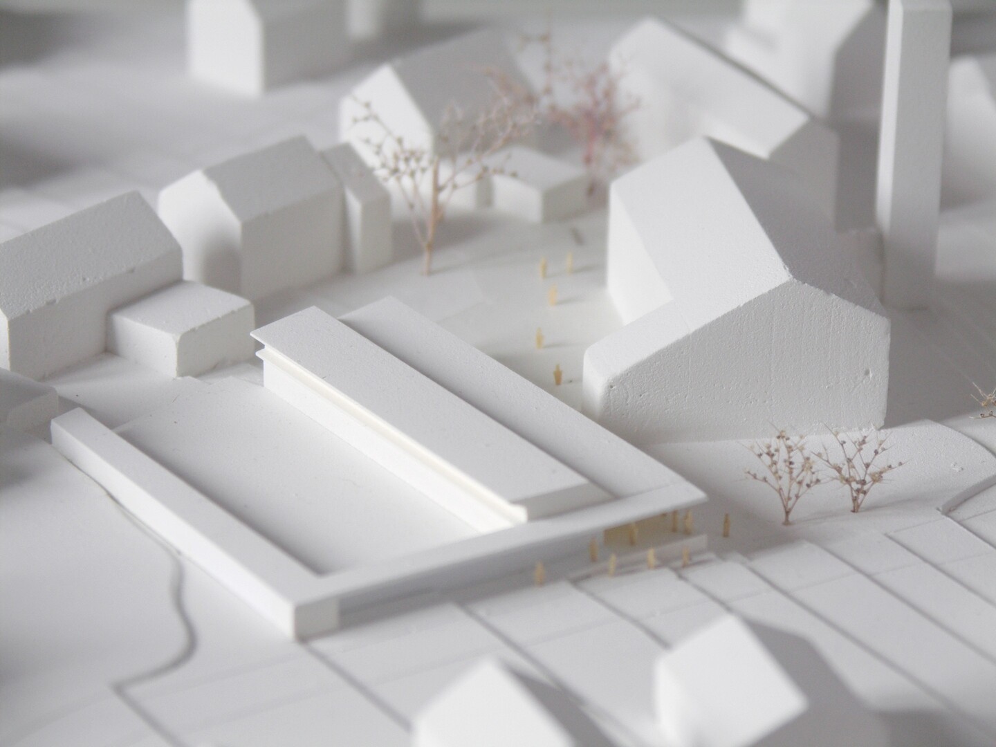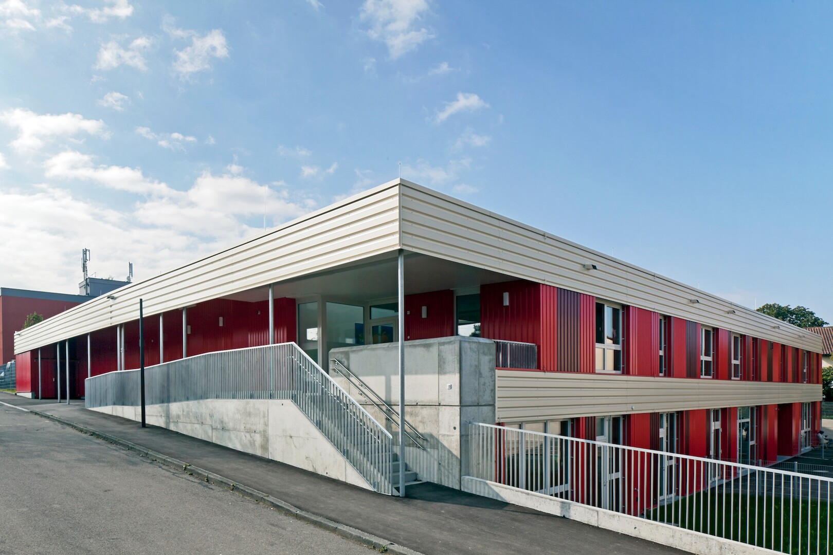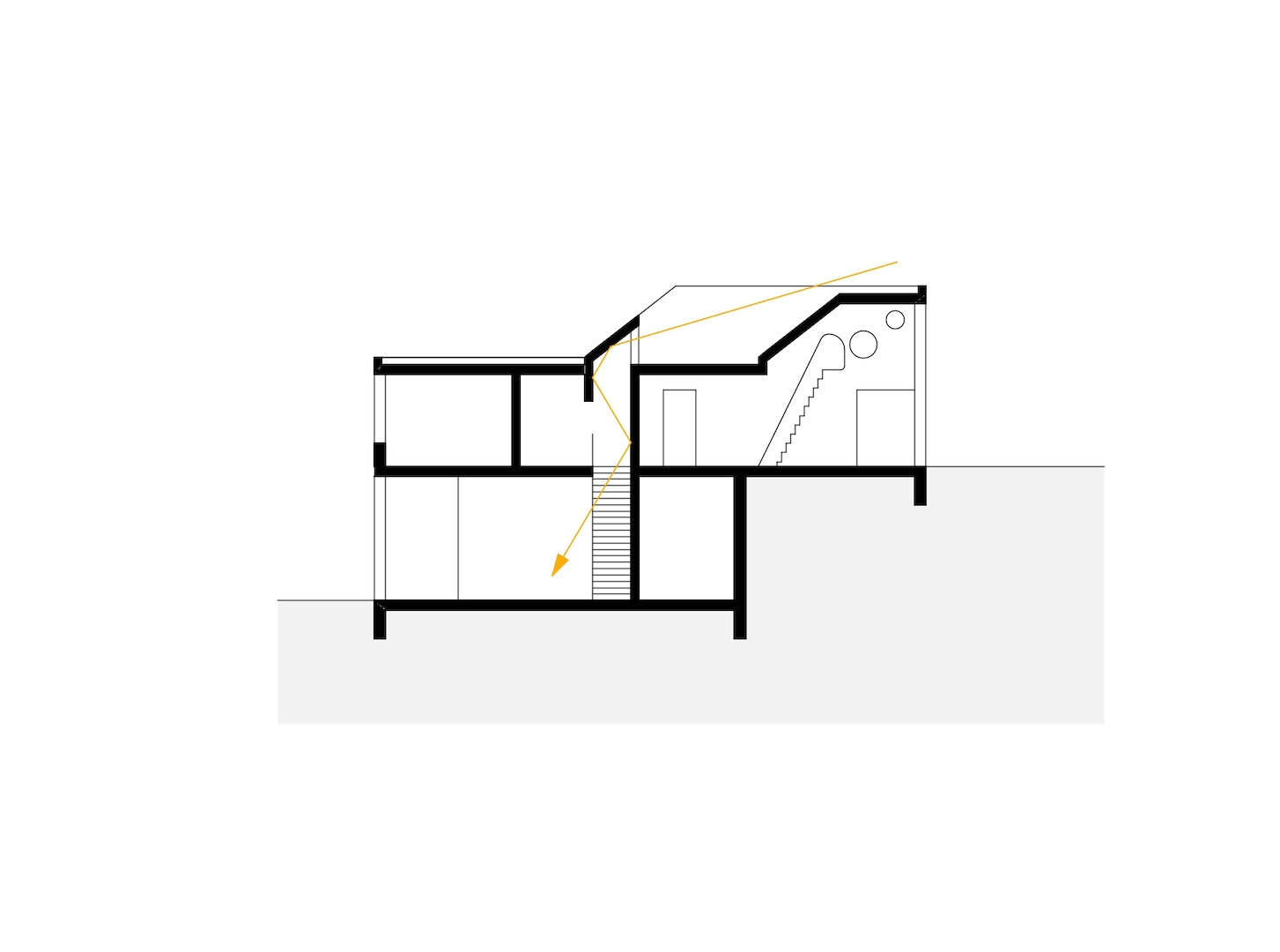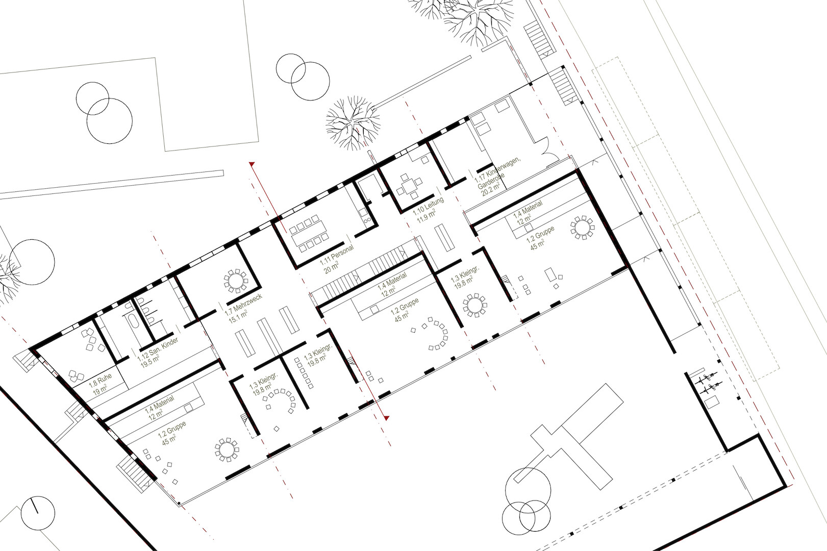 La nouvelle construction se déploie le long des courbes de niveau sur deux étages, qui offrent à chaque fois un rapport de plain-pied avec le terrain. La disposition sur deux niveaux préserve au maximum les espaces extérieurs, qui sont structurés par le bâtiment.