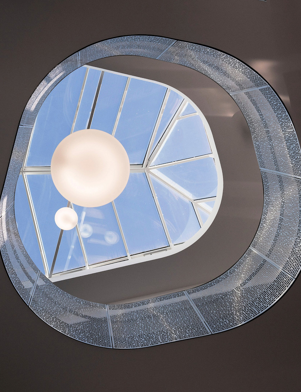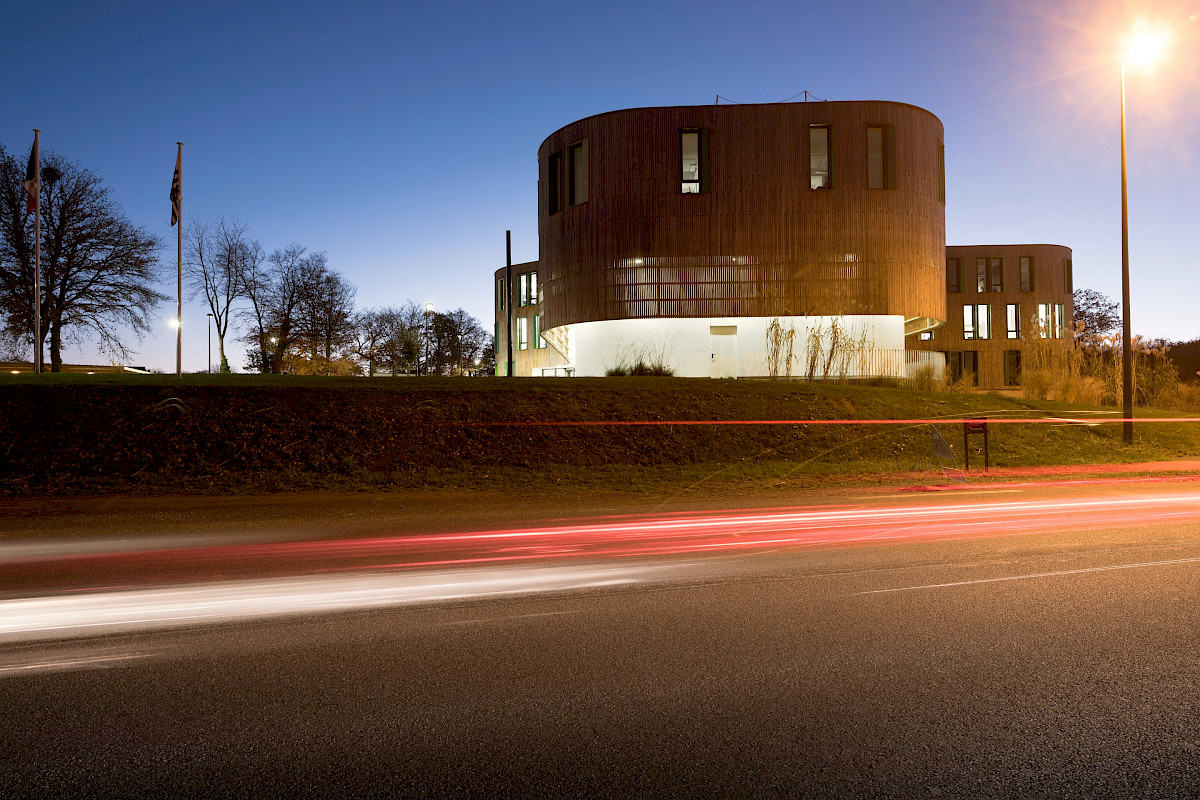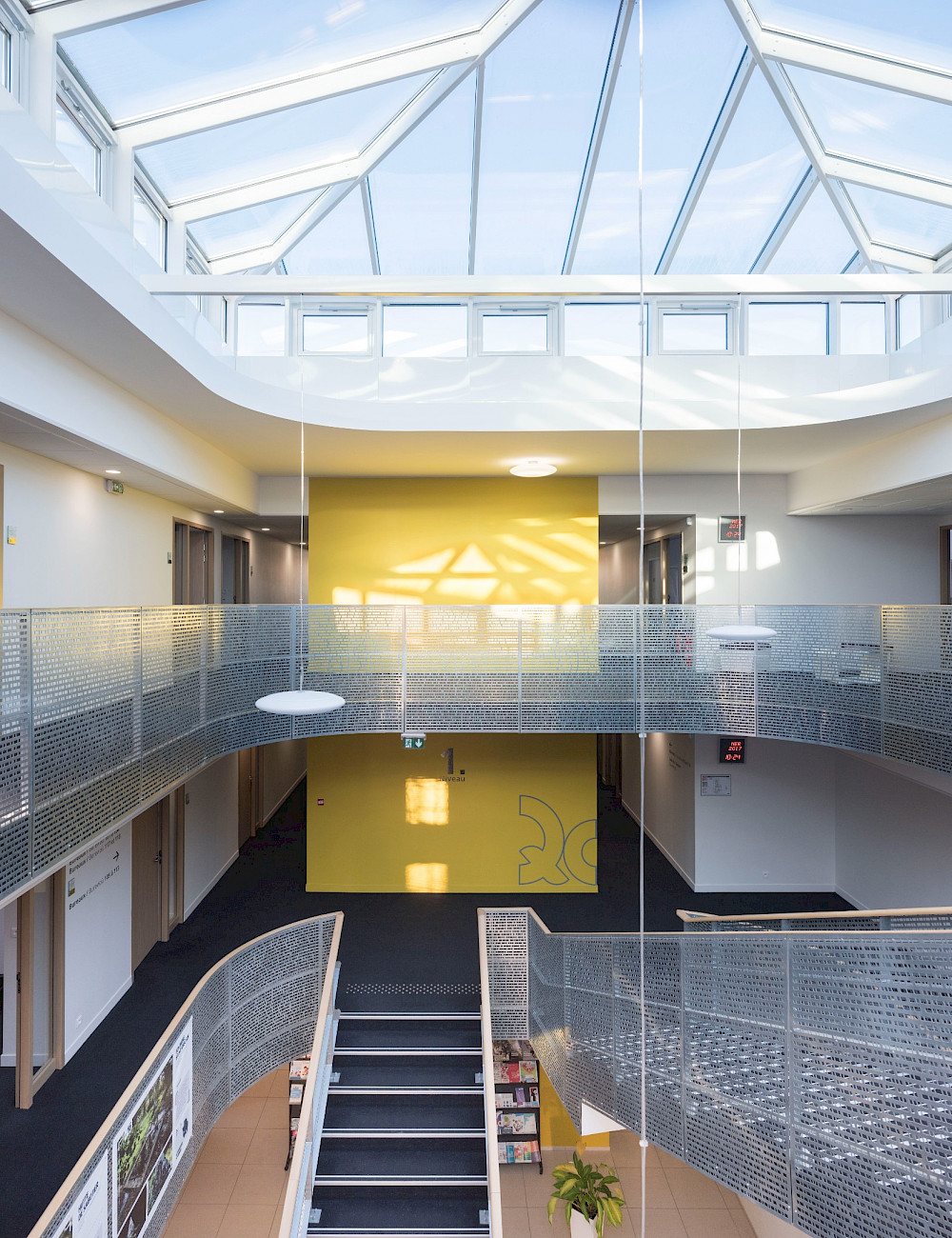 Le parti architectural de l’Hôtel de communauté de la COCOPAQ est celui d’un tri branche compact aux contours arrondis. Cette forme s’accroche d’une manière sensible aux éléments structurants du site et sa fluidité lui permet d’éviter toute frontalité écrasante, adossement ou effet de barrière. On y accède par son centre, dans un atrium généreux et baigné de lumière naturelle qui articule les fonctions d’accueil, d’attente et de logistique, distribue l’ensemble des circulations et abrite des espaces fluides et aérés, dédiés à la détente et aux rencontres informelles. La salle des conseils est littéralement traversée par le domaine public et constitue ainsi, à la manière d’une lanterne, un signal lisible à partir des voiries.