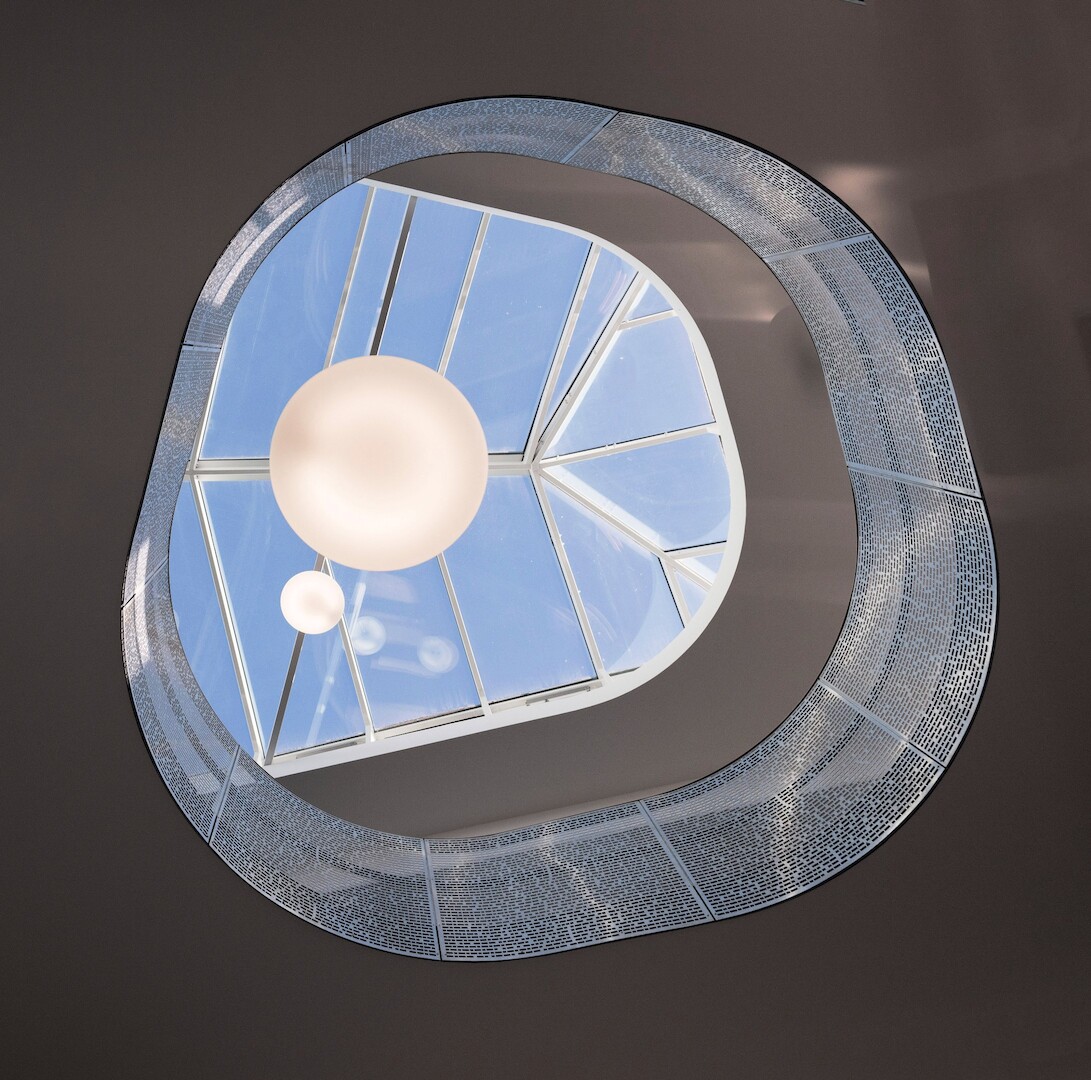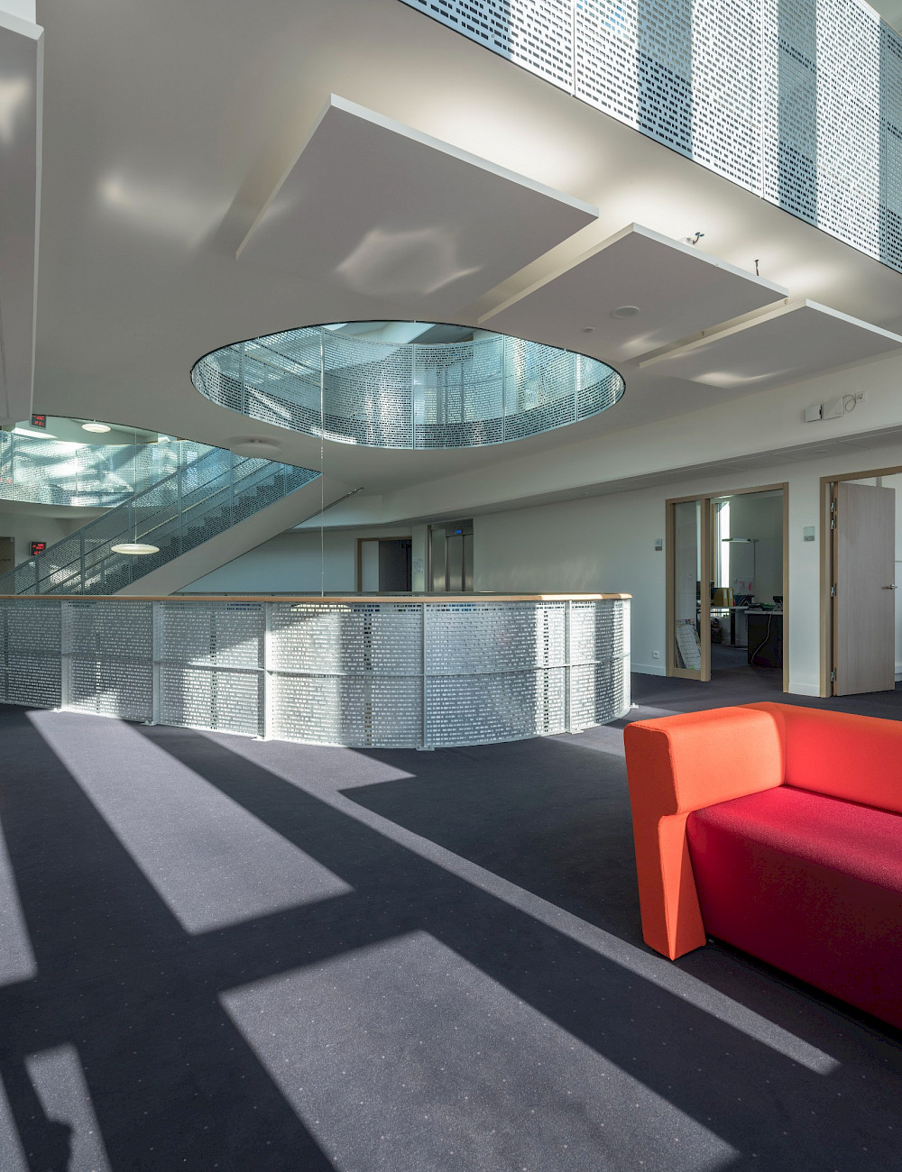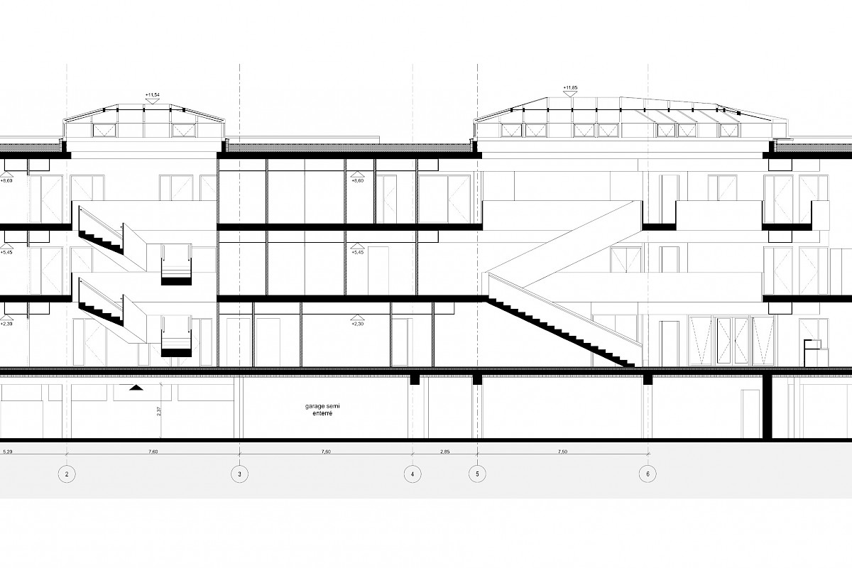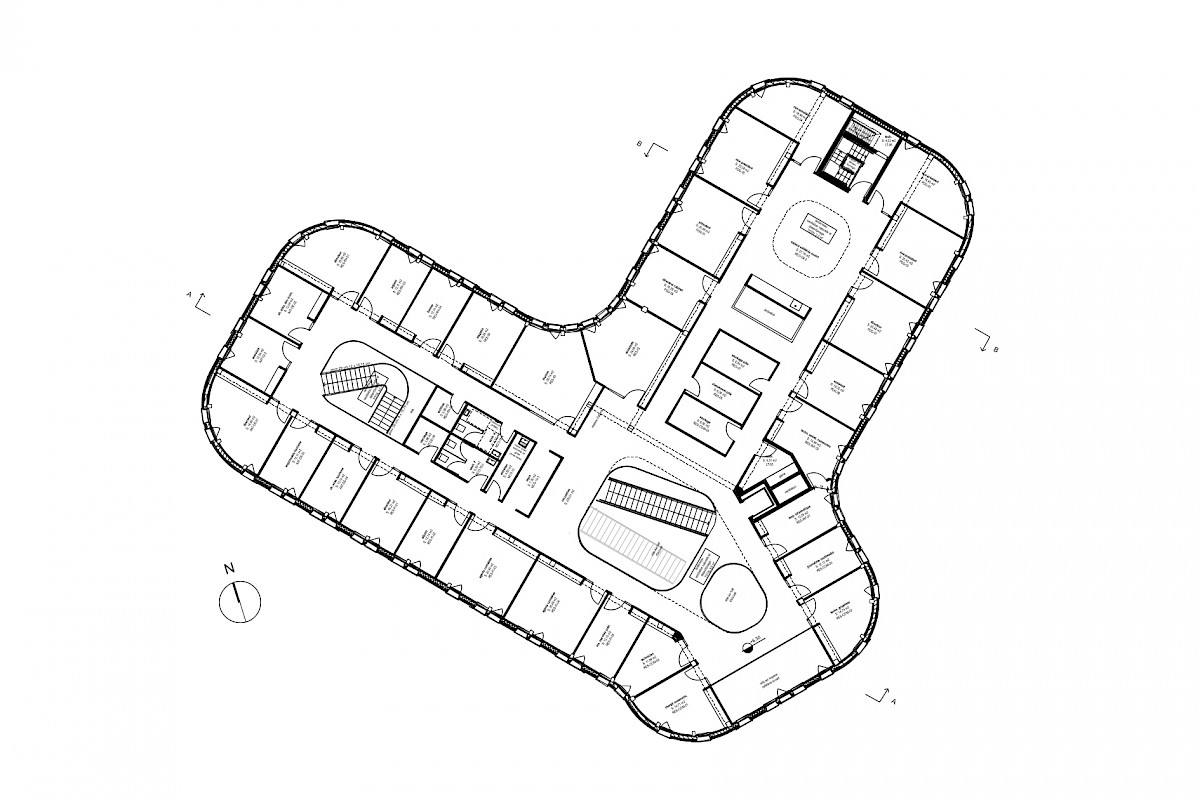 Le parti architectural de l’Hôtel de communauté de la COCOPAQ est celui d’un tri branche compact aux contours arrondis. Cette forme s’accroche d’une manière sensible aux éléments structurants du site et sa fluidité lui permet d’éviter toute frontalité écrasante, adossement ou effet de barrière. On y accède par son centre, dans un atrium généreux et baigné de lumière naturelle qui articule les fonctions d’accueil, d’attente et de logistique, distribue l’ensemble des circulations et abrite des espaces fluides et aérés, dédiés à la détente et aux rencontres informelles. La salle des conseils est littéralement traversée par le domaine public et constitue ainsi, à la manière d’une lanterne, un signal lisible à partir des voiries.
