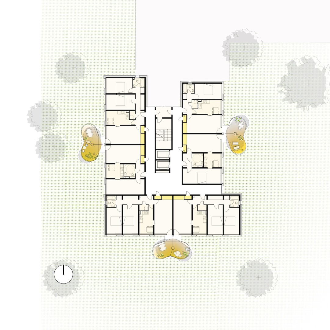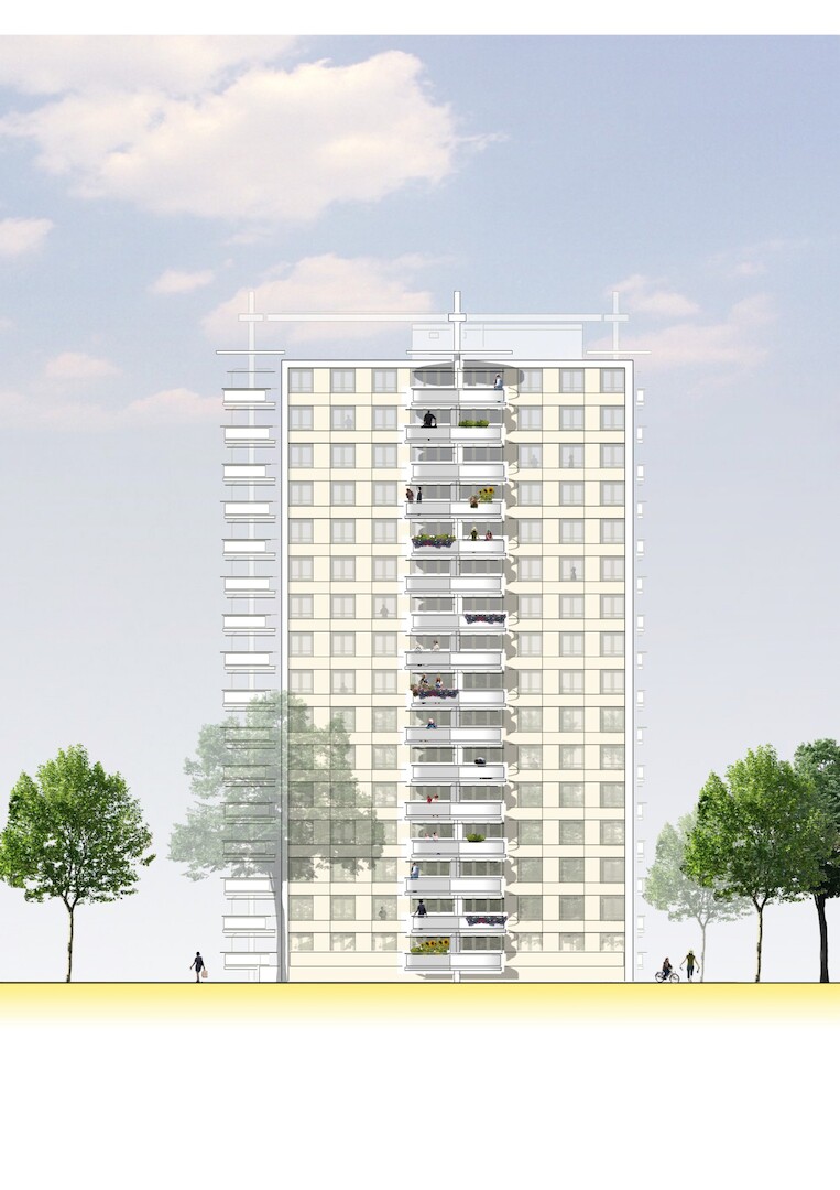 Les principaux avantages du bâtiment existant sont la rationalité et de sa structure et de ses plans, leur versatilité, ainsi que les vues extraordinaires sur le paysage qu’il offre. Ces avantages sont conservés et accentués de manière ciblée. Peu de modifications structurelles sont apportées, les logements sont ponctuellement adaptés aux personnes à mobilité réduite et la maintenance du bâtiment est simplifiée. Le concept d’optimisation énergétique se base principalement sur la désolidarisation des balcons qui rend possible une isolation performante et continue en profitant du volume compact de l’existant et en évitant des détails compliqués et couteux. Le standard passif peut ainsi être atteint de manière rationnelle.