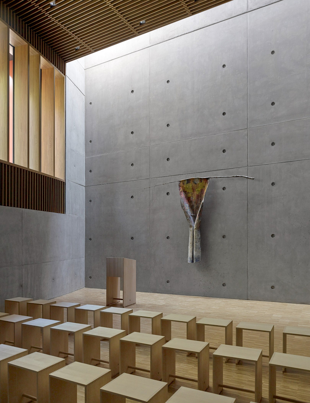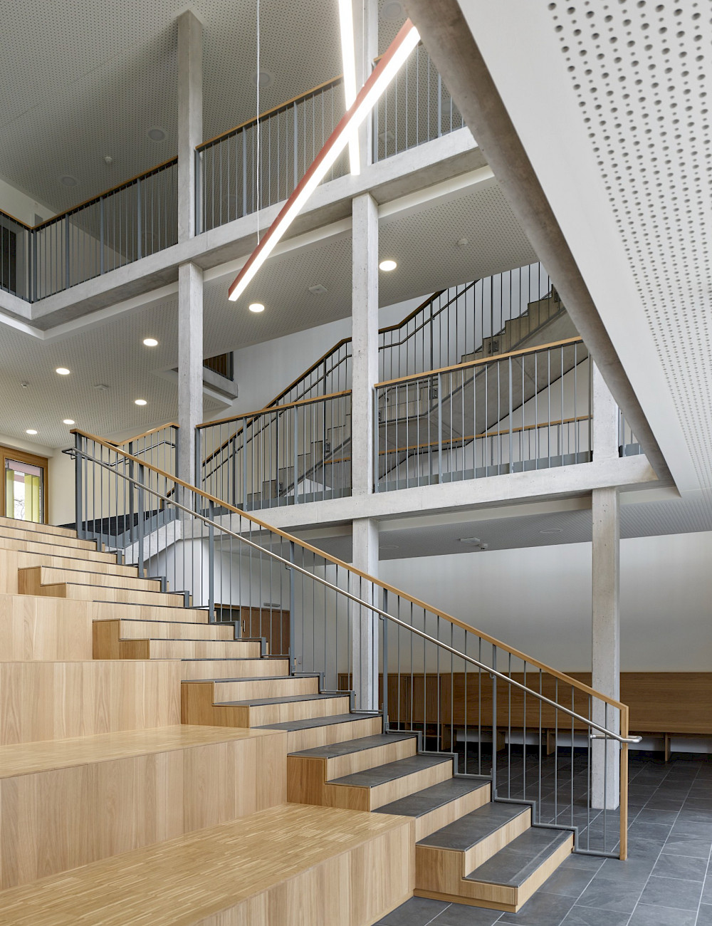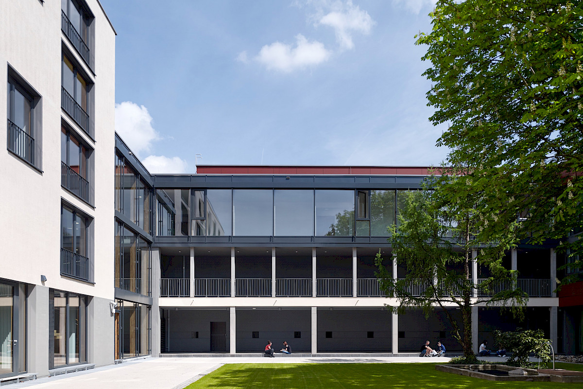 Un hall d’entrée généreux lie foyer d’élèves, école et extension. Ce sont les maniements contrôlés de la lumière naturelle qui donnent aux intérieurs leurs expressivités spécifiques: Le hall est accolé à la cour par une façade vitrée, la chapelle est façonnée par la lumière indirecte et filtrée, les salles de classe reçoivent leur luminosité de type atelier par des fenêtres de tous les côtés. Dans la façade, le nouveau bâtiment se distingue volontairement de ses voisins résidentiels par la colorisation vive du rez-de-chaussée.