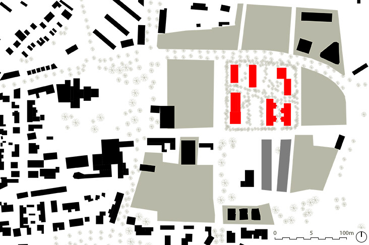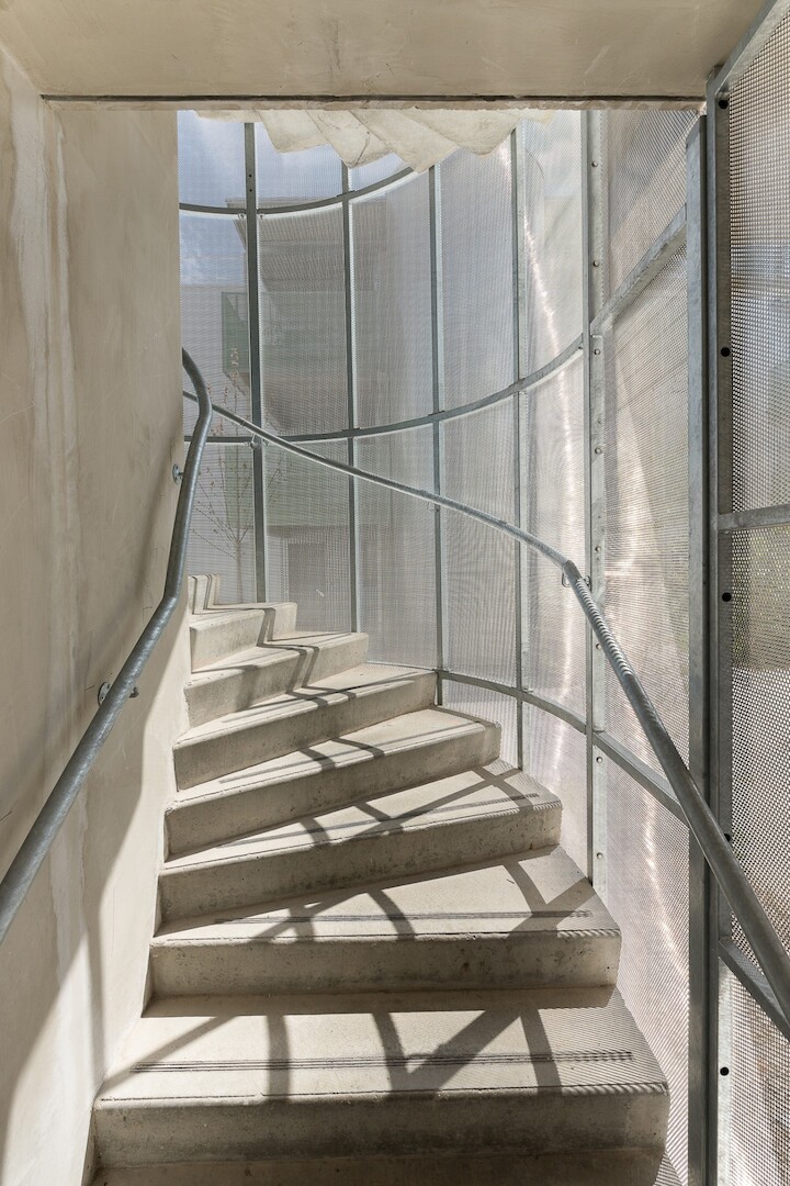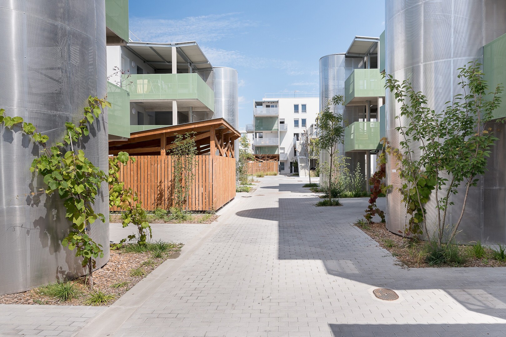 Les bâtiments sont implantés nord-sud pour séquencer la perception du projet depuis les rues limitrophes et ménager des vues sur le parc. Le cadre bâti présente 2 typologies élémentaires, la rangée en R+2 avec dessertes extérieures et le plot R+4 avec dessertes intérieures. Ces deux typologies sont complémentaires en ce que le volume important des plots et la densité de surface habitable ponctuelle supérieure qu’il supporte rend possible une diminution du gabarit à R+2 sur la majeure partie de la parcelle tout en libérant de vastes espaces extérieurs appropriables. L’opération est séparée en 4 copropriétés distinctes composées chacune de 24 logements tous traversants ou bi-orientés et d’un local commun (logement invités, atelier, buanderie, pièce de fête…). Deux d’entre elles comprennent 4 bâtiments R+2 vis-à-vis, les logements qu’elles abritent s’accèdent de l’extérieur via des perrons privatifs, les deux autres sont composées d’un bâtiment R+2 jumelées à un plot chacune.