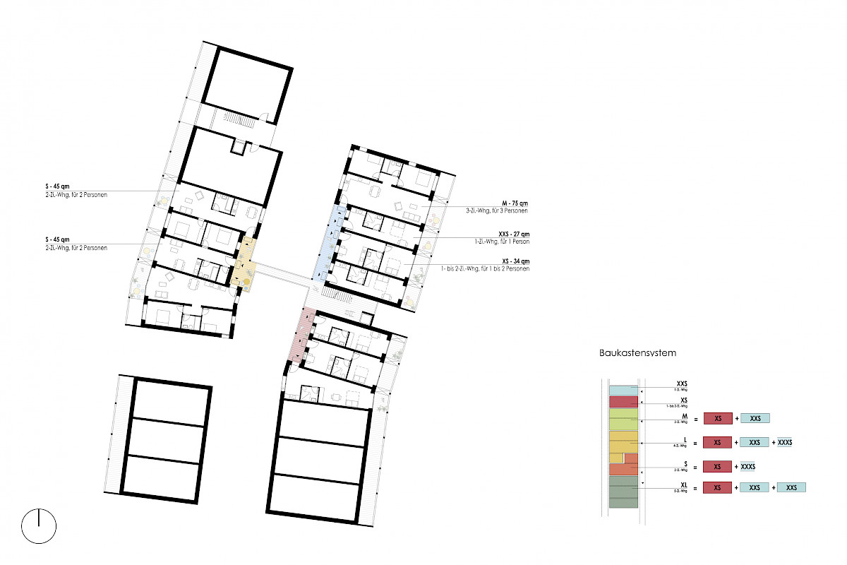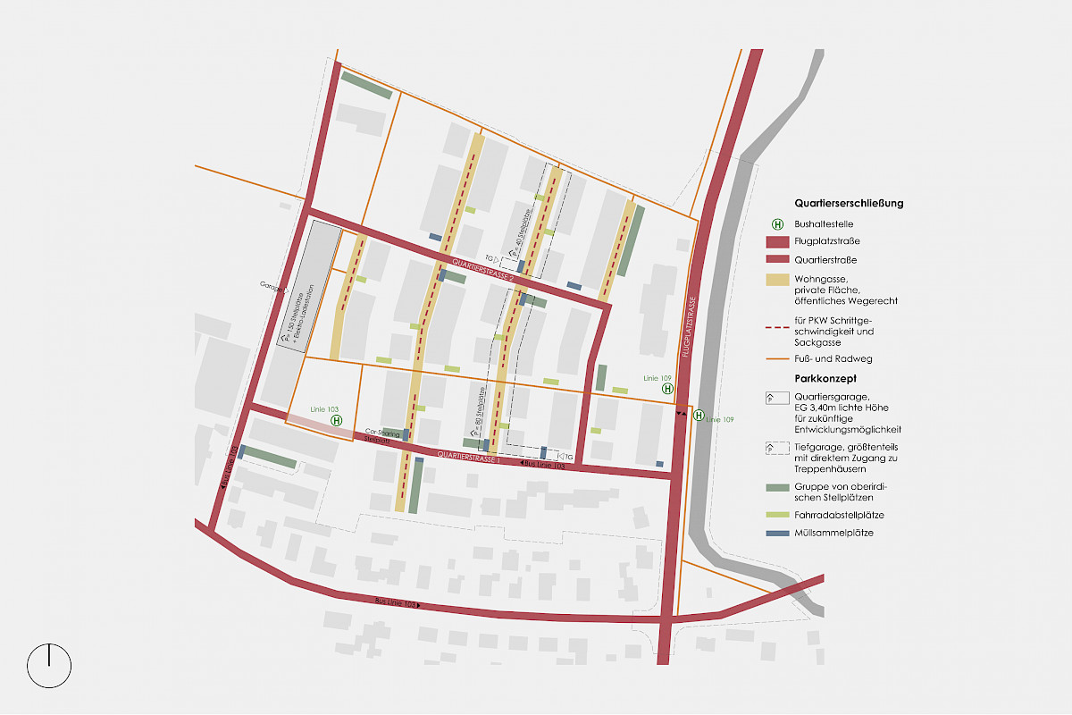 Leitidee des Entwurfskonzepts ist es, eine kompakte Siedlungsstruktur zu schaffen, die nicht nur Landschaftsreserven schont und Erschließungskosten optimiert, sondern mit der baulichen Dichte auch eine atmosphärische Verdichtung herstellt: Der öffentliche und halböffentliche Raum, insbesondere die Wohngassen, über die beidseitig die Hauszeilen erschlossen werden, sind als Orte der Begegnung und informellen Kommunikation gedacht, die das nachbarschaftliche Miteinander unterstützen.