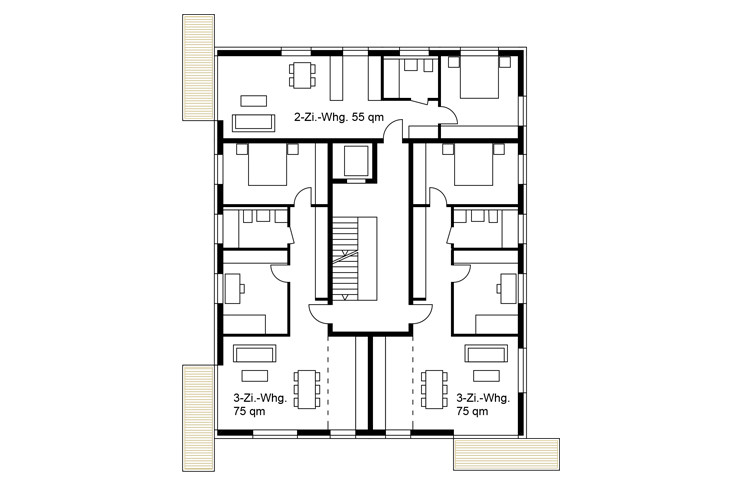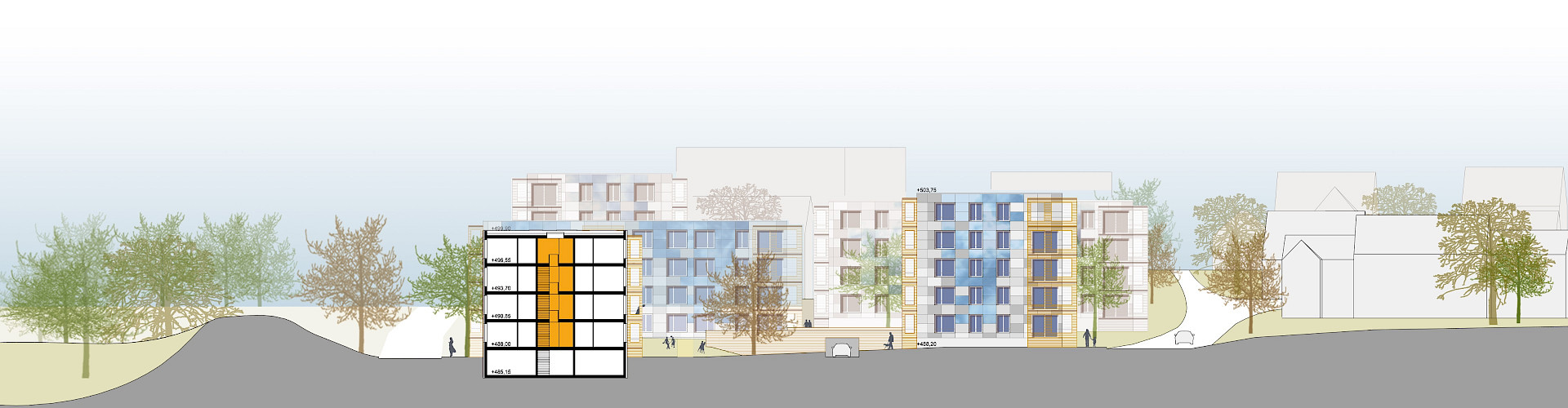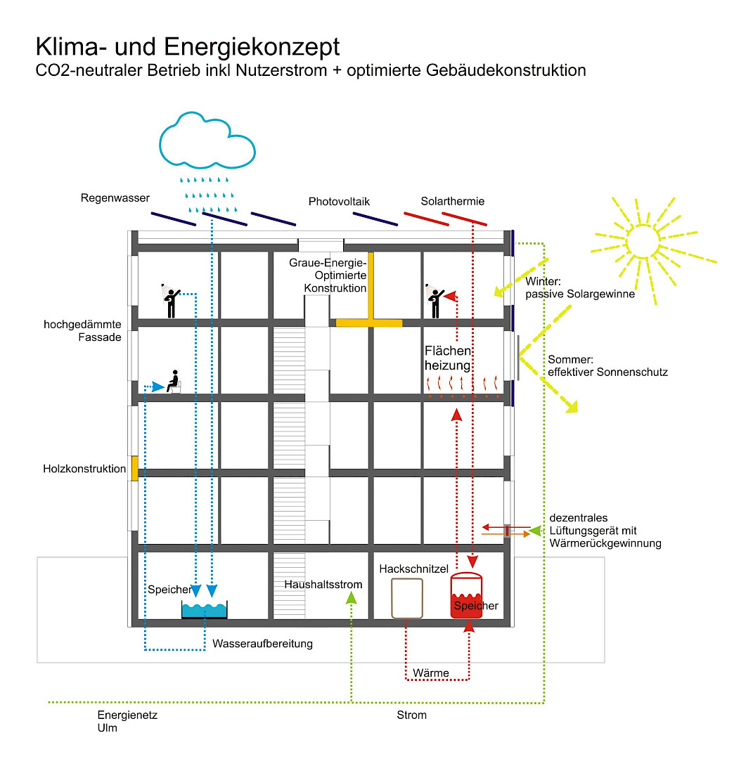 L’objectif d’un quartier à zéro émission de CO2 pose un défi majeur, surtout lorsqu’il se superpose à celui de construire à faibles coûts. Dans la mesure où une offre diversifiée pouvant répondre aux besoins de futurs usagers est souhaitée, trois types d’habitation sont proposés. Chacun présente une grande compacité permettant de rationnaliser les développés de façade et ainsi, de minimiser les surfaces de déperdition de chaleur, les coûts d’investissement, de maintenance et de fonctionnement, ainsi que le bilan CO2. Le concept énergétique englobe les questions de l’énergie grise, de la réduction des déplacements de sol, de l’efficacité structurelle, de la gestion des eaux (pluviales et grises) et des énergies renouvelables.