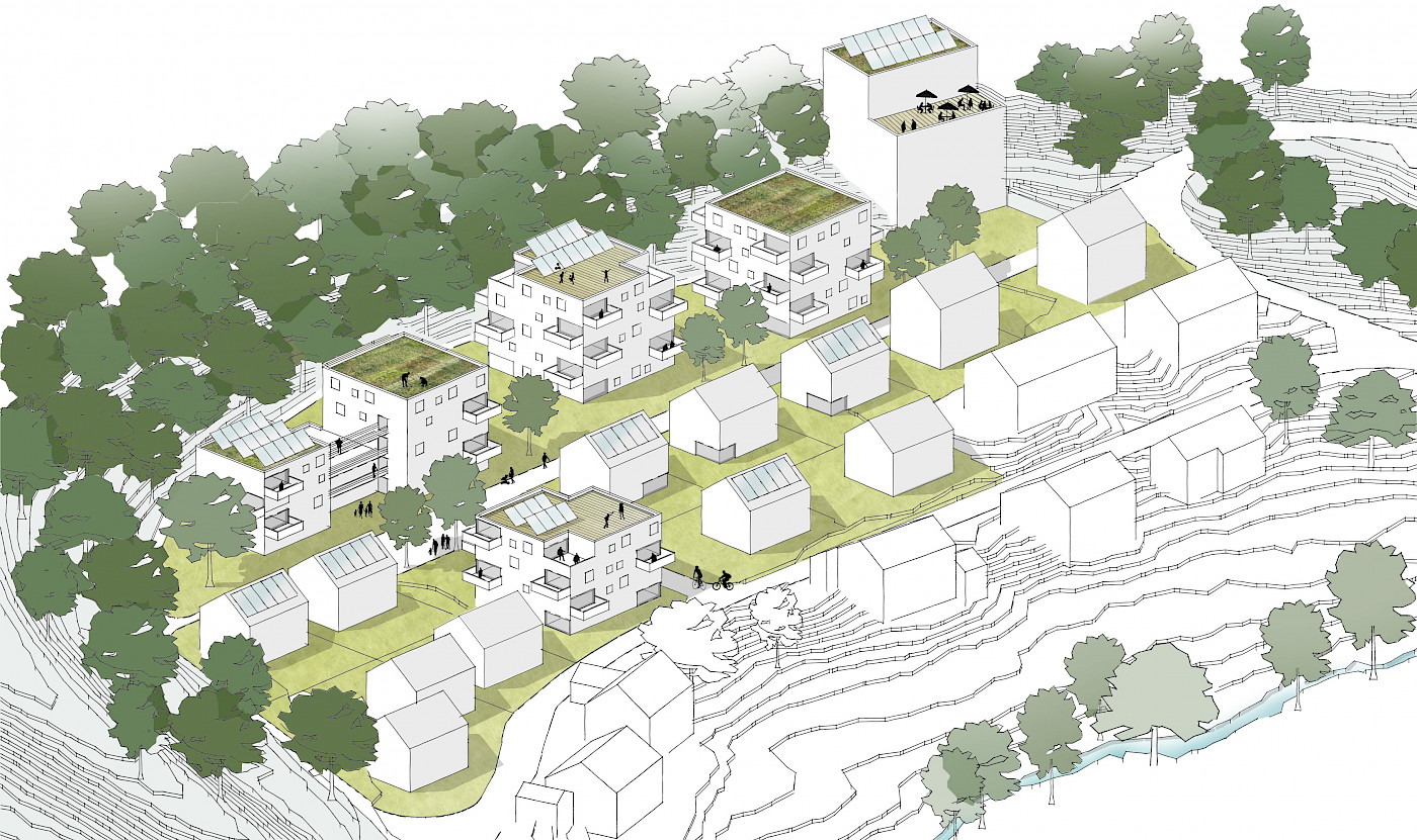 À l‘orée de la forêt émerge un quartier vivant et convivial, présentant une large mixité de formes et de modes d‘habitat. La disposition des bâtiments vise à maximiser, pour chacun d‘entre eux, l‘ensoleillement, la ventilation naturelle et les vues sur le paysage.