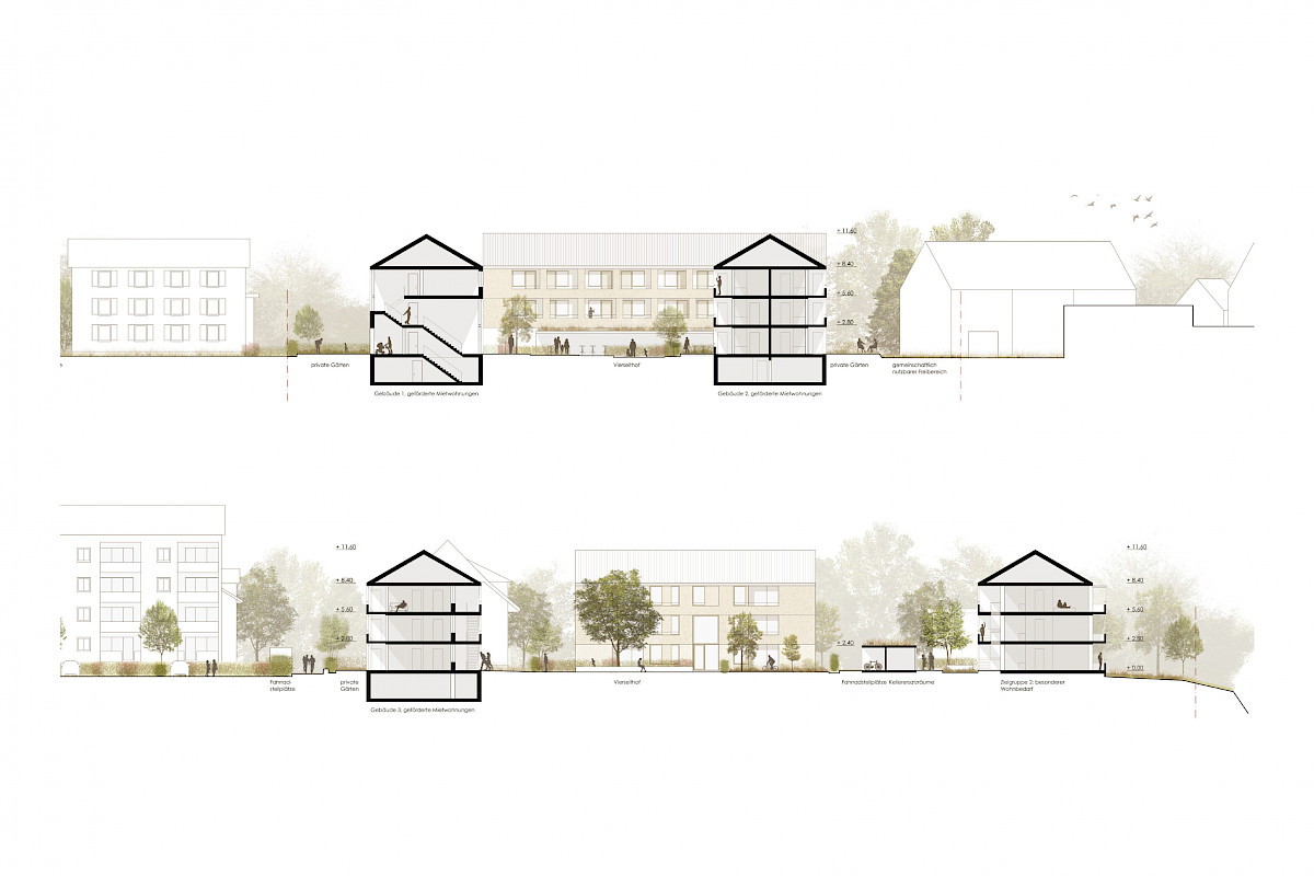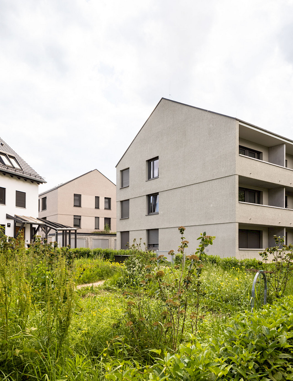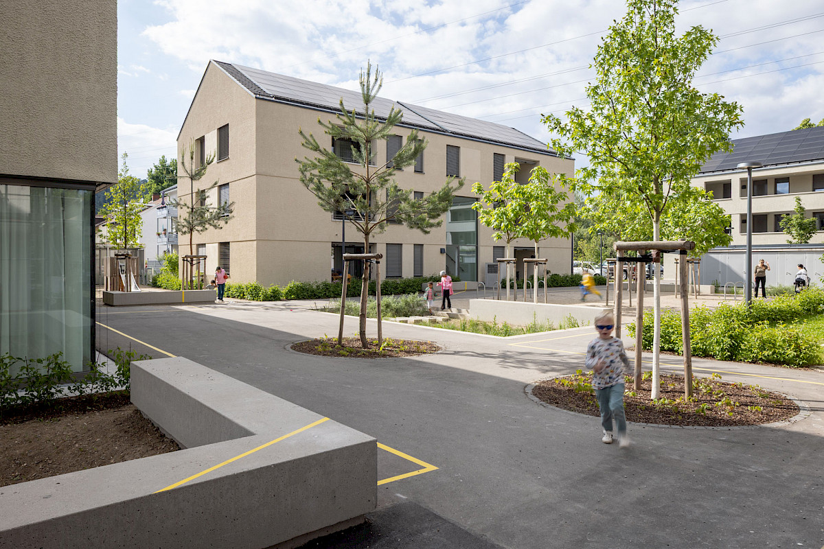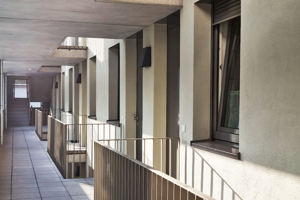 Cinq bâtiments neufs accueillant des logements sociaux se glissent dans le contexte des années 1950 et reprennent les alignements retrouvés dans le tissu existant tout en formant une placette pour la rencontre des riverains.