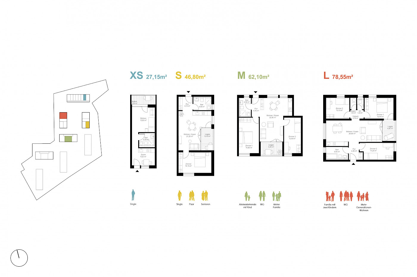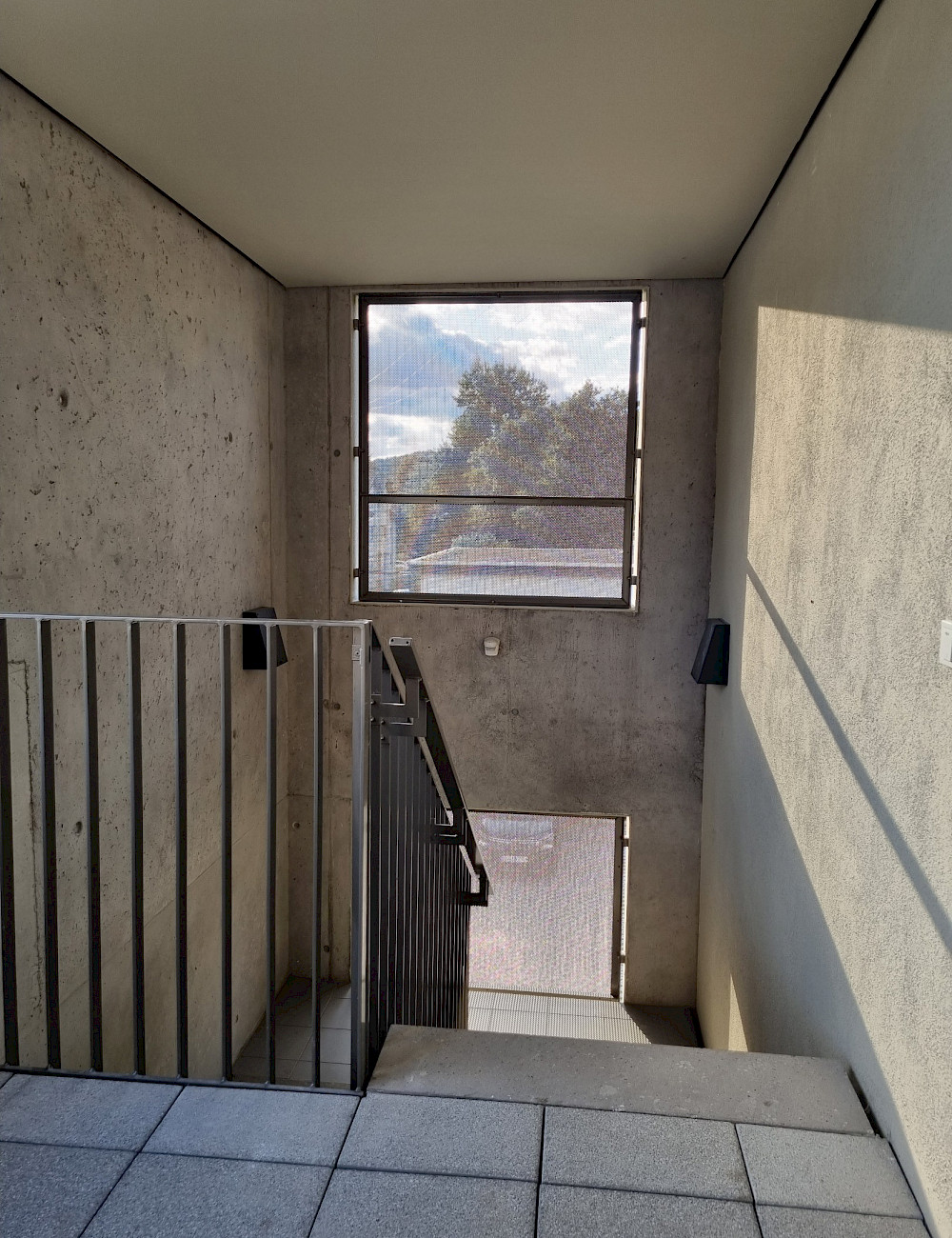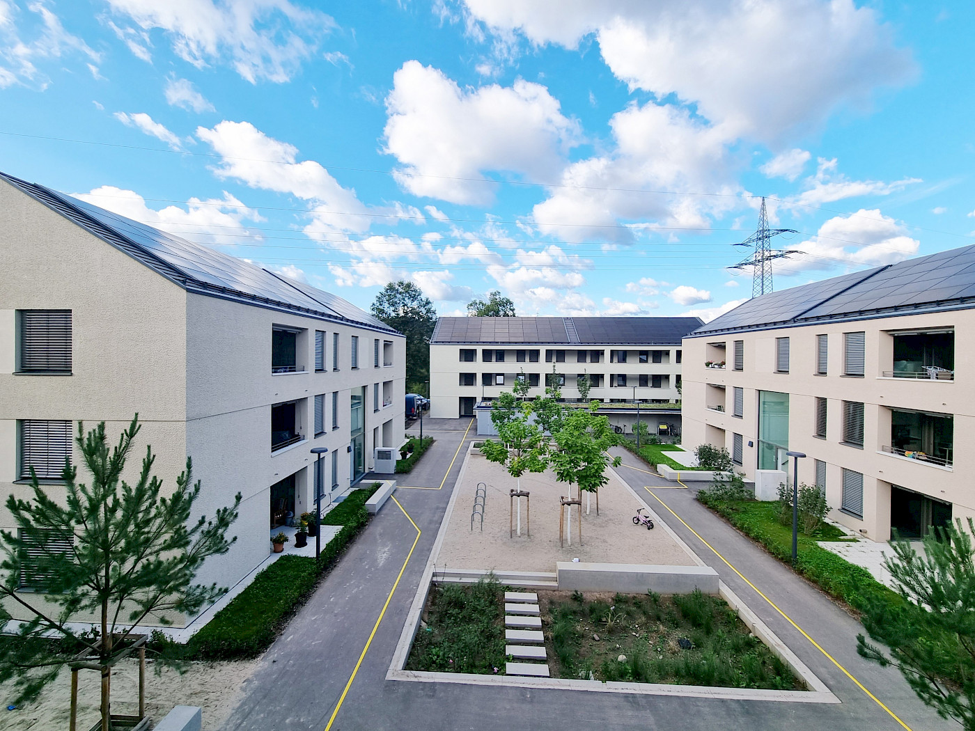 Cinq bâtiments neufs accueillant des logements sociaux se glissent dans le contexte des années 1950 et reprennent les alignements retrouvés dans le tissu existant tout en formant une placette pour la rencontre des riverains.